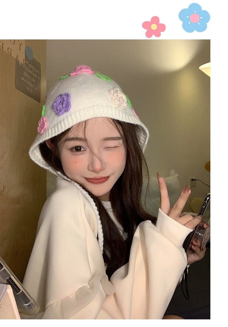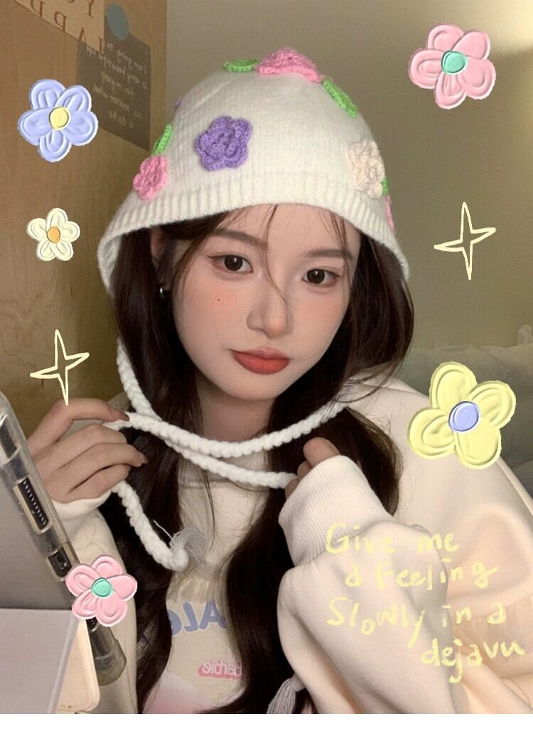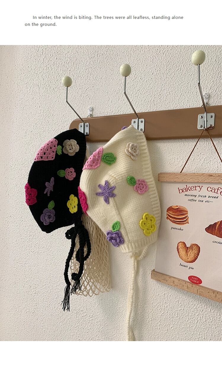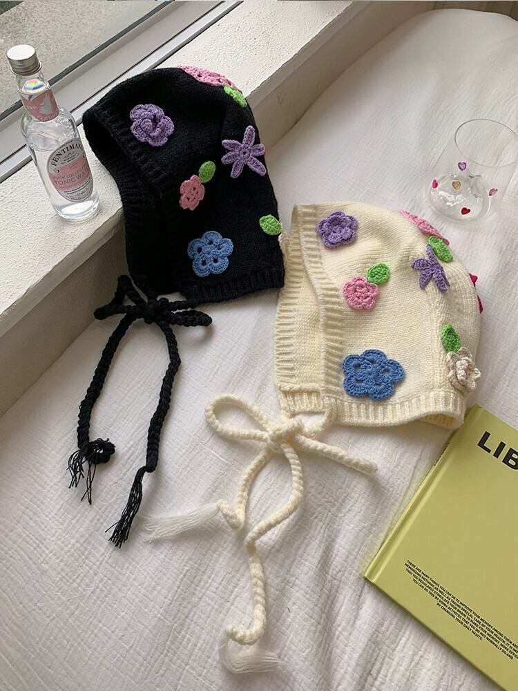 甘くてかわいい手作りフラワービーニーニッチデザイン包頭ニット帽子耳保護スカーフ帽子防寒帽子女性秋と冬 大人ガーリー スウィート キュート カジュアル オータム 秋物 ウィンター 冬物 フラワーデザイン 15dd18250830164