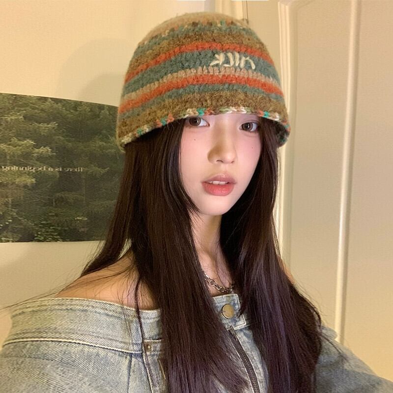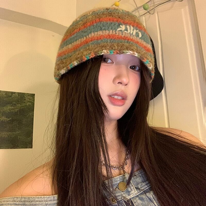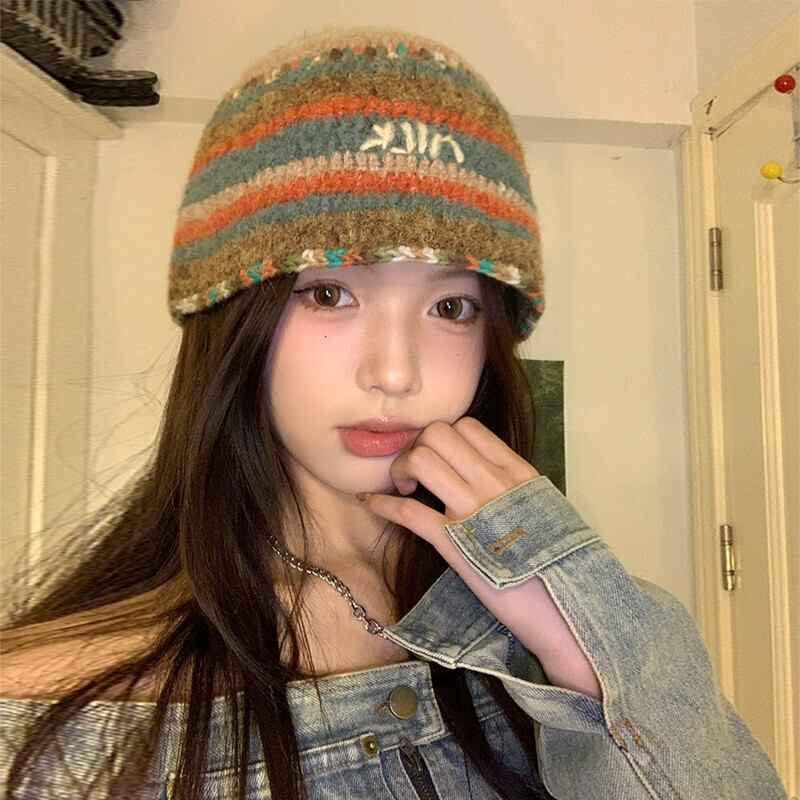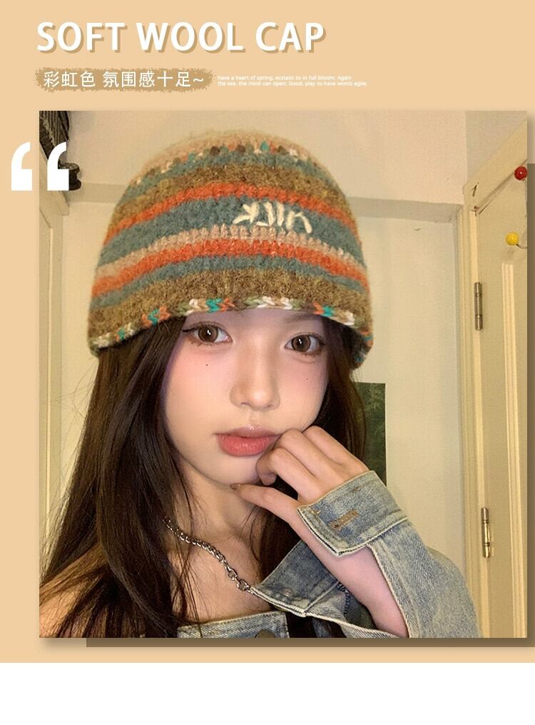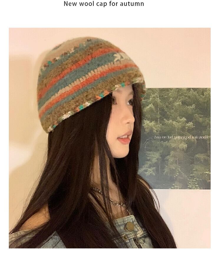 ドーパミンコントラストストライプニット漁師帽子女性の秋と冬のレトロ盆地帽子ニッチファッションスリムウール帽子 オータム 秋物 ウィンター 冬物 15dd23444542763