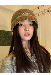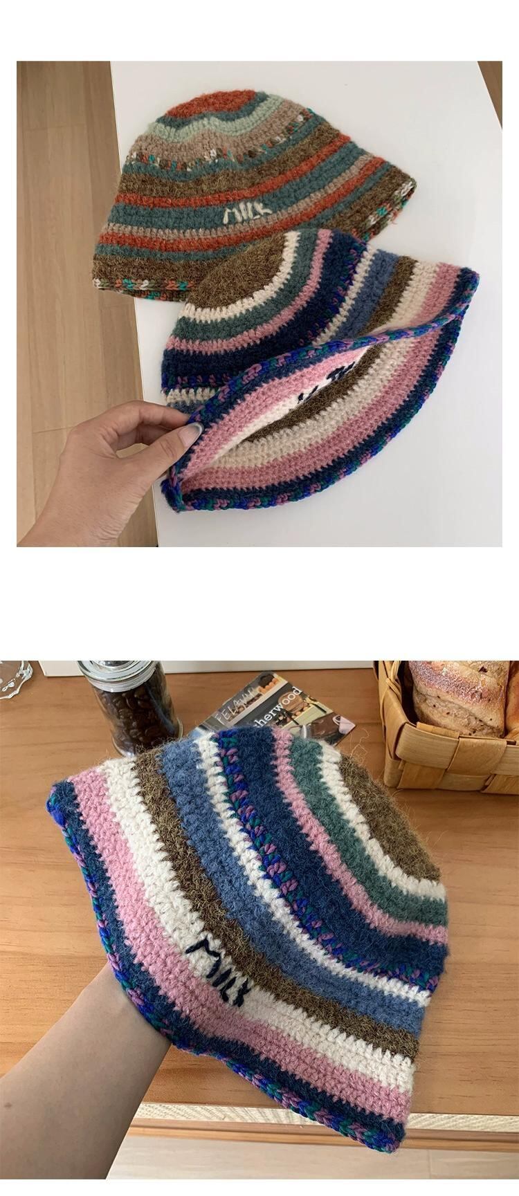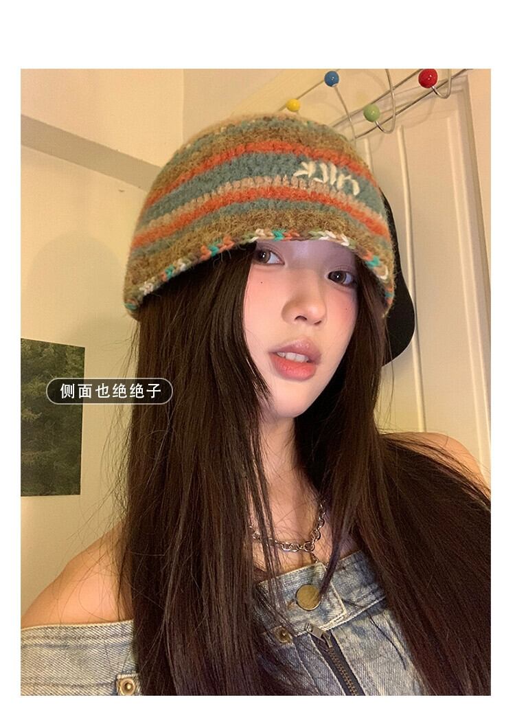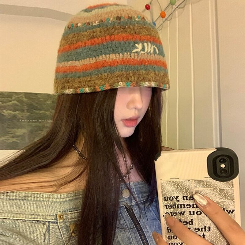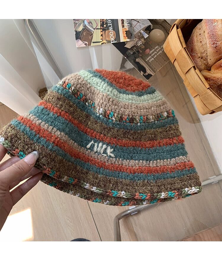 ドーパミンコントラストストライプニット漁師帽子女性の秋と冬のレトロ盆地帽子ニッチファッションスリムウール帽子 オータム 秋物 ウィンター 冬物 15dd23444542763