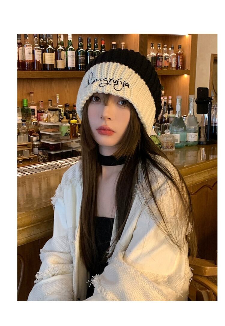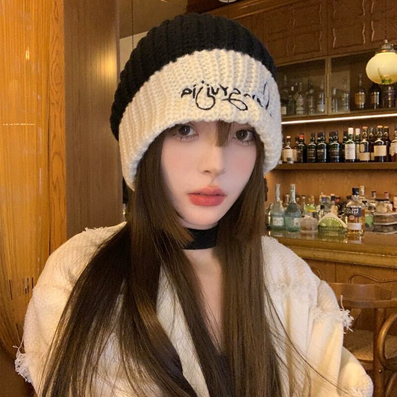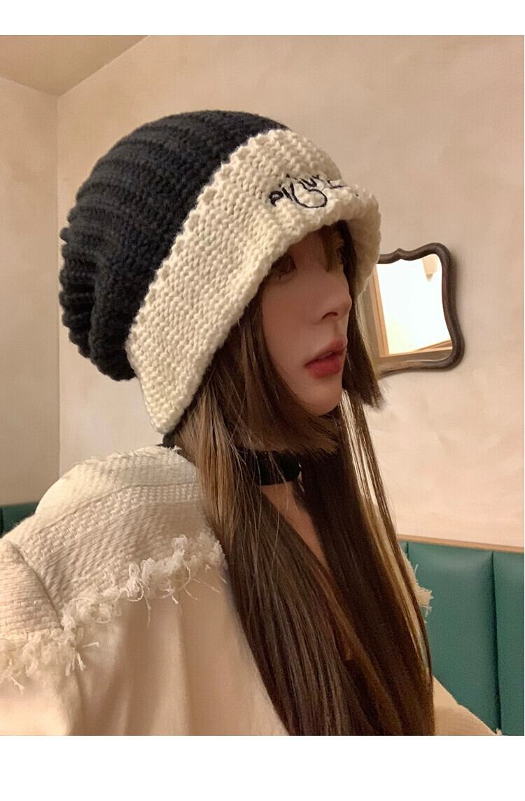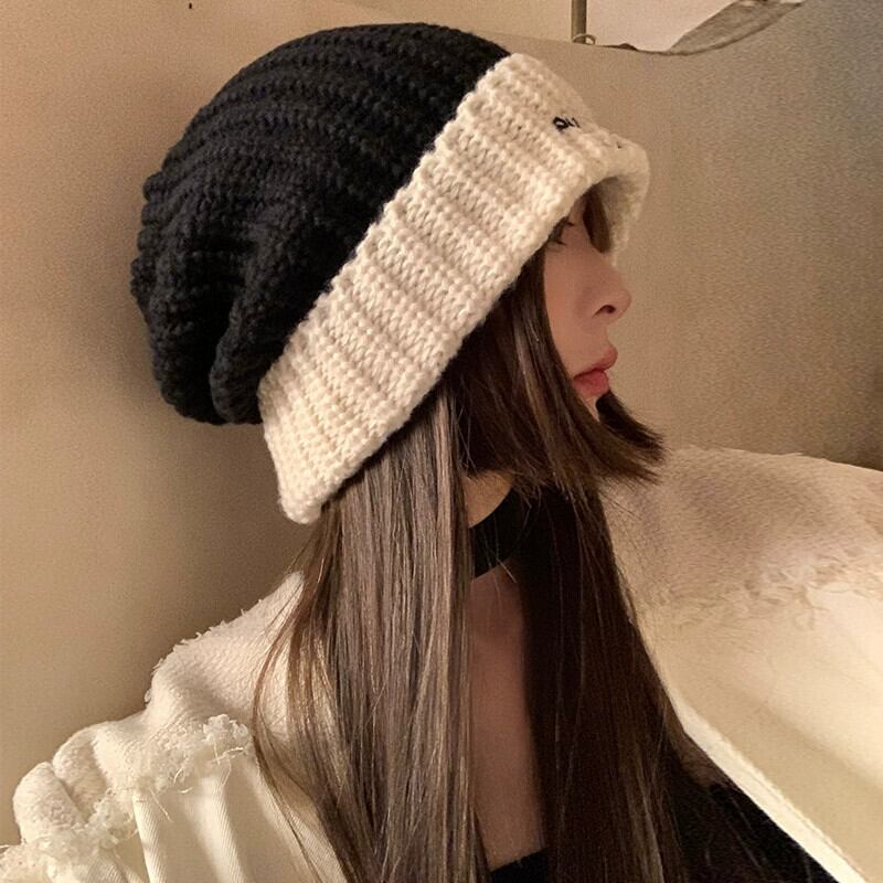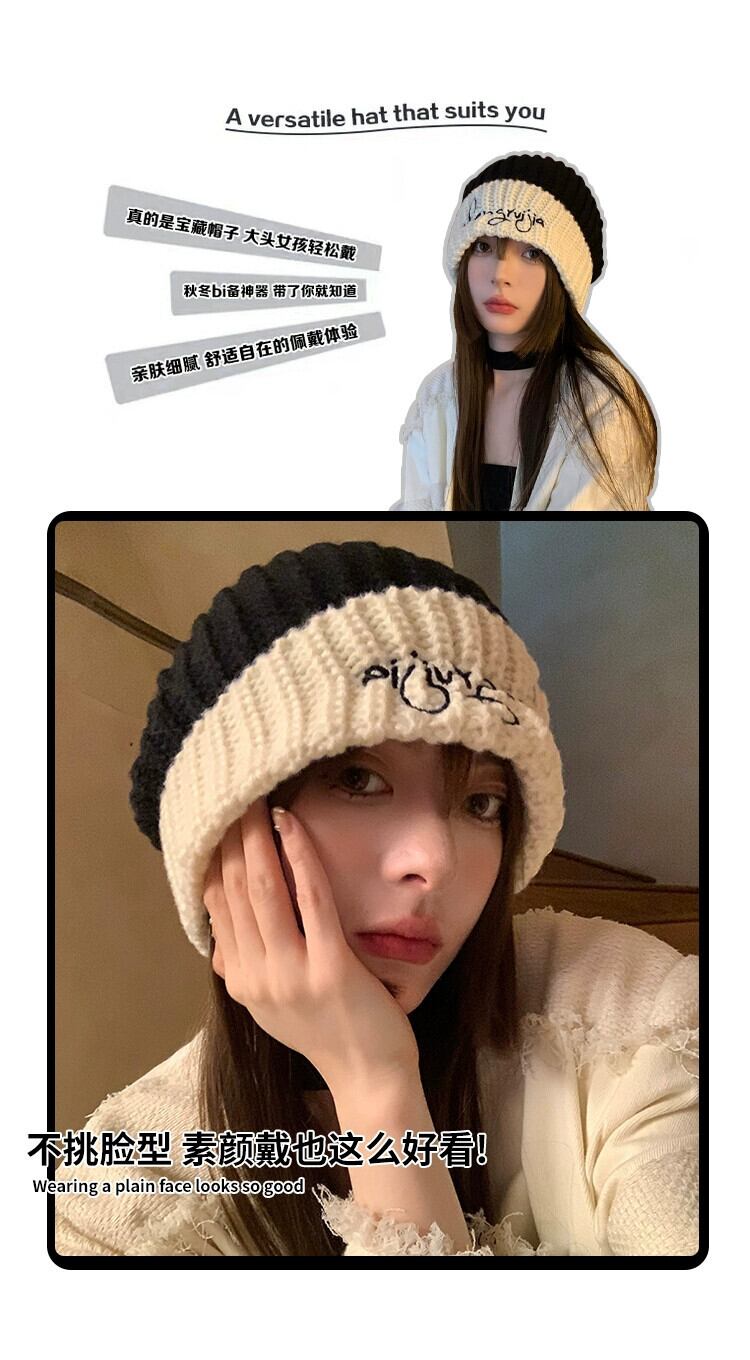秋と冬のスタイルのクールなウールの帽子の女性の大きな頭囲のゆるいニットパイル帽子、顔が見える小さな暖かい耳の保護帽子 オータム 秋物 ウィンター 冬物 15dd73071647840