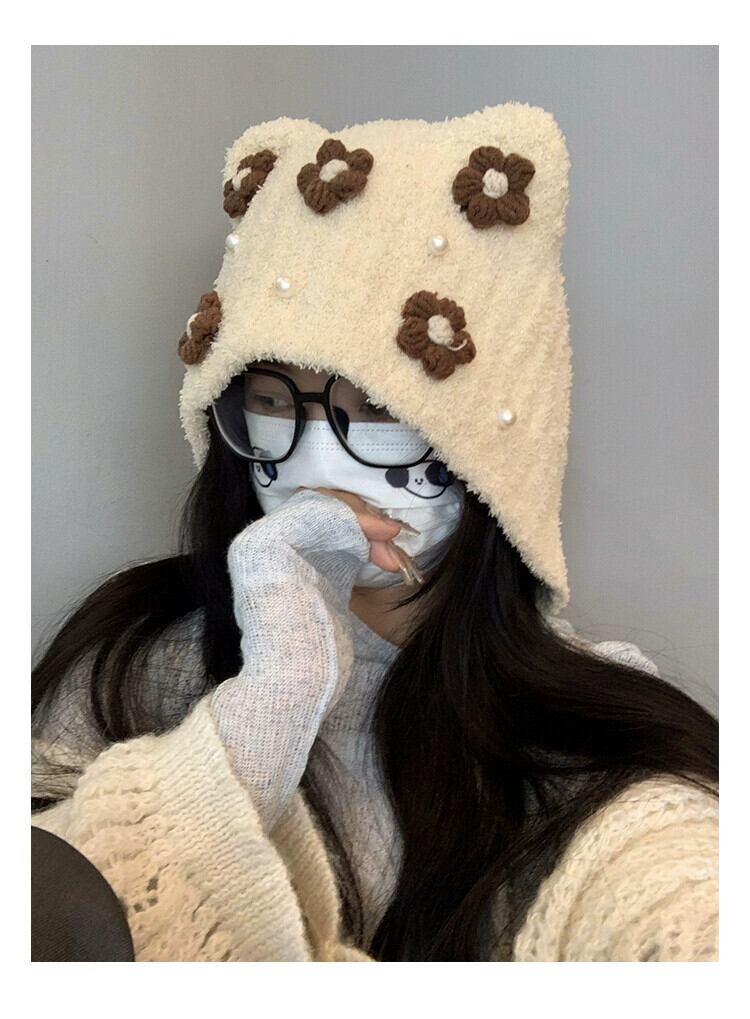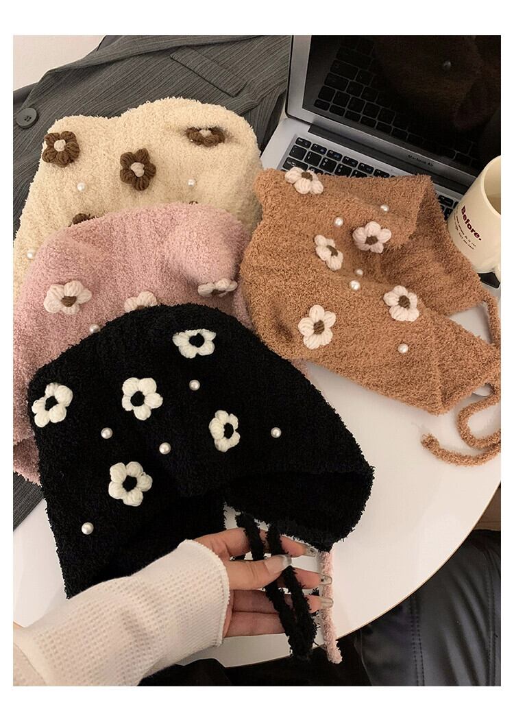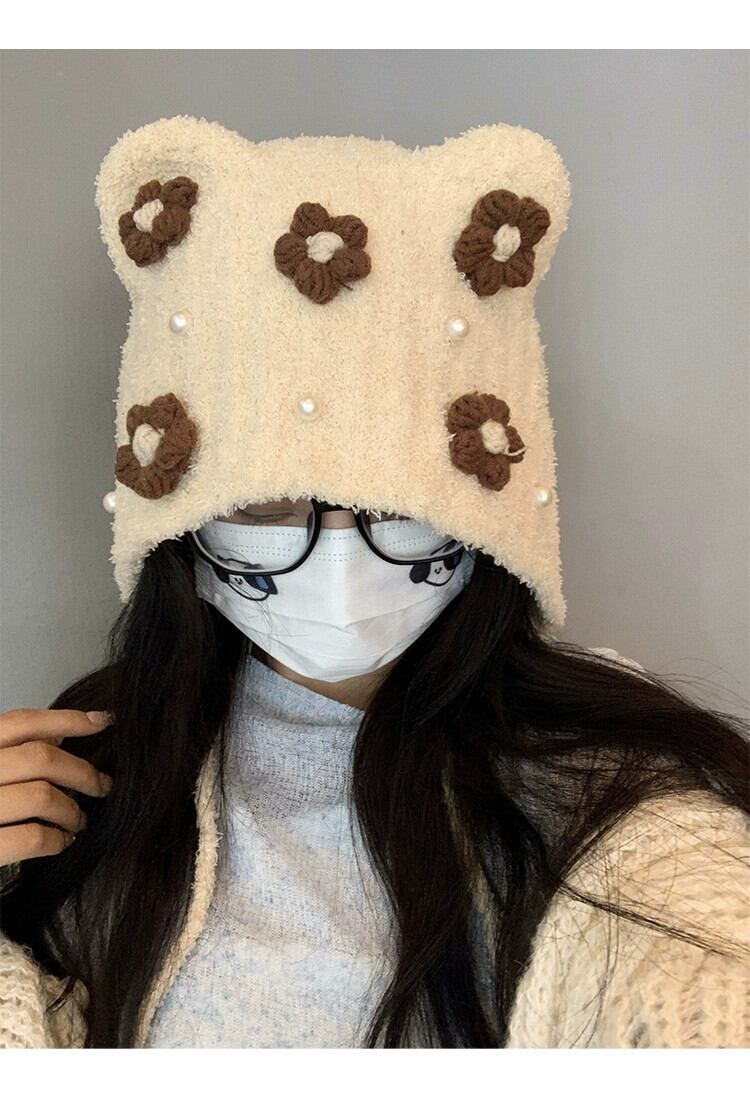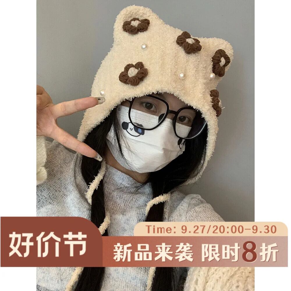 2023 ぬいぐるみ帽子女性の秋と冬のクマの耳保護ニット帽子多用途甘くてかわいい花ウール帽子 大人ガーリー スウィート キュート カジュアル オータム 秋物 ウィンター 冬物 フラワーデザイン 15dd48549969664