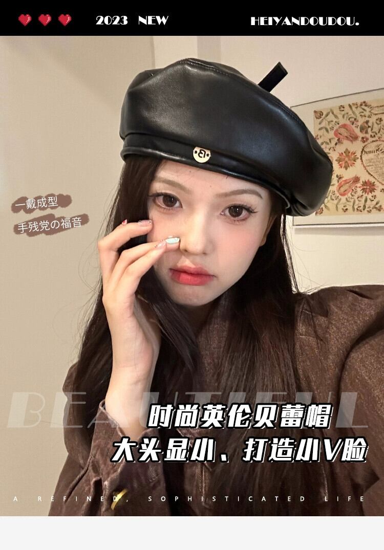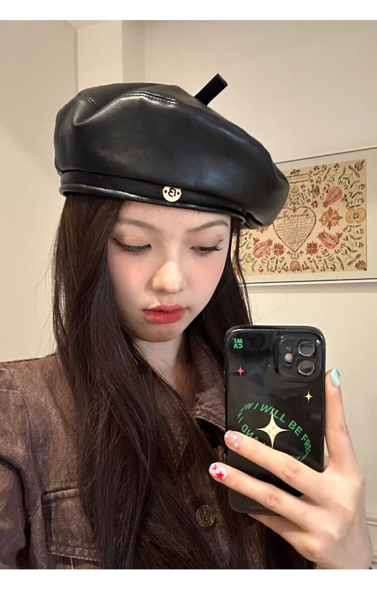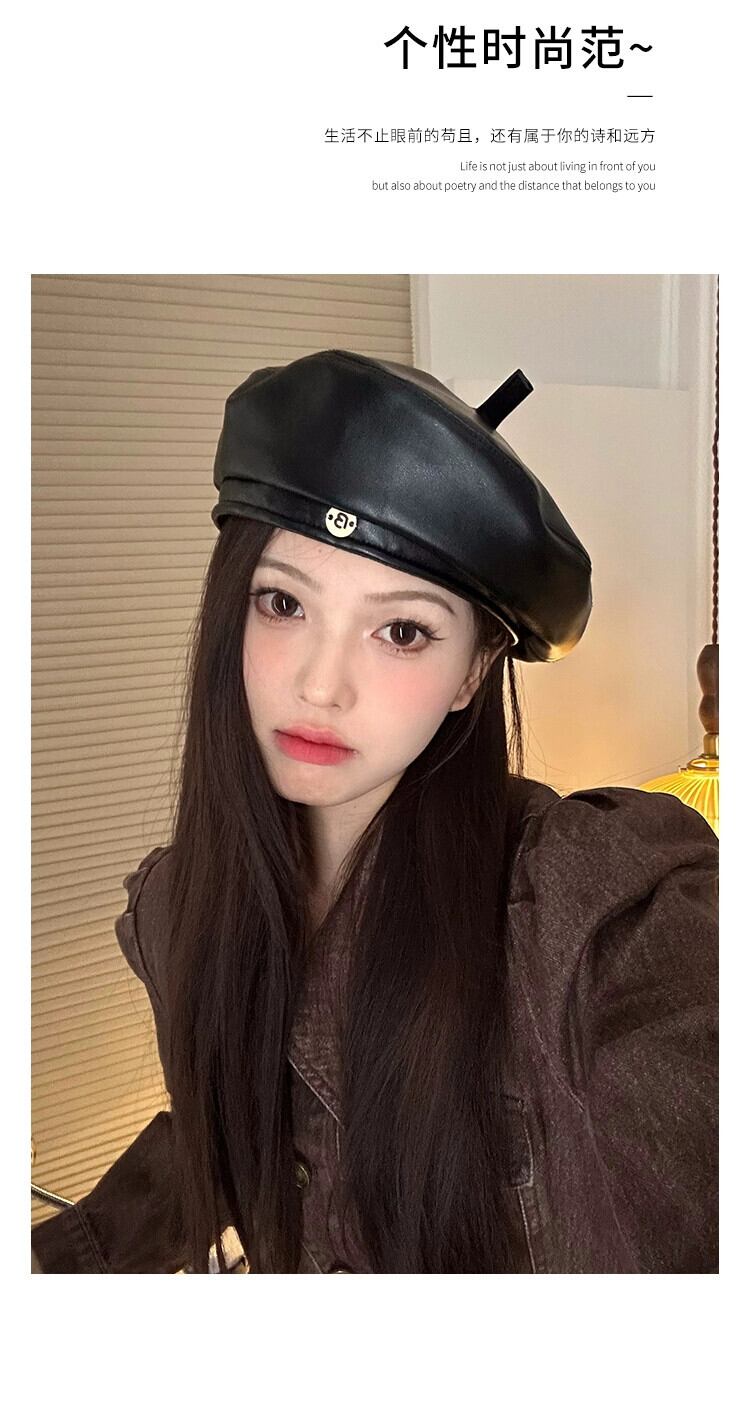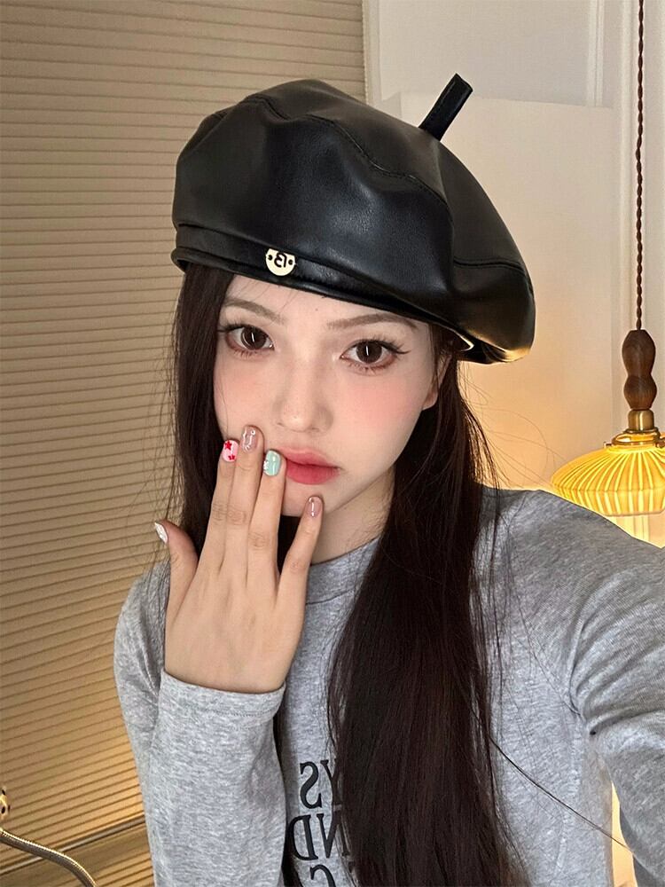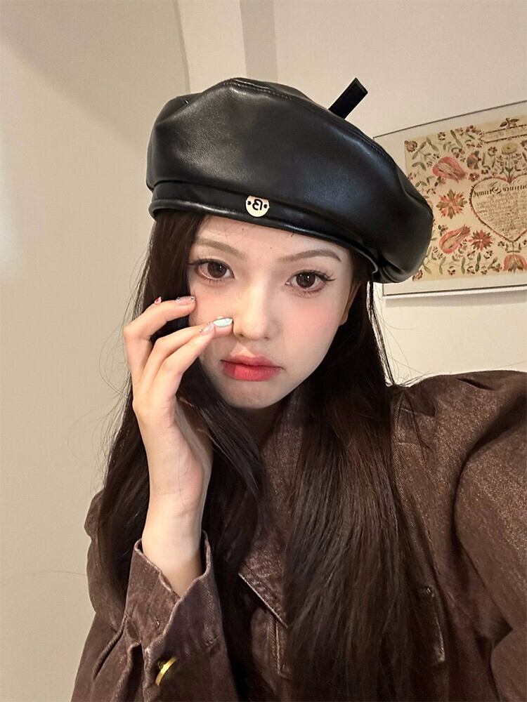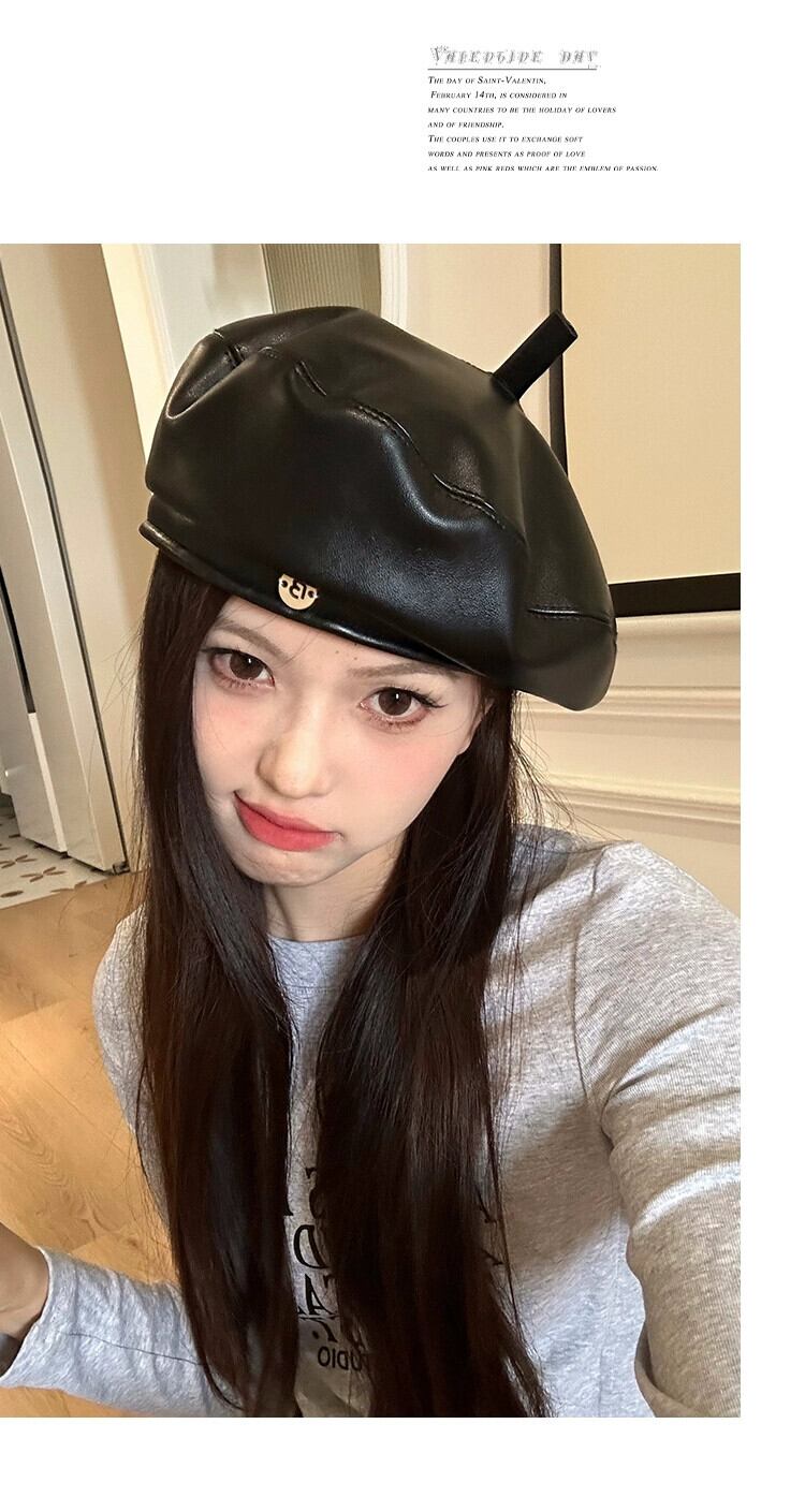 良い帽子タイプの高級質感PUレザーベレー帽レディース秋冬新スタイル甘くてクールな万能リトルペインターハットブラック 大人ガーリー スウィート キュート カジュアル オータム 秋物 ウィンター 冬物 ベレット ヘアアクセサリー 15dd29741450469