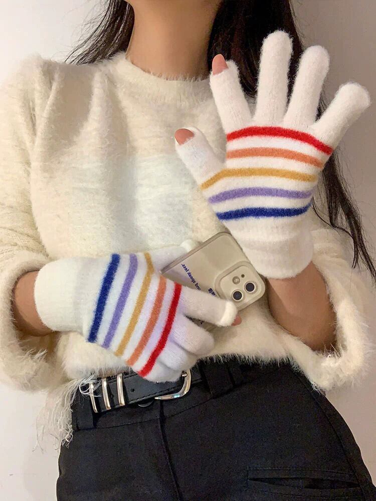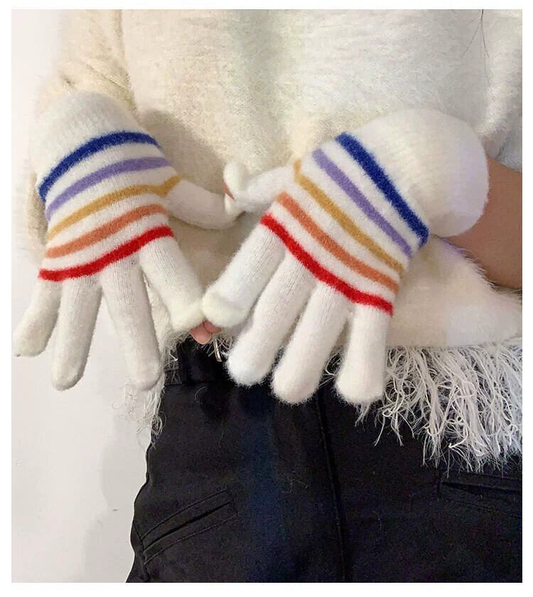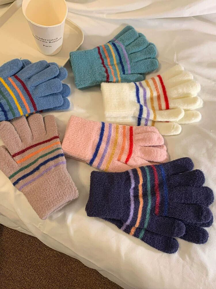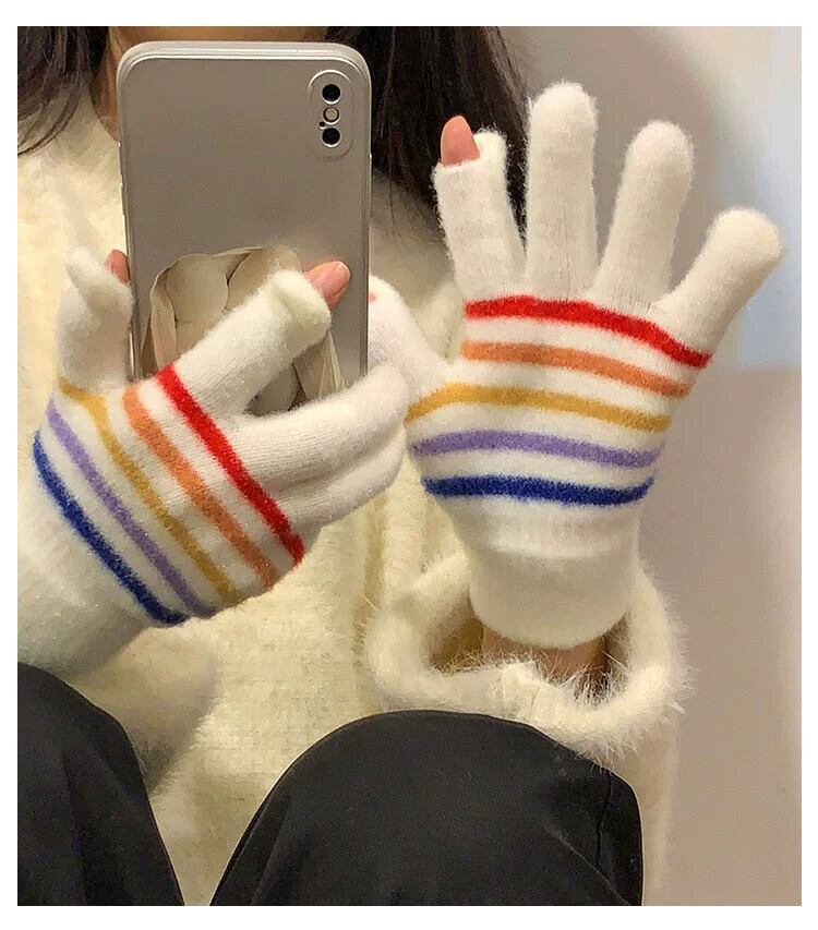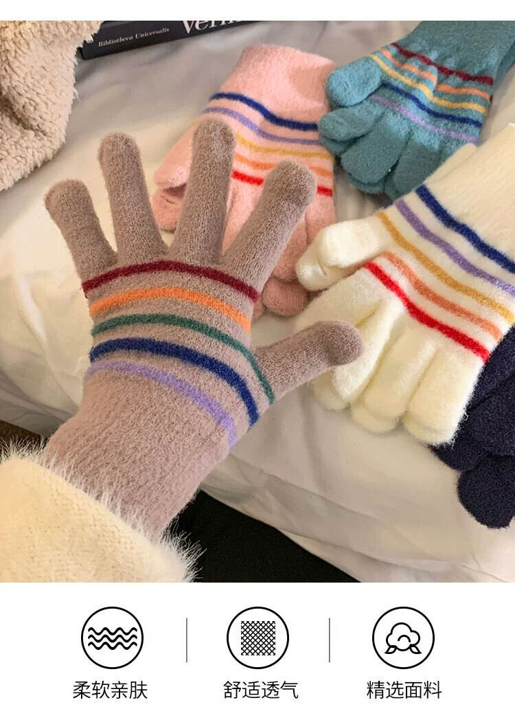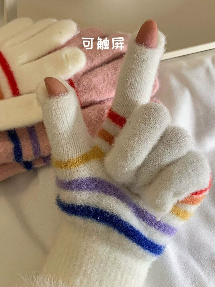 かわいい携帯電話タッチスクリーン手袋女性豪華なレインボーストライプ冬防寒性と暖かいサイクリング 5 本指手袋 大人ガーリー スウィート キュート カジュアル ウィンター 冬物 15dd99269650819