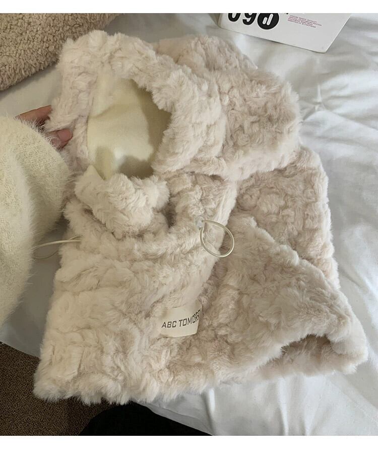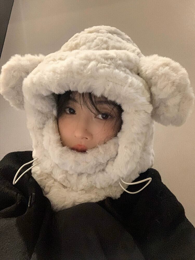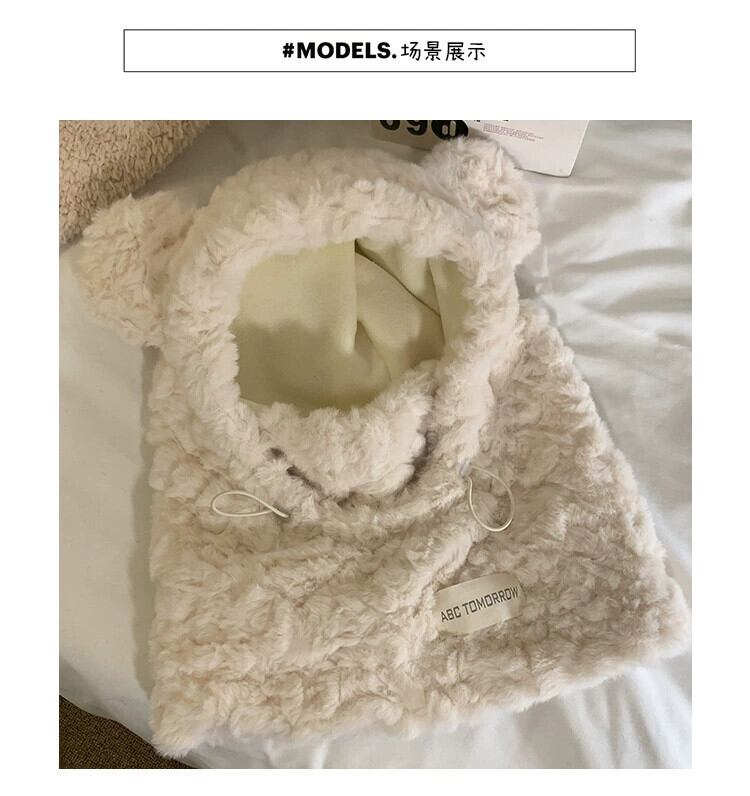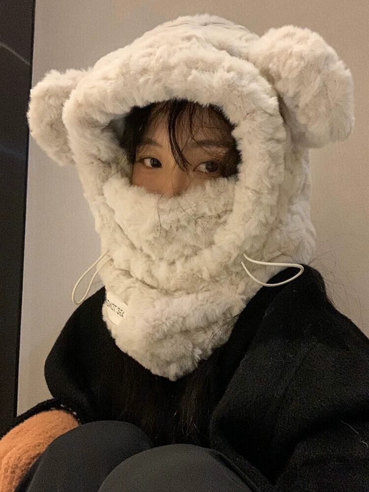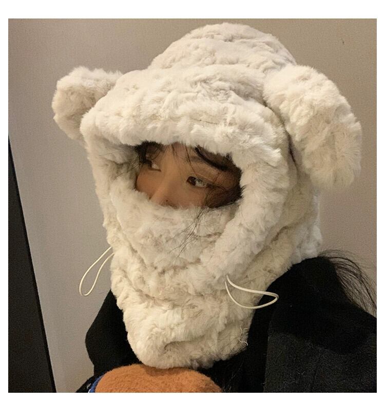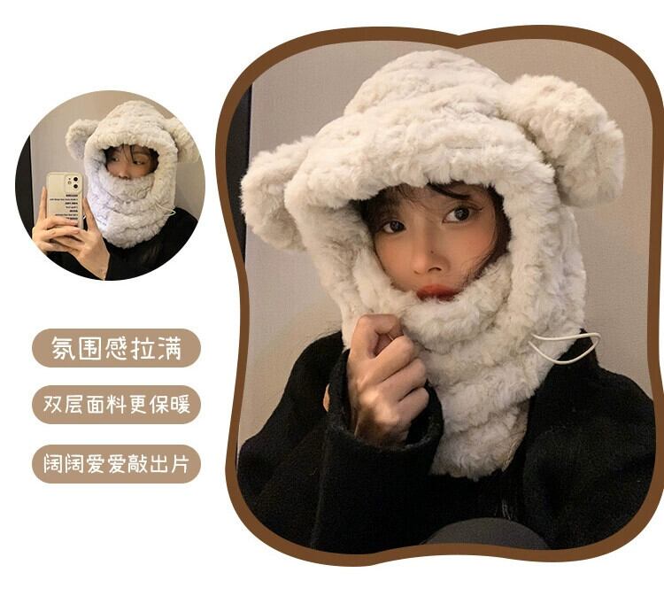 かわいいクマのぬいぐるみ耳保護帽子女性冬肥厚プラスベルベットマスクスカーフオールインワンサイクリング暖かい雷峰帽子 大人ガーリー スウィート キュート カジュアル ウィンター 冬物 15dd76451042480
