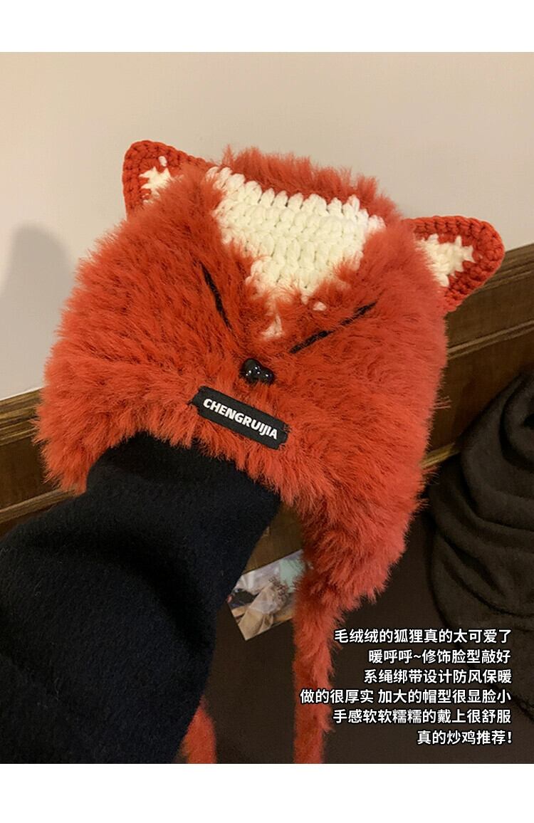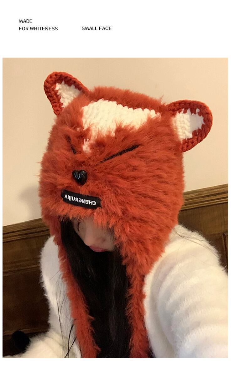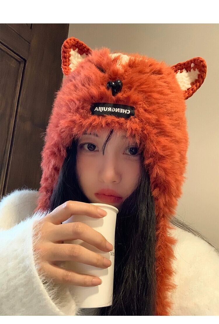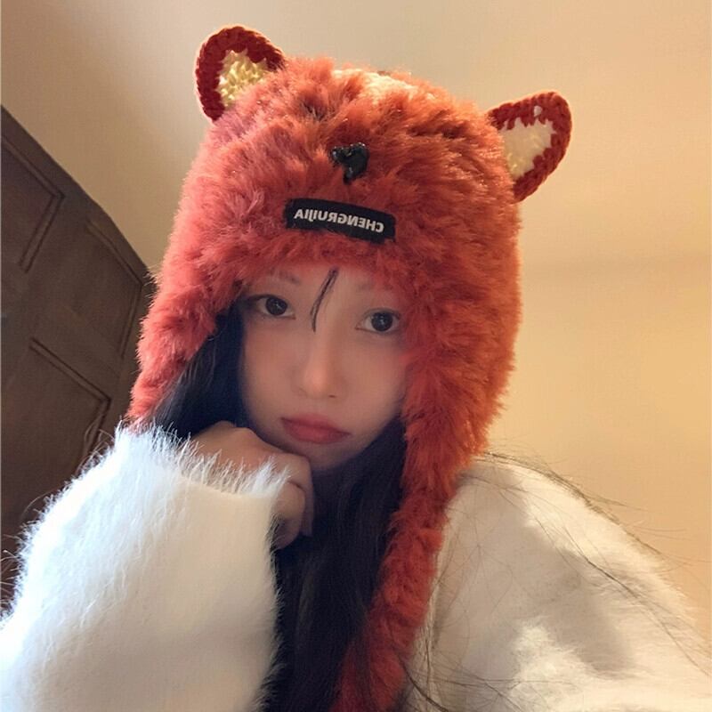 これらのかわいい手編みのキツネの毛皮の耳保護帽子、女性の秋と冬、暖かくて多用途の豪華なサンダーハット 大人ガーリー スウィート キュート カジュアル オータム 秋物 ウィンター 冬物 15dd102751404