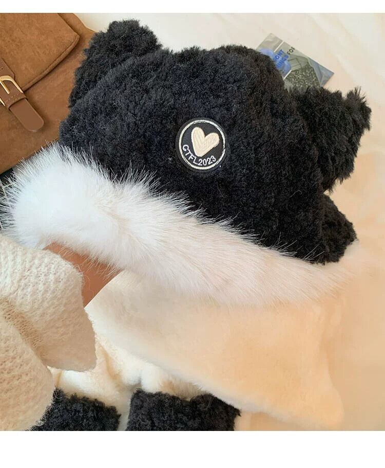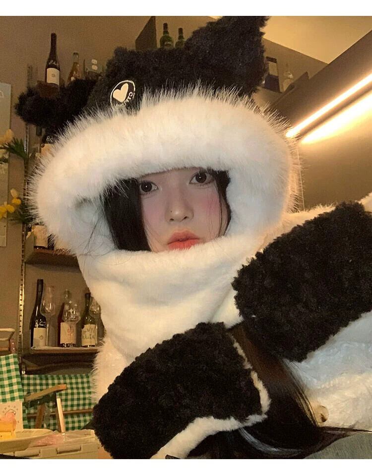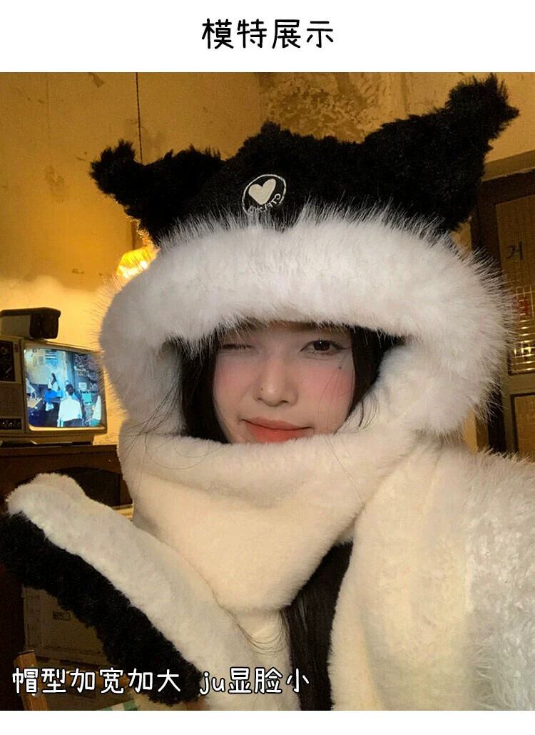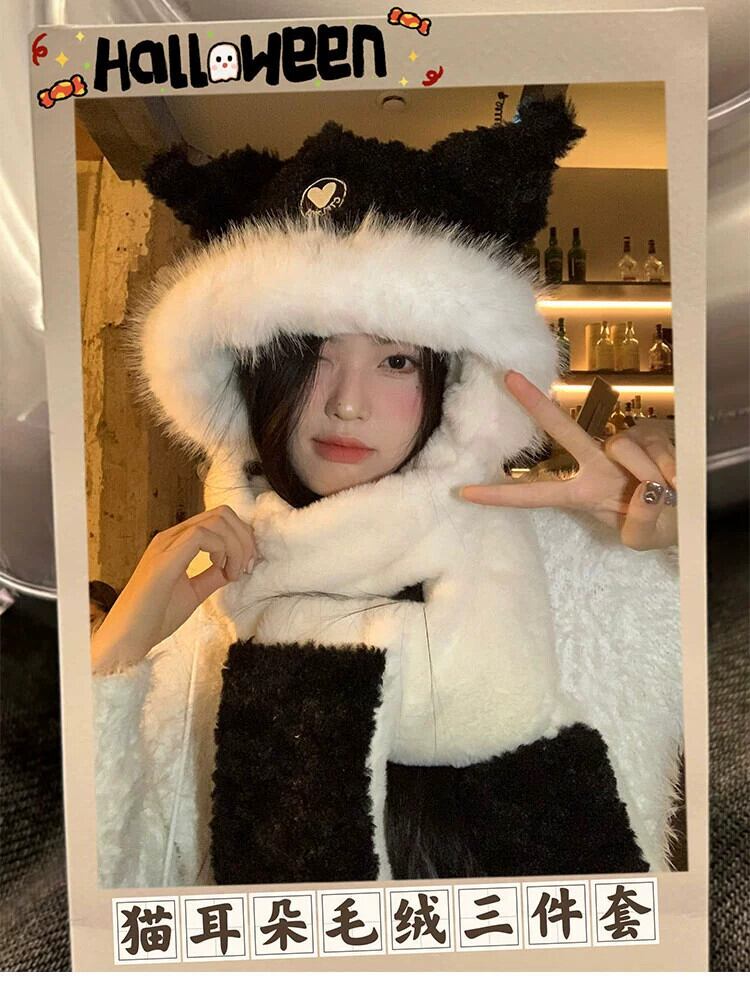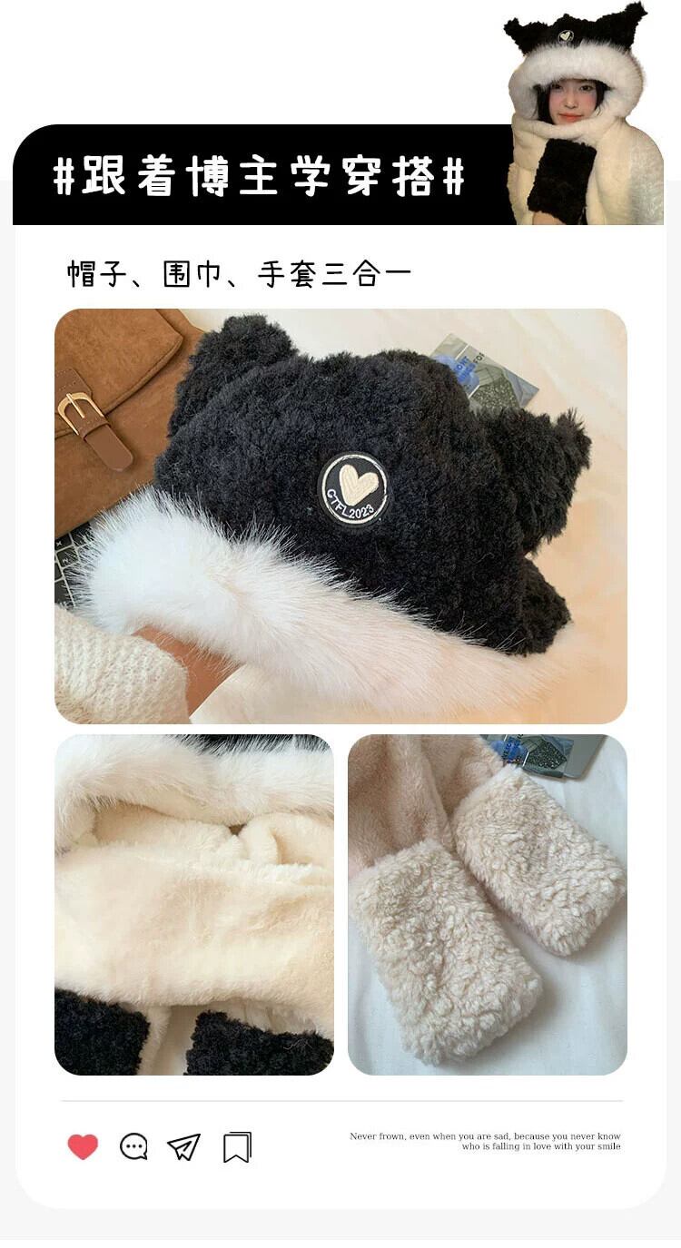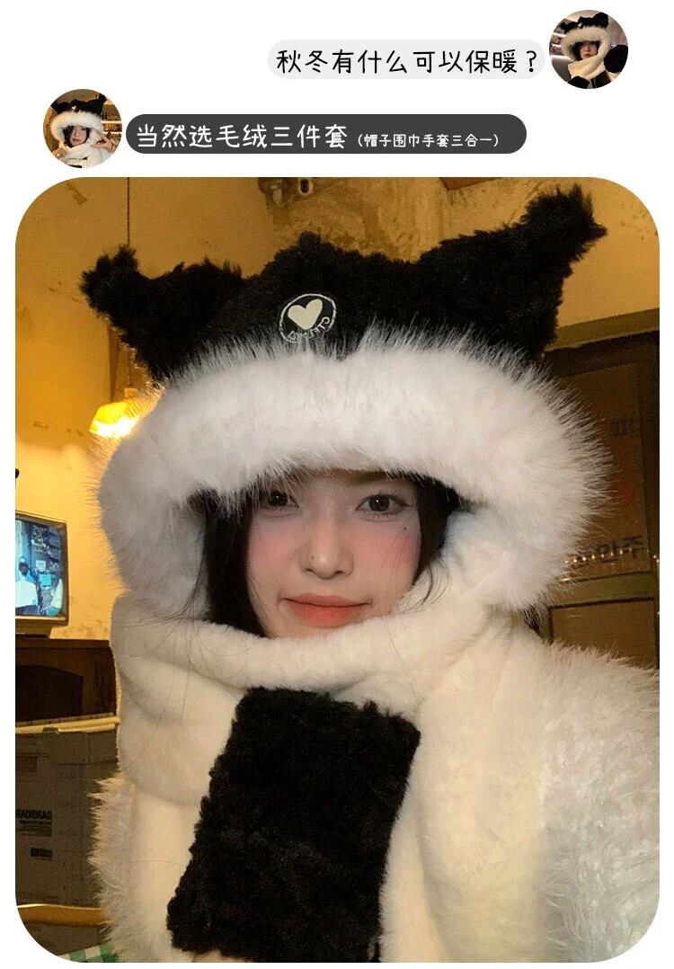 かわいい耳ぬいぐるみ帽子スカーフ手袋ワンピース 3 点セット女性秋と冬暖かく厚みのあるサイクリング耳保護 大人ガーリー スウィート キュート カジュアル オータム 秋物 ウィンター 冬物 15dd55189423749