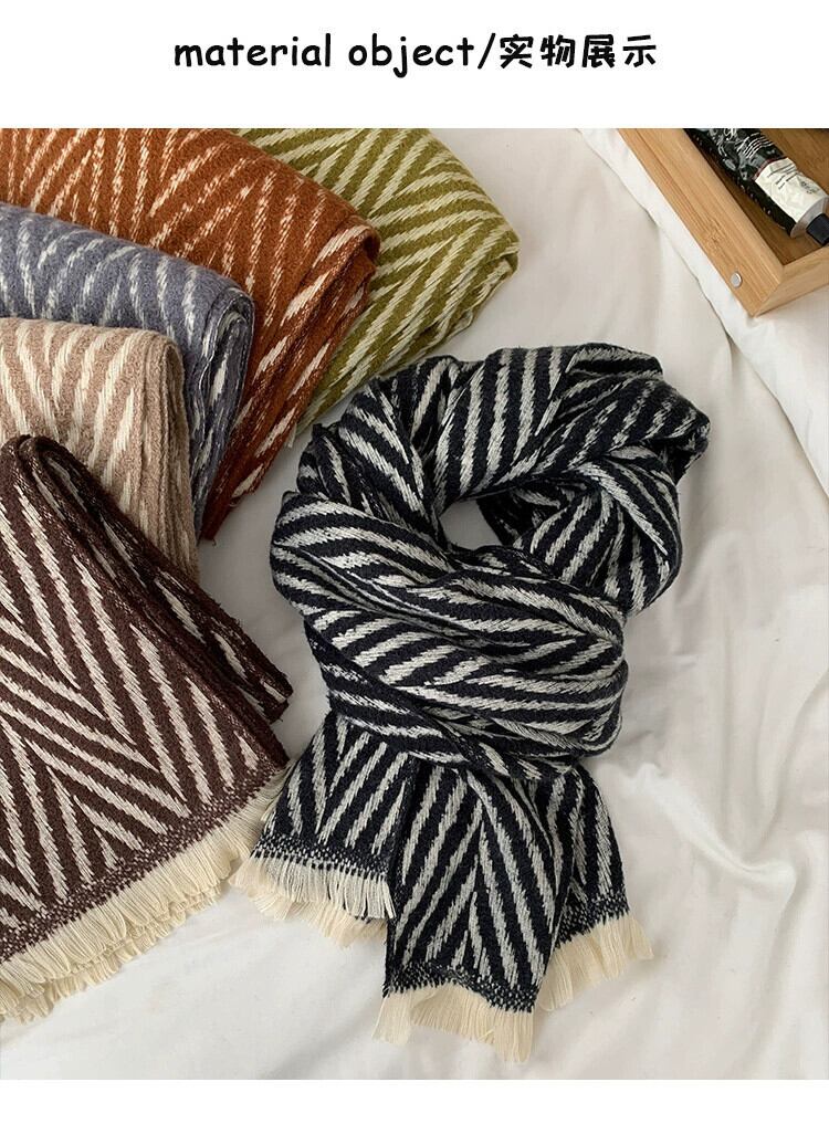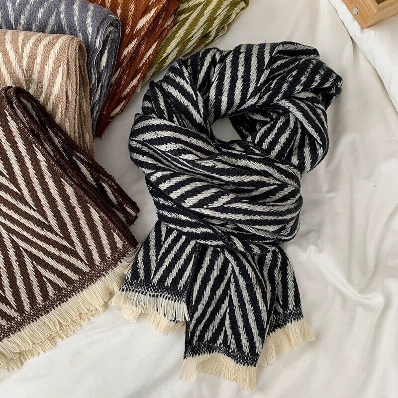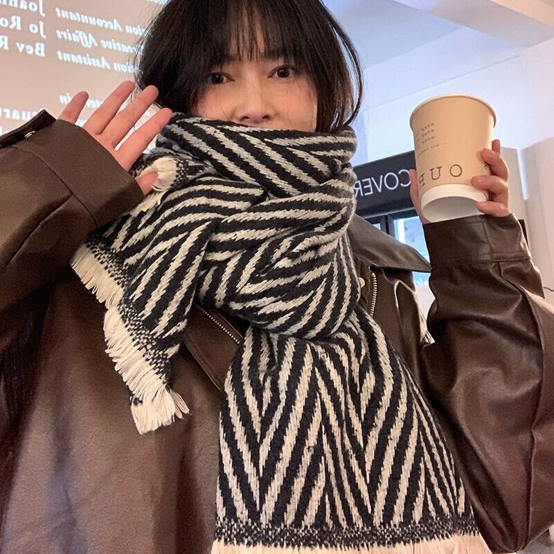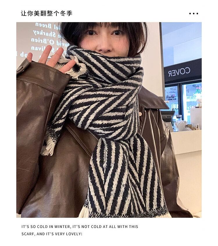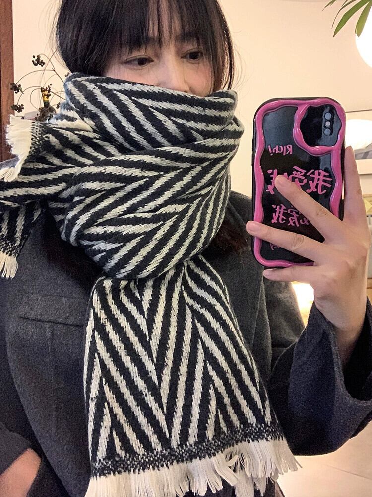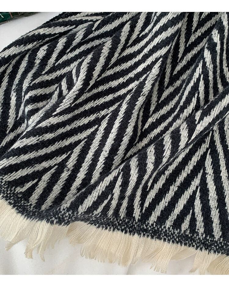 レトロ多用途ヘリンボーン模造カシミヤスカーフ女性秋と冬の暖かい黒と白のストライプ学生ウールスカーフ ホワイト ブラック オータム 秋物 ウィンター 冬物 15dd21688066971