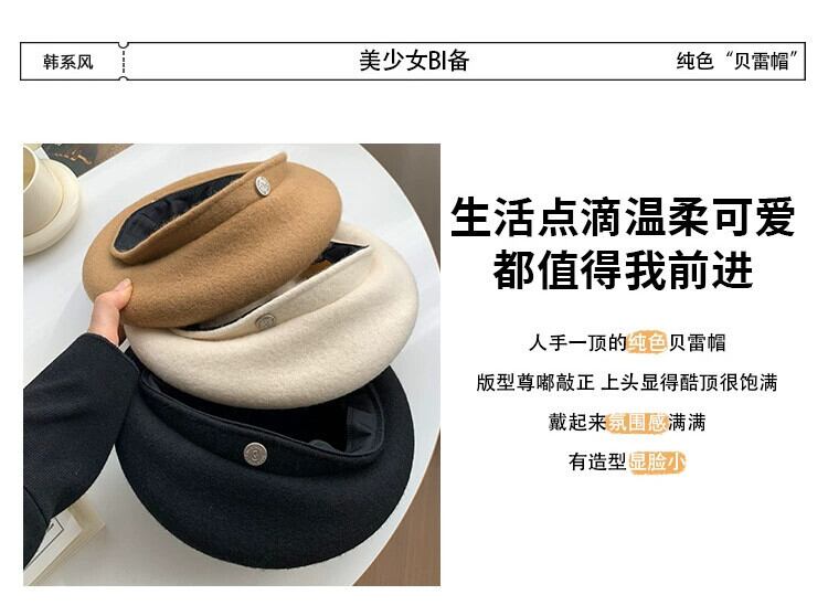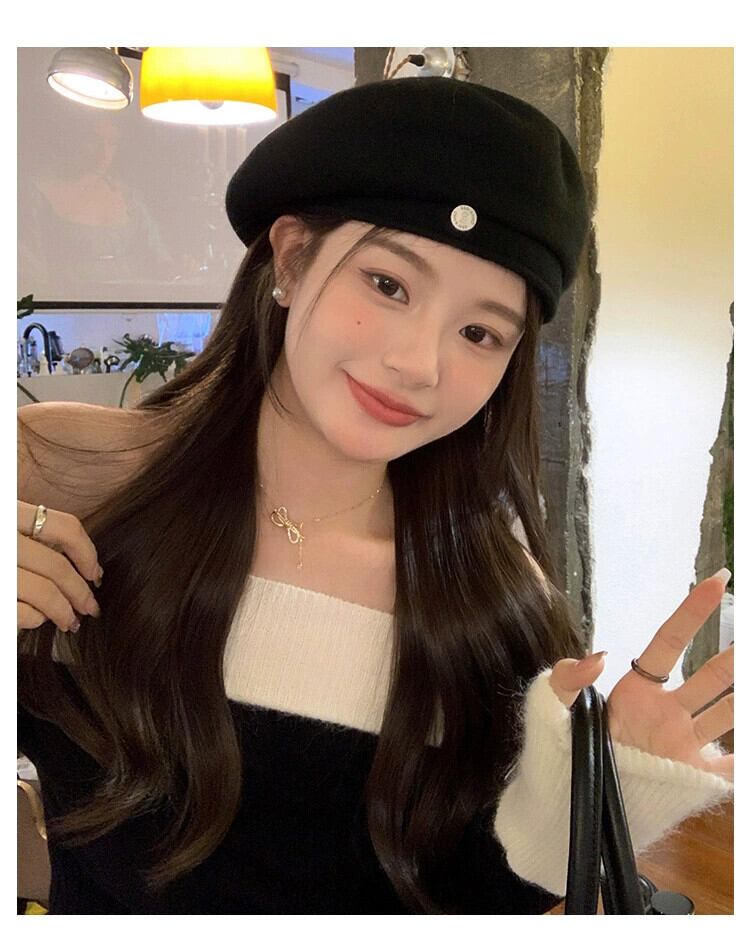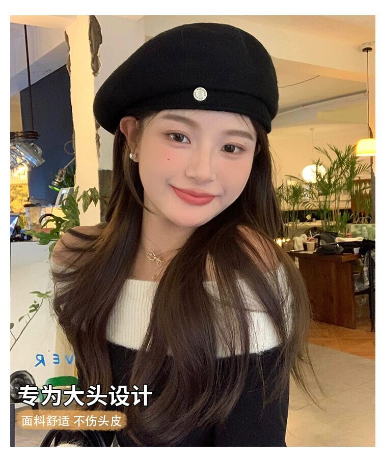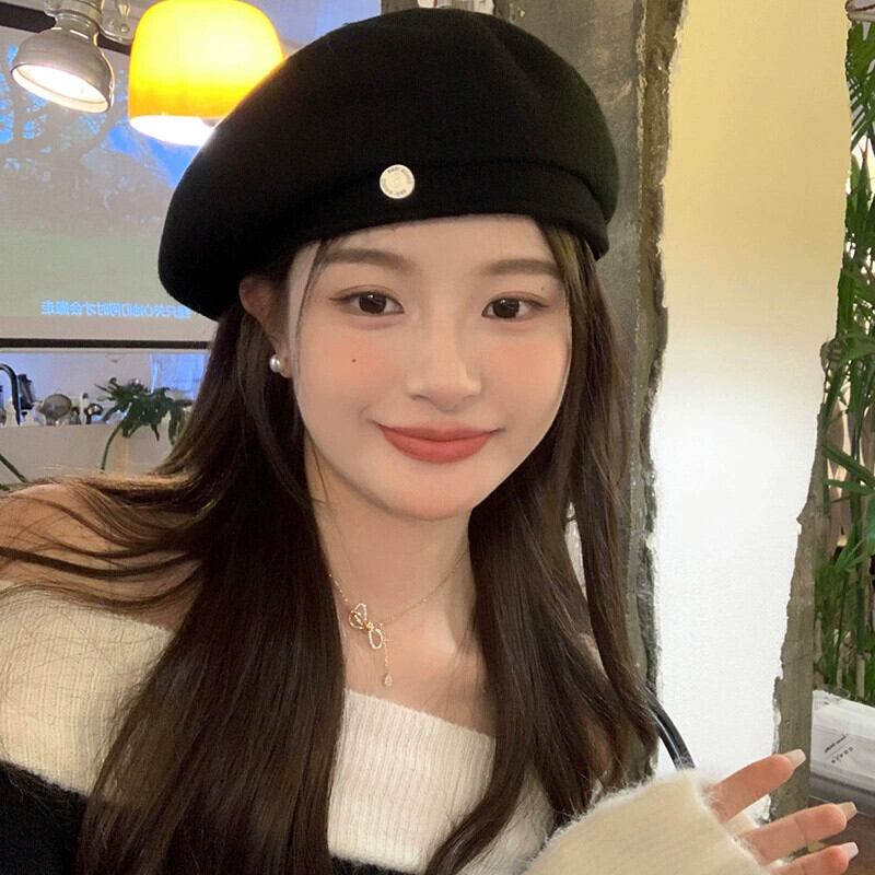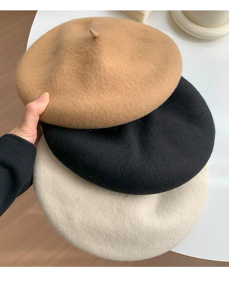 2023 ブラックウールベレー帽女性の秋と冬英国有能な顔見せスモールエンドペインター帽子 オータム 秋物 ウィンター 冬物 ベレット ヘアアクセサリー 15dd23713992090