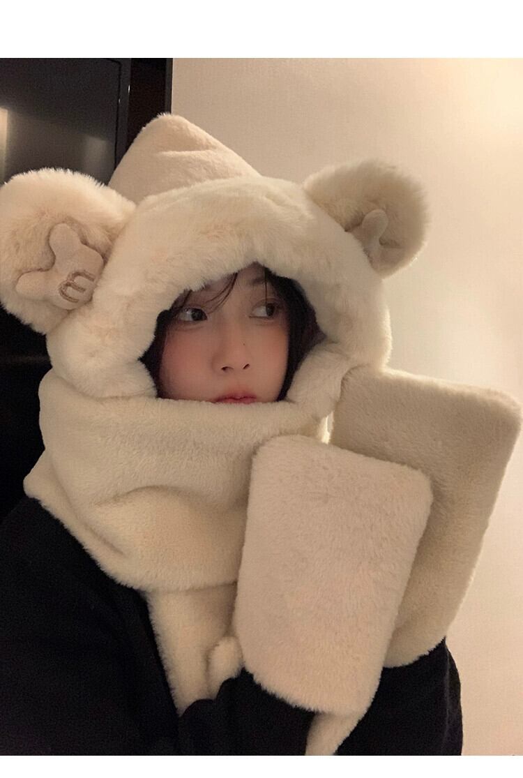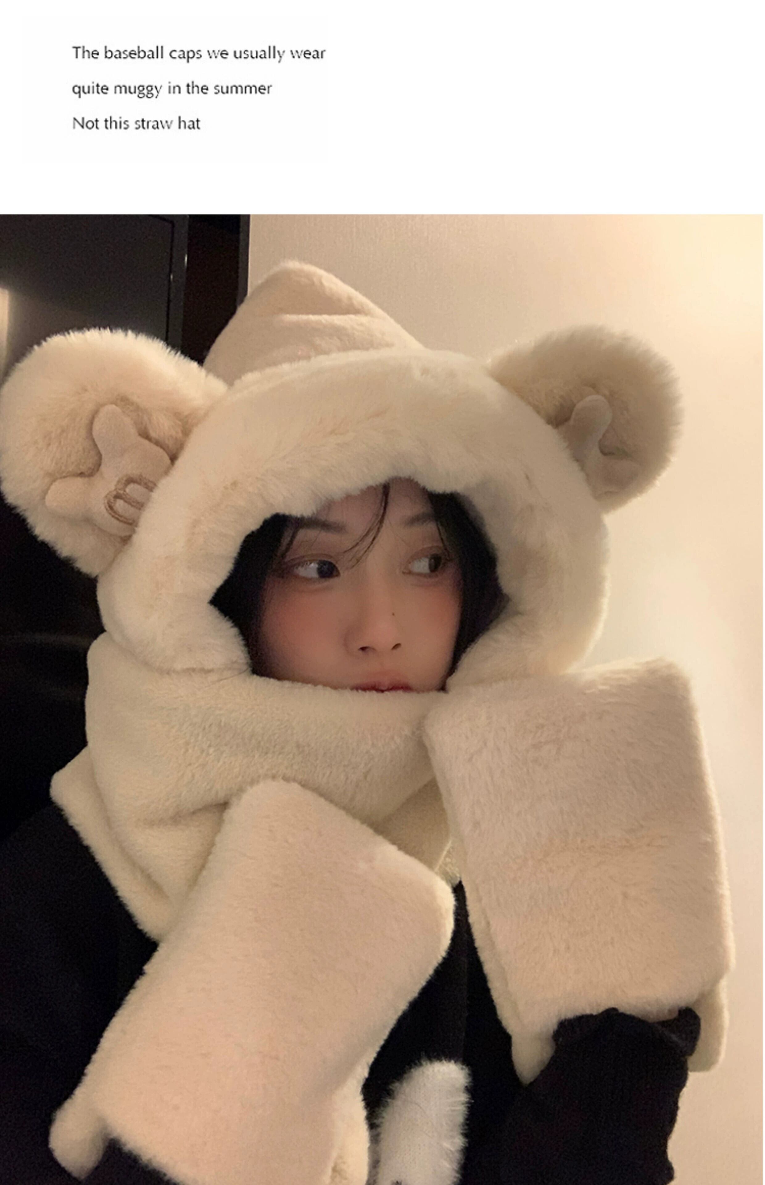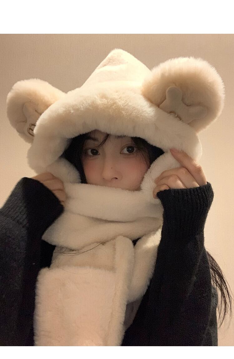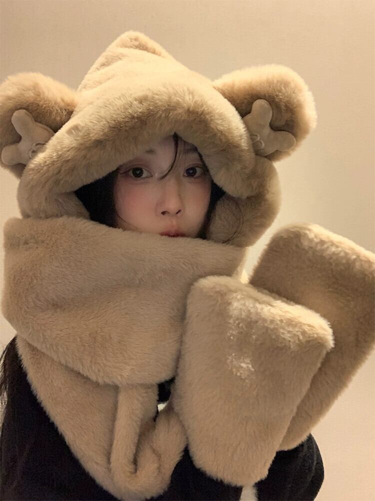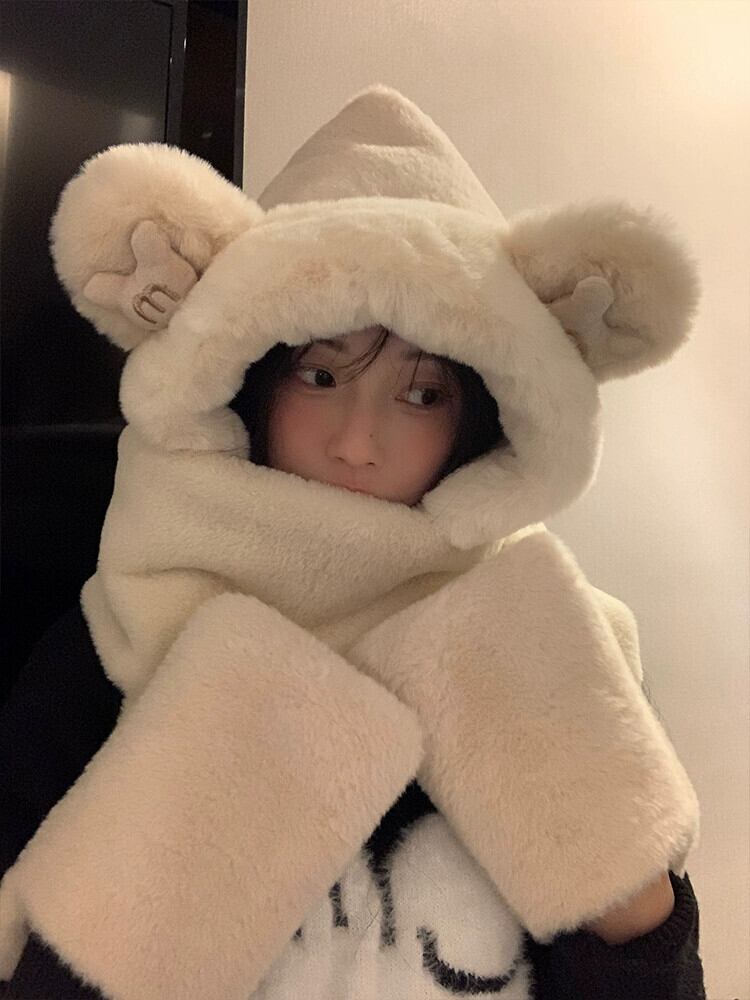 クマ耳帽子とスカーフオールインワンレディース冬スタイルかわいいぬいぐるみ厚く暖かいネックスカーフ3点セット 大人ガーリー スウィート キュート カジュアル ウィンター 冬物 15dd61443932088