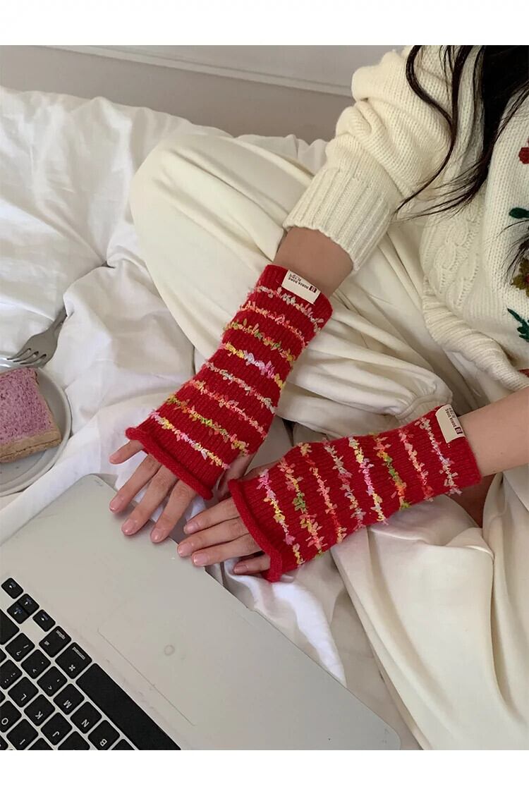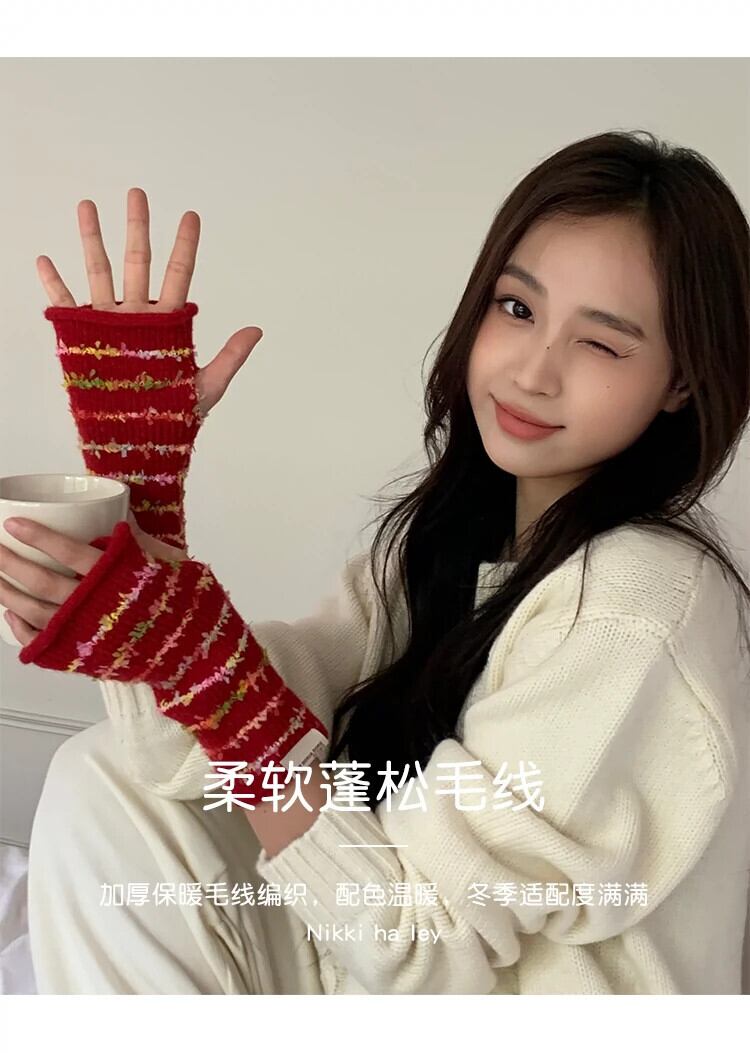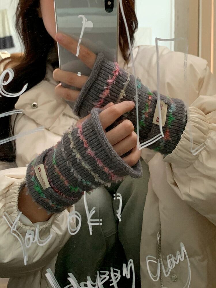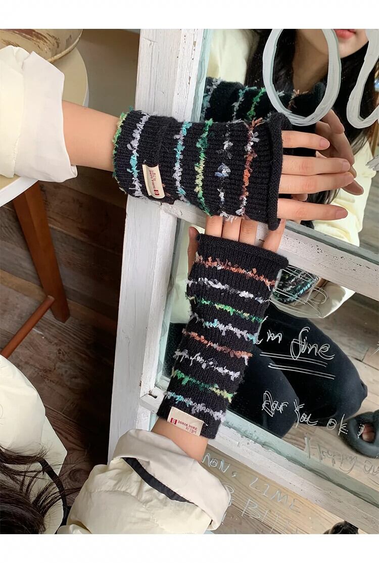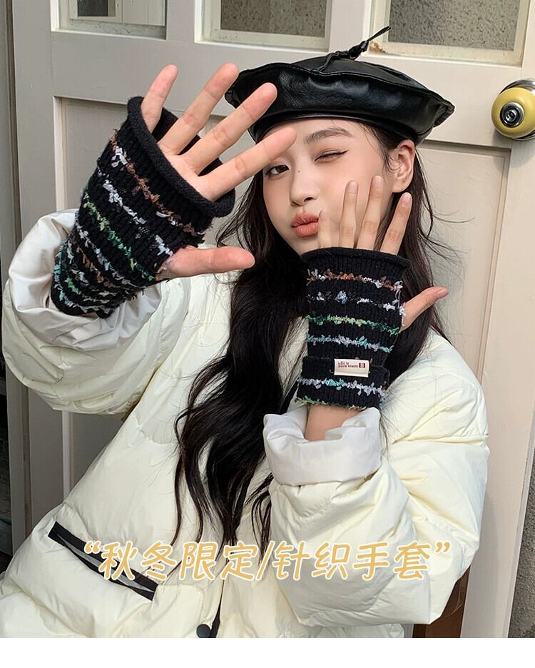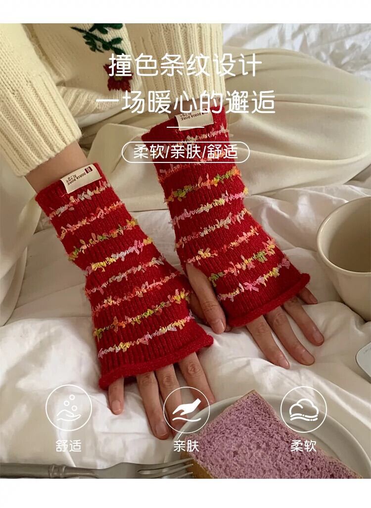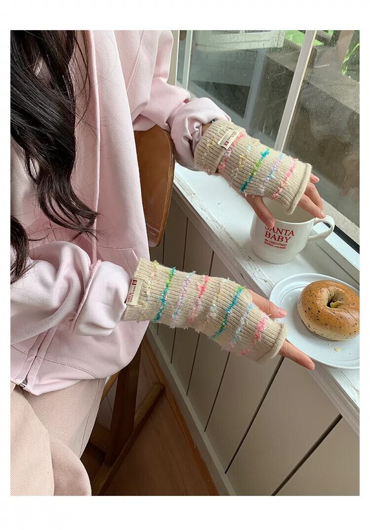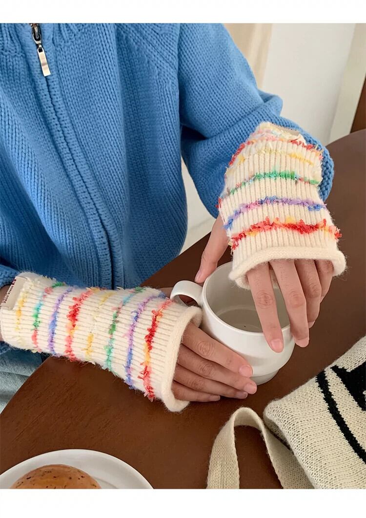 甘くてかわいいレインボーハーフフィンガーコントラストストライプ暖かい露出指タッチスクリーンサイクリンググローブ女性秋冬 大人ガーリー スウィート キュート カジュアル オータム 秋物 ウィンター 冬物 15dd93411406598