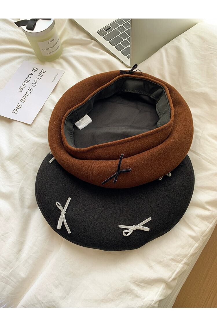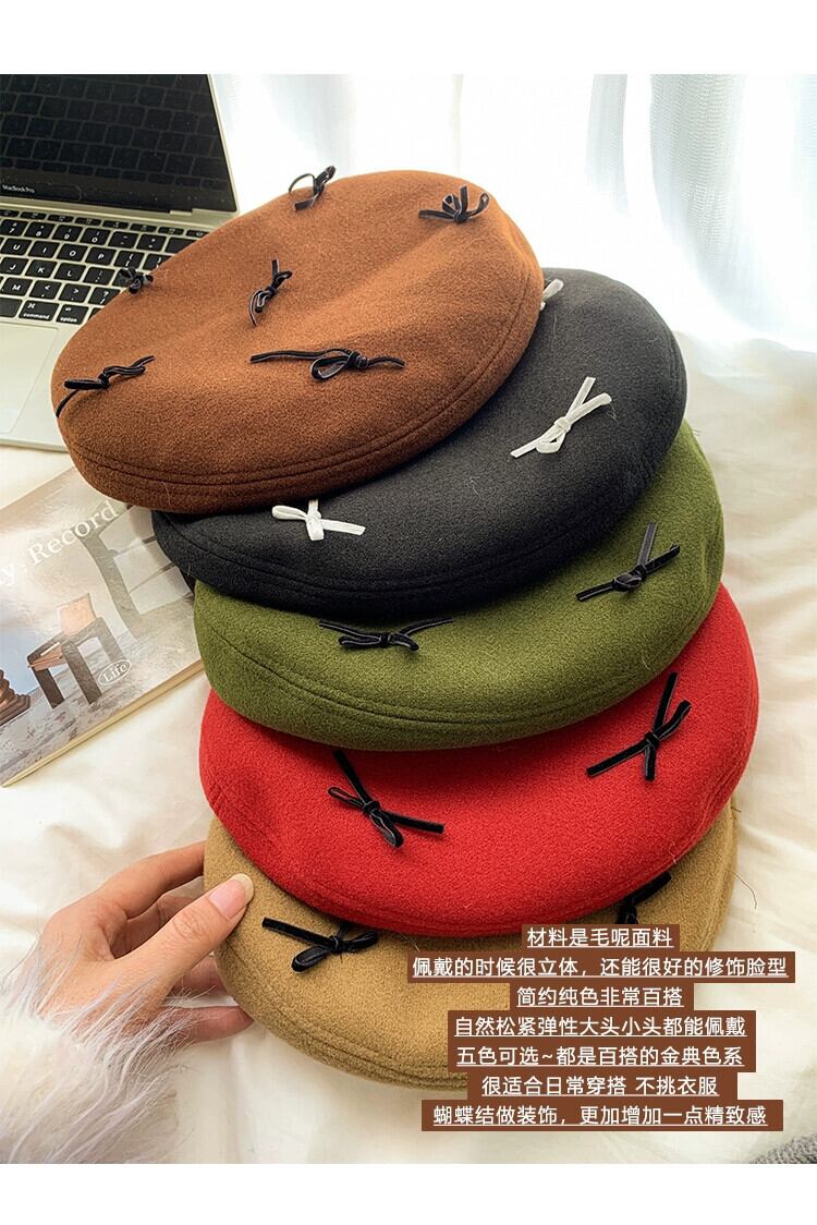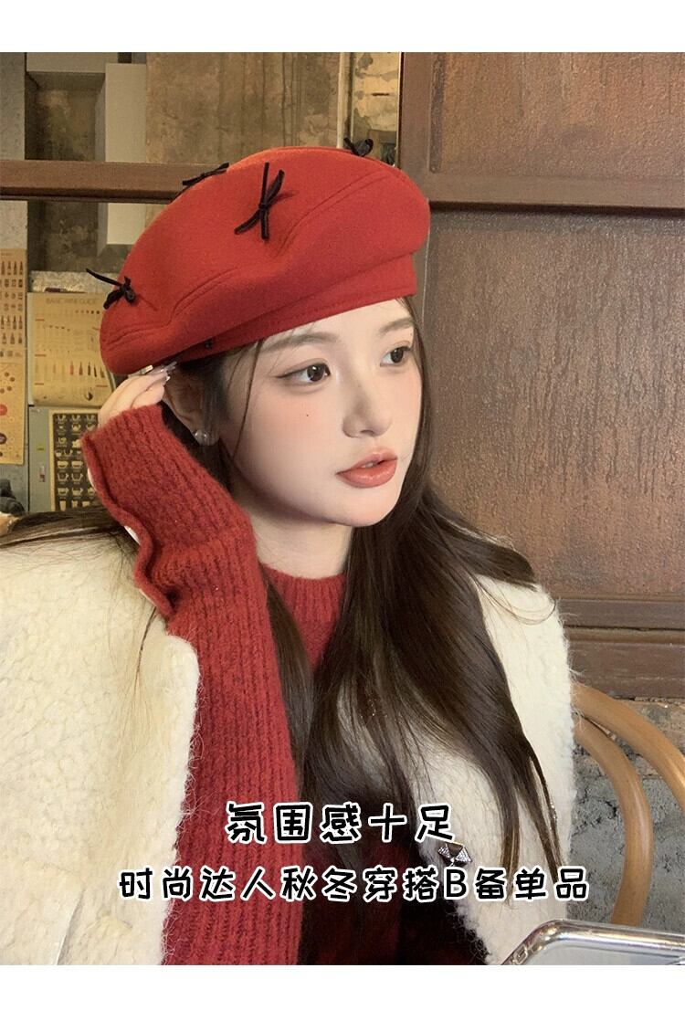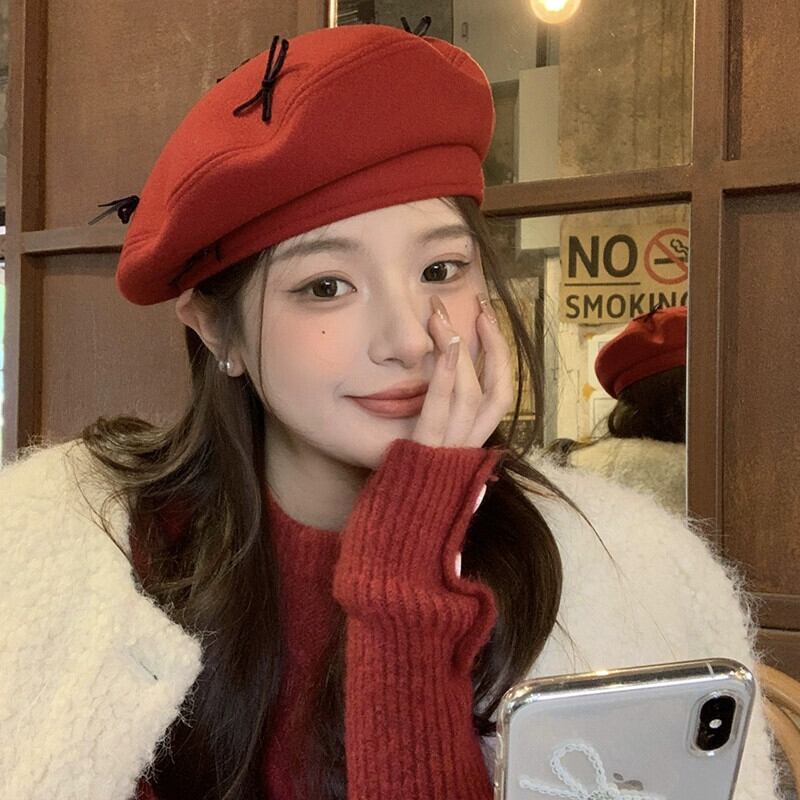 赤いリボンベレー帽女性の 2023 秋冬レトロオールマッチペインターハット顔見せ小さな八角帽子 レッド オータム 秋物 ウィンター 冬物 ベレット ヘアアクセサリー 15dd3041420652