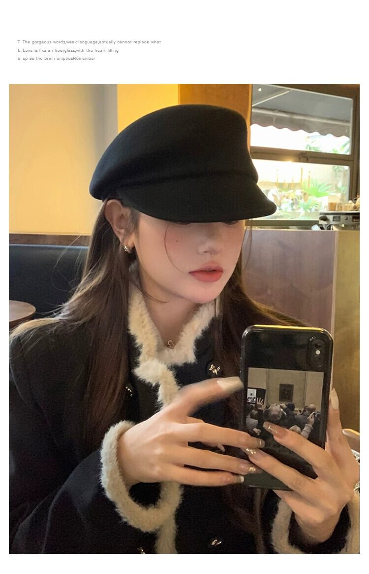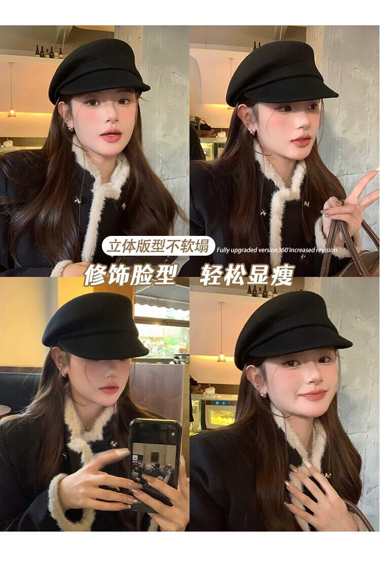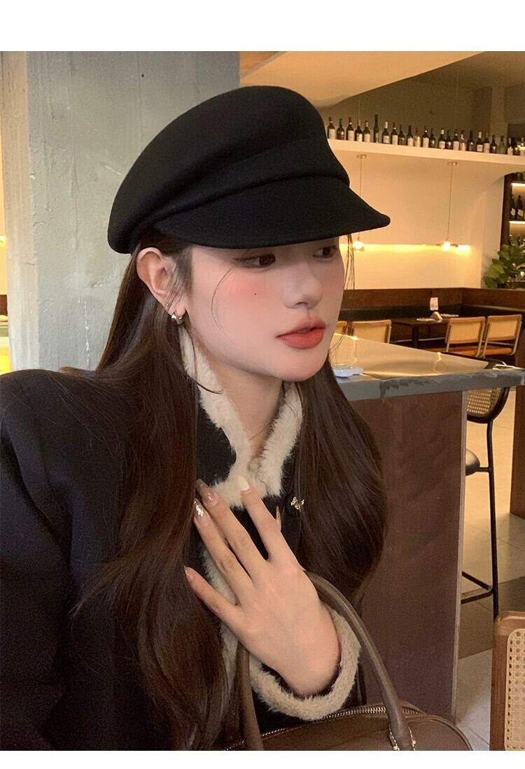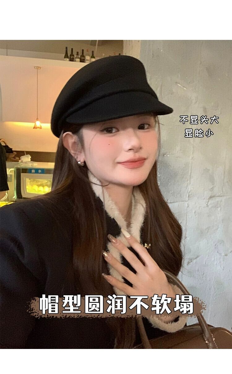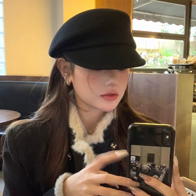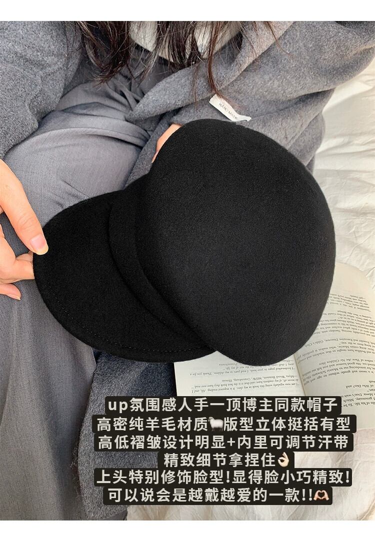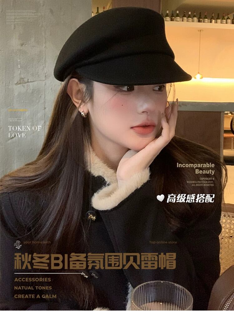 フィーバー同じスタイル英国スタイル黒ニッチベレー帽女性の秋と冬の顔ラムフェルト帽子ウールペインターハット ブラック オータム 秋物 ウィンター 冬物 ベレット ヘアアクセサリー 15dd34253597416