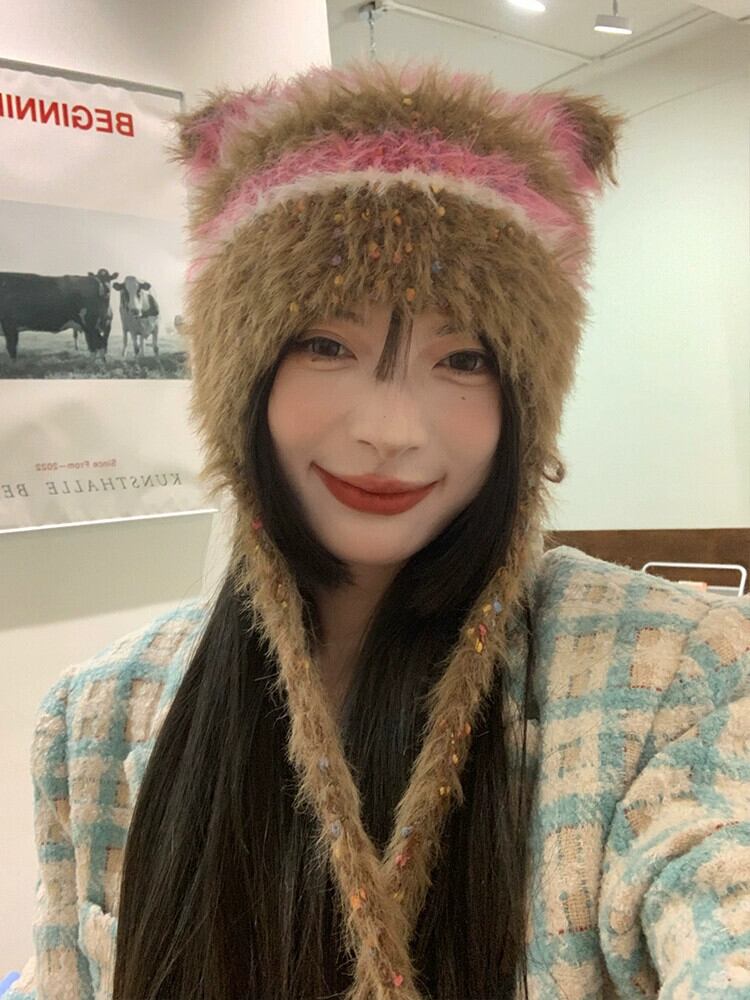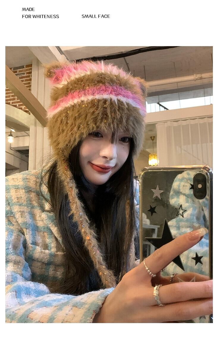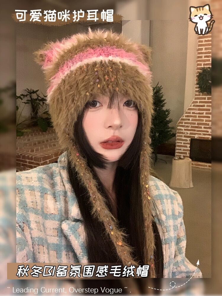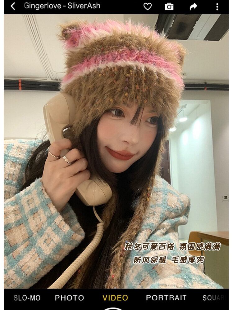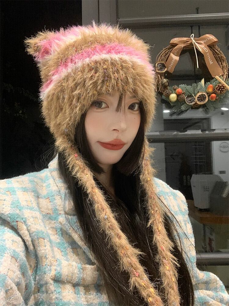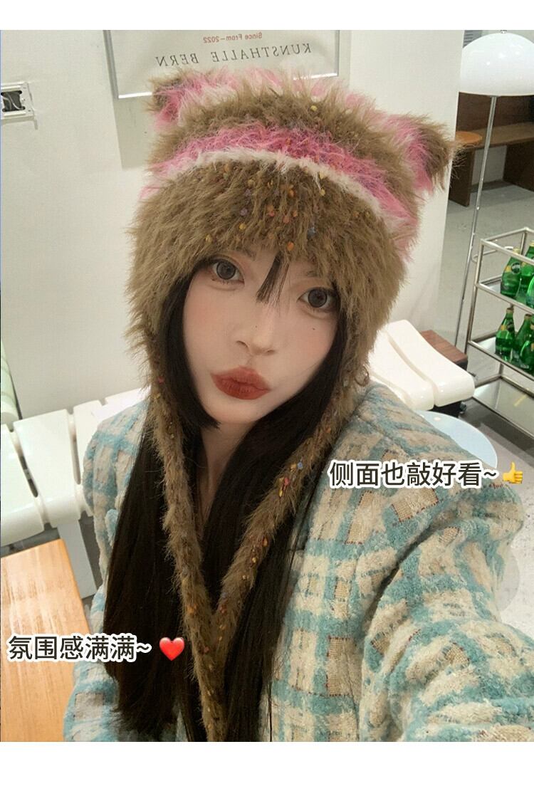 スタイルの新しい手編みぬいぐるみ帽子女性の秋と冬の ese スタイルのニットストラップ耳保護帽子暖かいつま先キャップ オータム 秋物 ウィンター 冬物 15dd25083621323