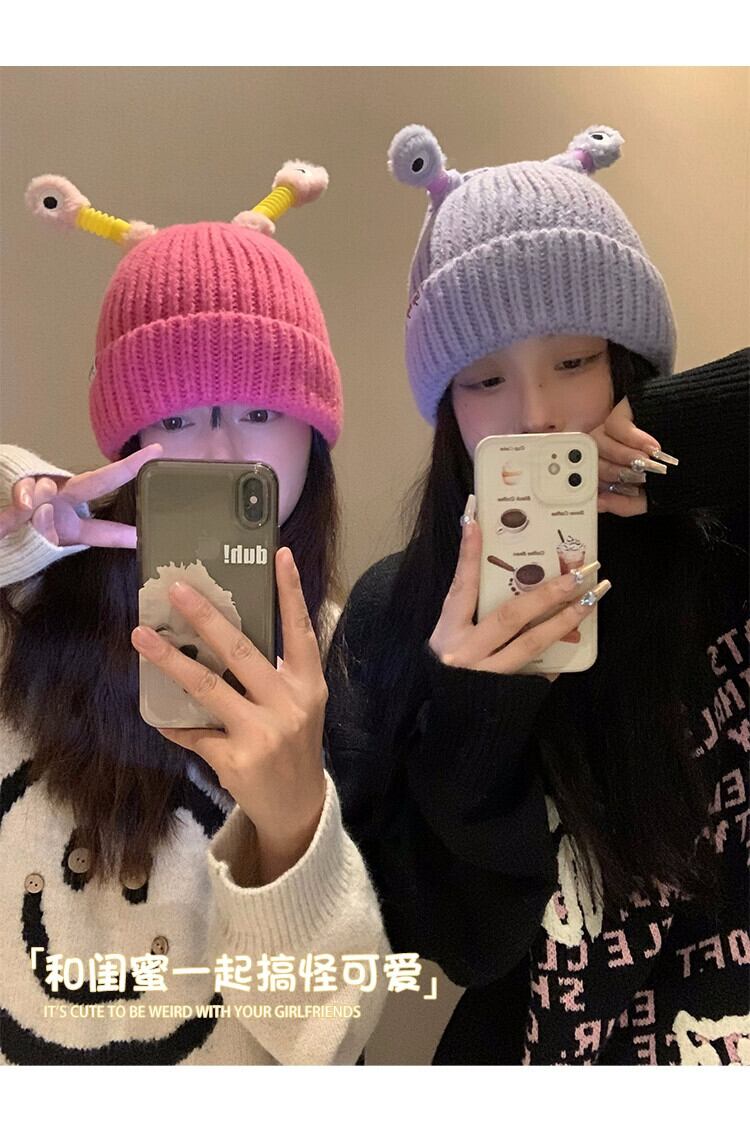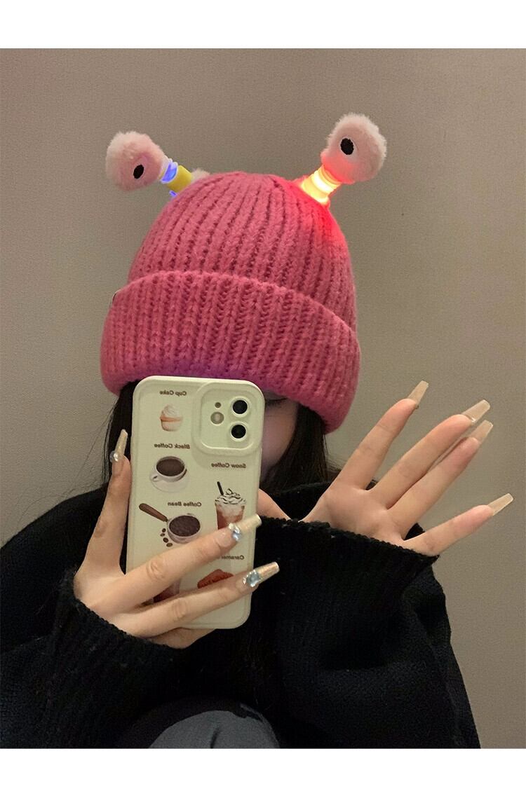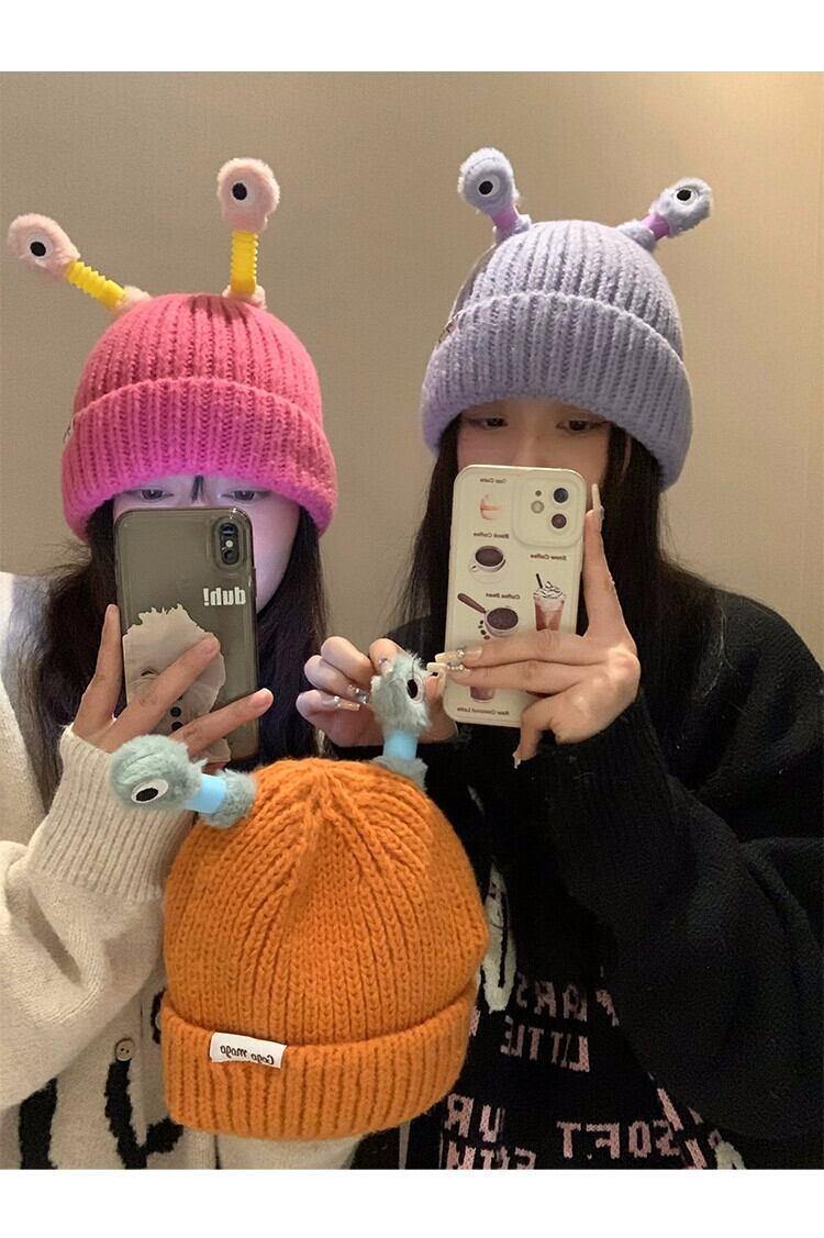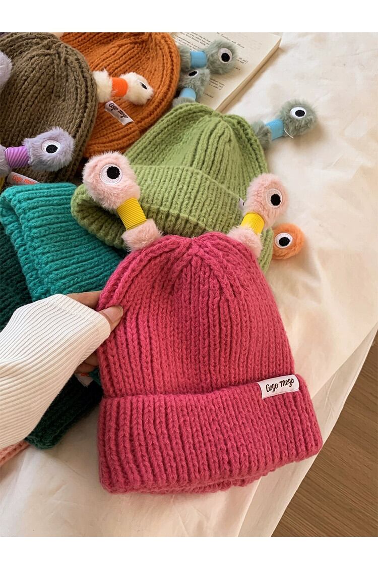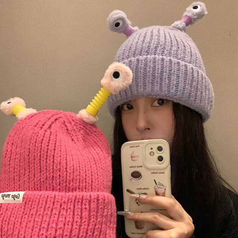 かわいい漫画の発光小さなモンスター ウールの帽子女性秋冬の大きな頭囲の新しい暖かい帽子面白い冷たい帽子 大人ガーリー スウィート キュート カジュアル オータム 秋物 ウィンター 冬物 15dd41564209635