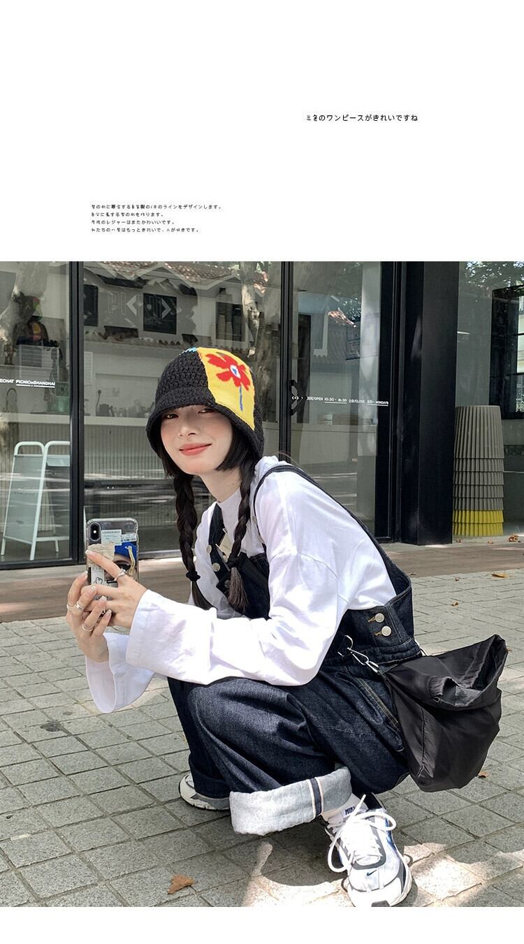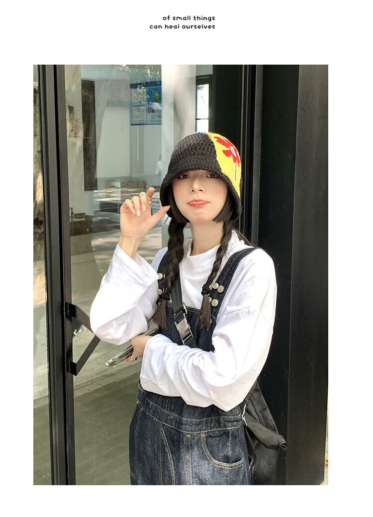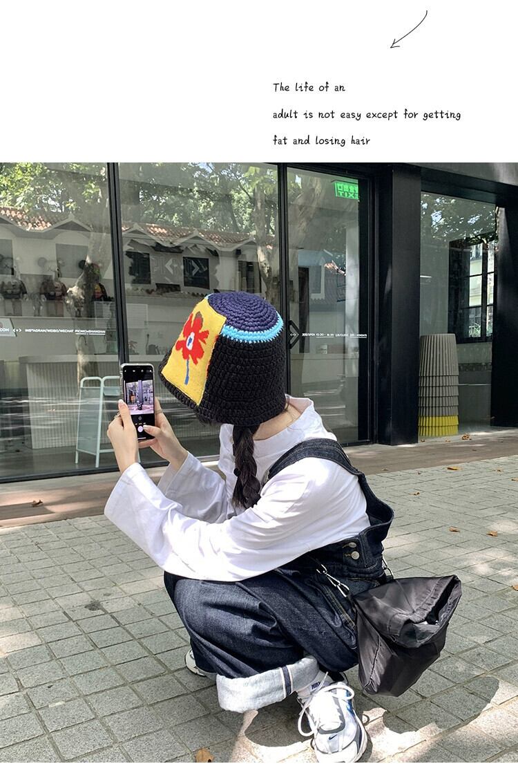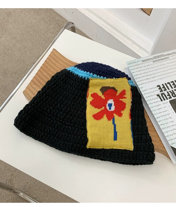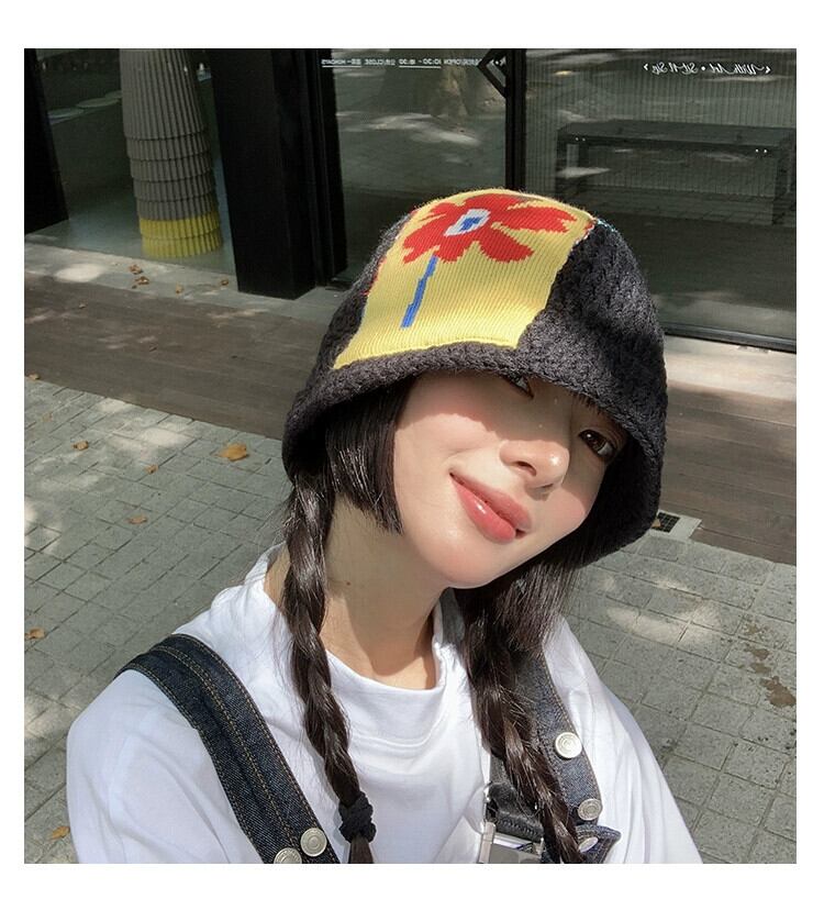 ニット漁師の帽子の女性のトレンディな秋と冬のスタイルオールマッチ黒の顔が見える小さな盆地帽子エセフラワーウールの帽子 ブラック オータム 秋物 ウィンター 冬物 フラワーデザイン 15dd19872159308