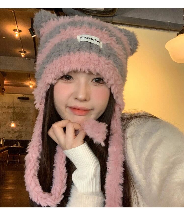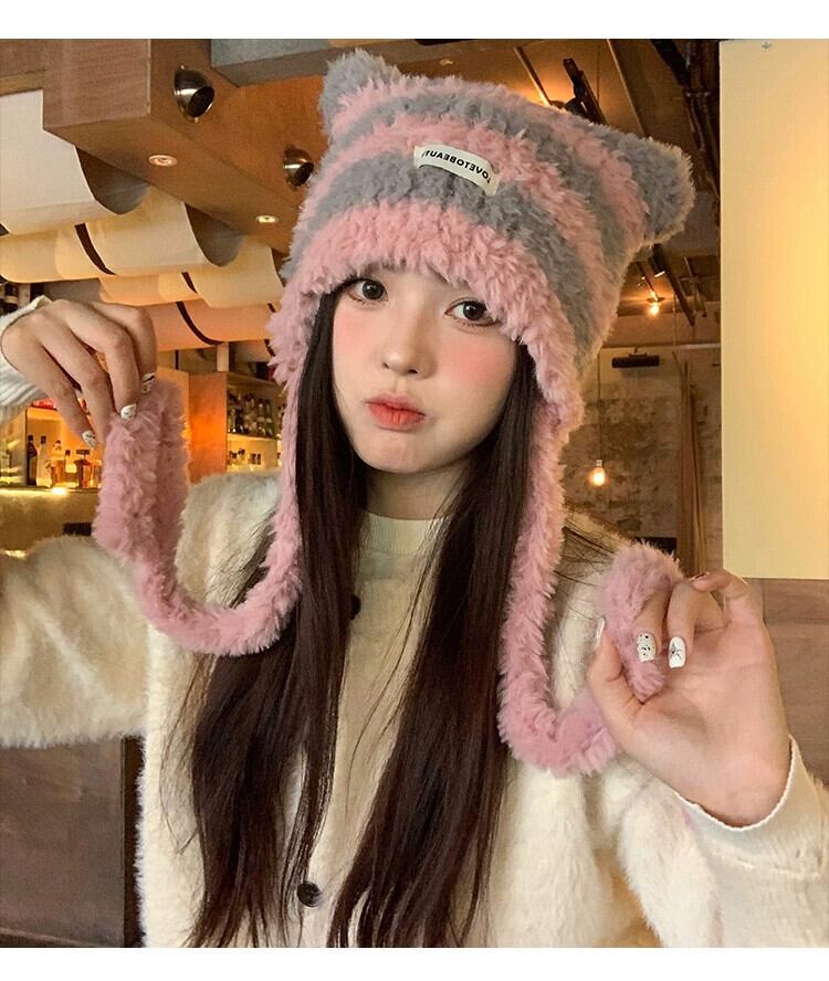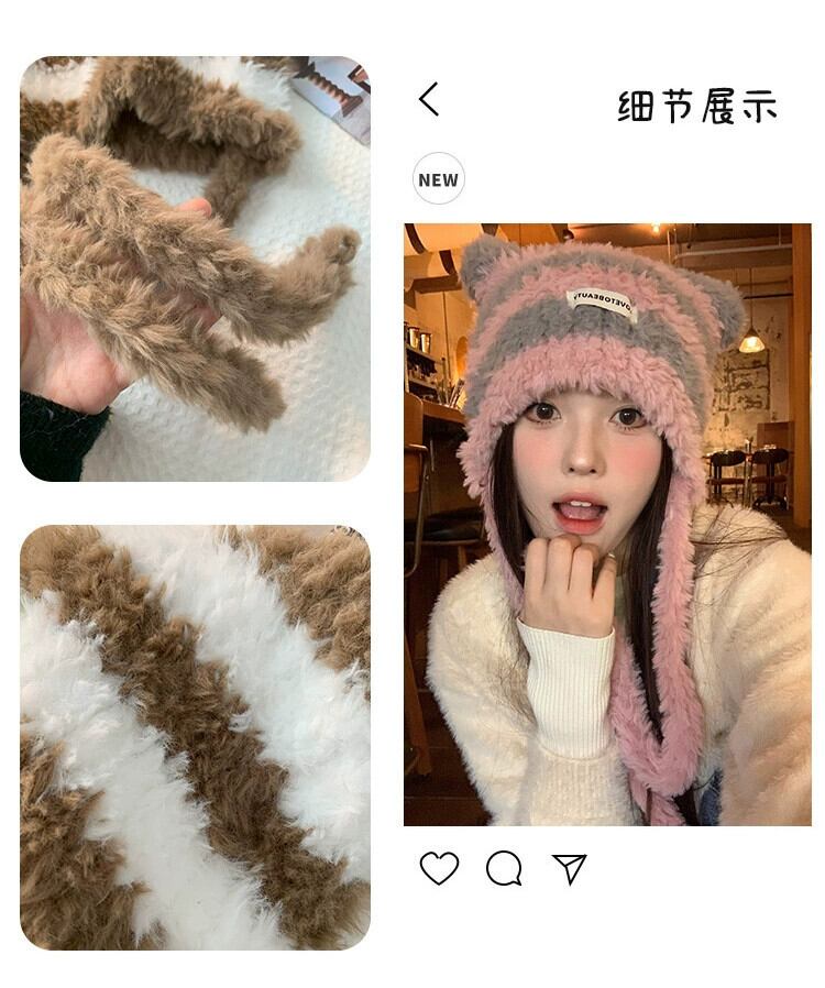 手作りぬいぐるみビーニー女性の秋と冬の新しいかわいいカラーマッチングラベル耳保護帽子暖かくて多用途な雷峰帽子 大人ガーリー スウィート キュート カジュアル オータム 秋物 ウィンター 冬物 15dd59000446321