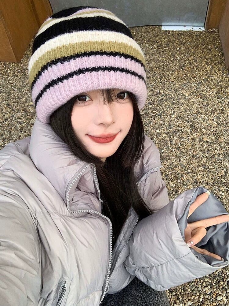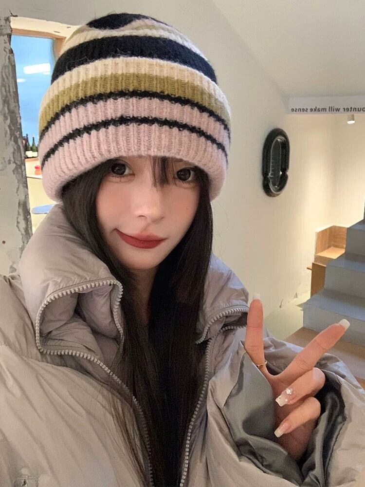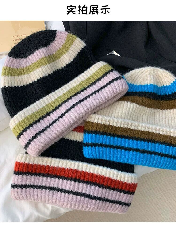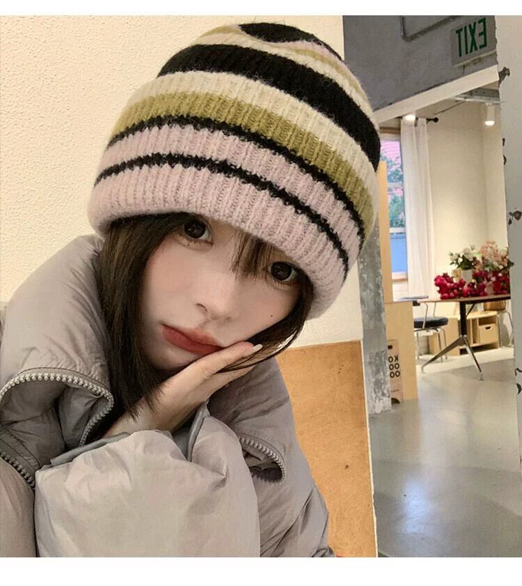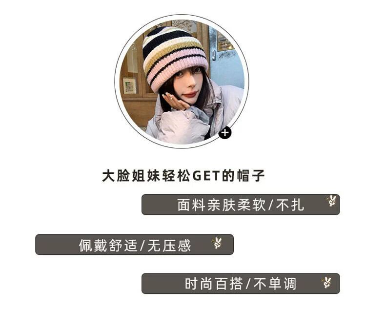 秋冬のコントラストカラーのウールの帽子の女性、大きな頭囲、顔が露出する小さなニット帽、暖かい耳の保護帽子、ファッショナブルで多用途な防寒帽子 オータム 秋物 ウィンター 冬物 15dd85177881199