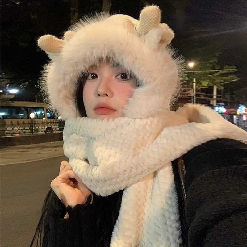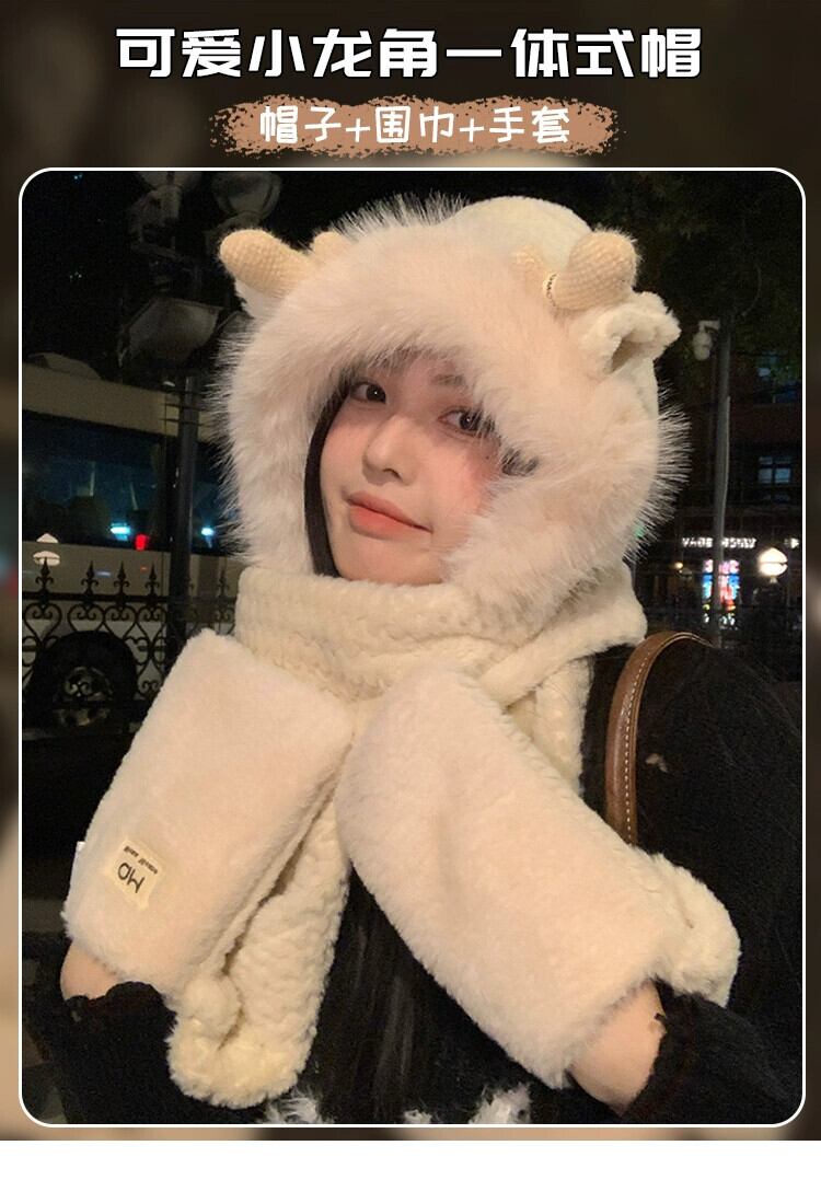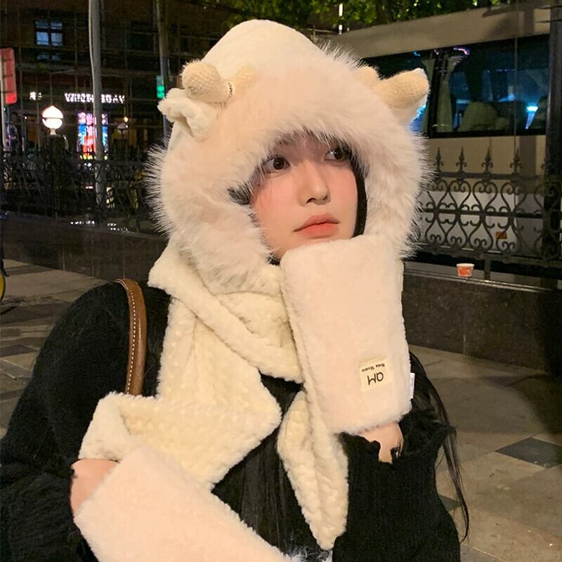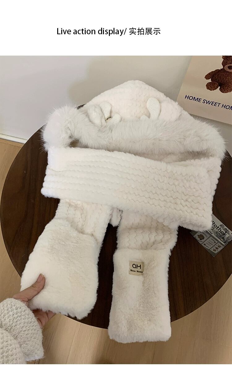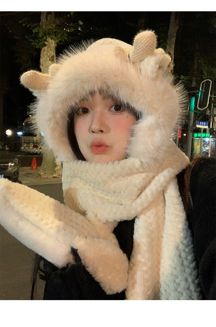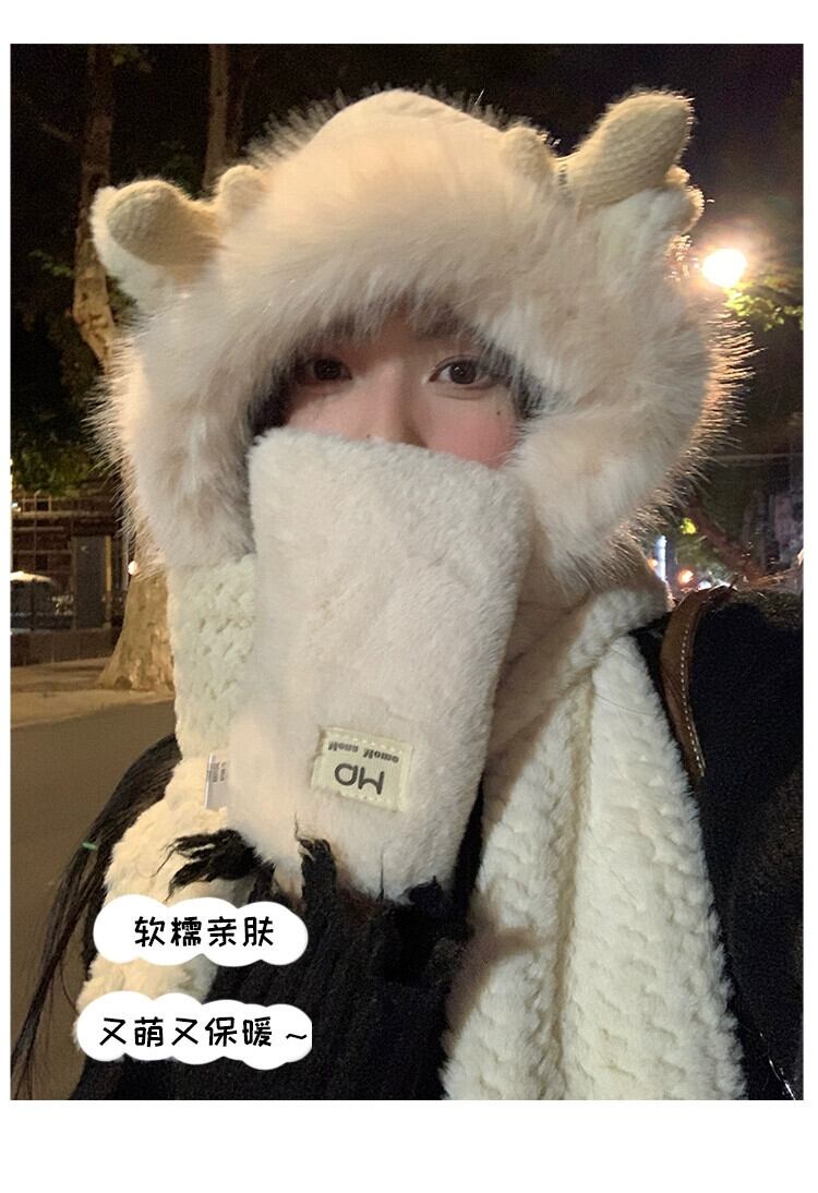 かわいい小さな枝角毛皮で覆われた暖かい耳の保護 3 点セット二重層肥厚スカーフ手袋ワンピース帽子女性寒さから保護します 大人ガーリー スウィート キュート カジュアル 15dd65932839020