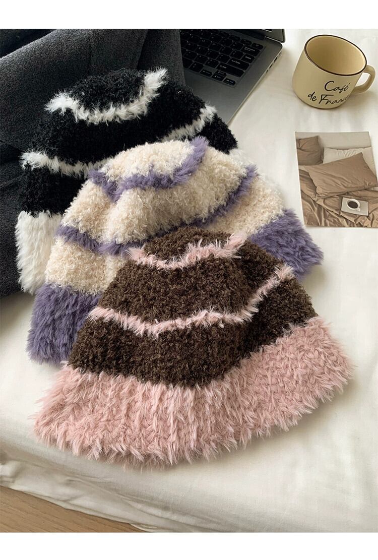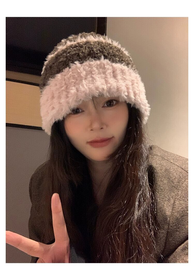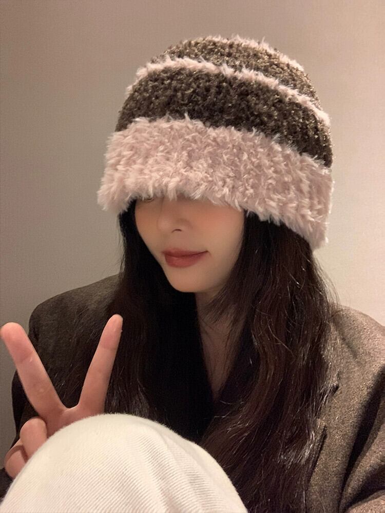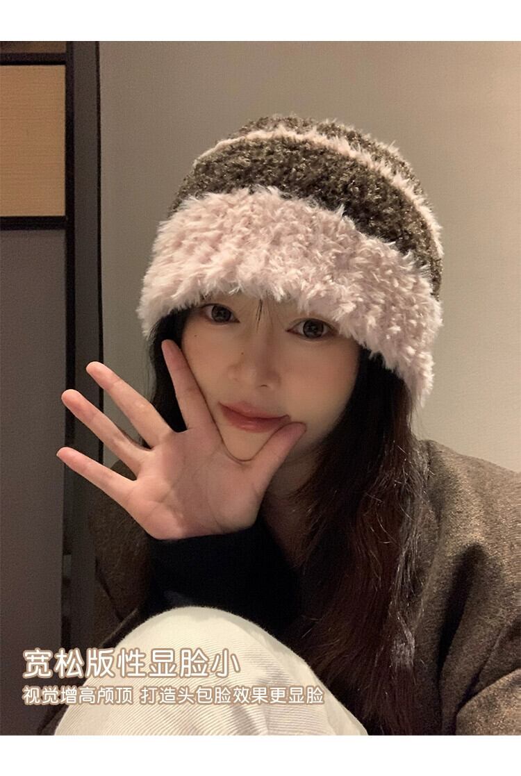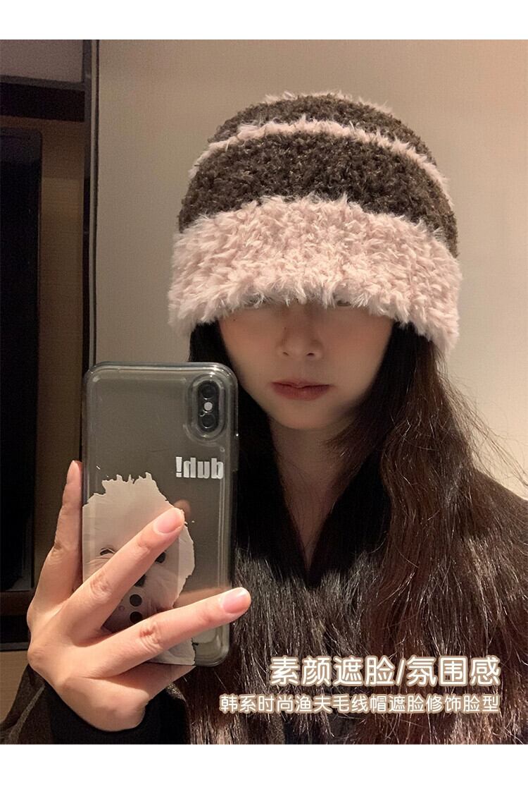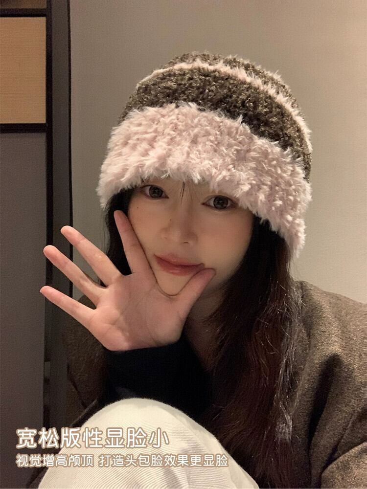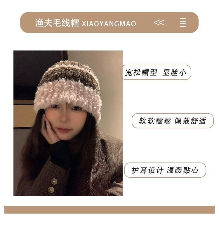 2023 カラーブロックニット漁師帽子秋と冬の女性の大きな頭囲顔小さな多用途暖かい豪華なウールの帽子 オータム 秋物 ウィンター 冬物 15dd15709411464