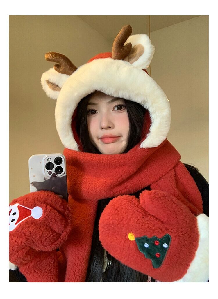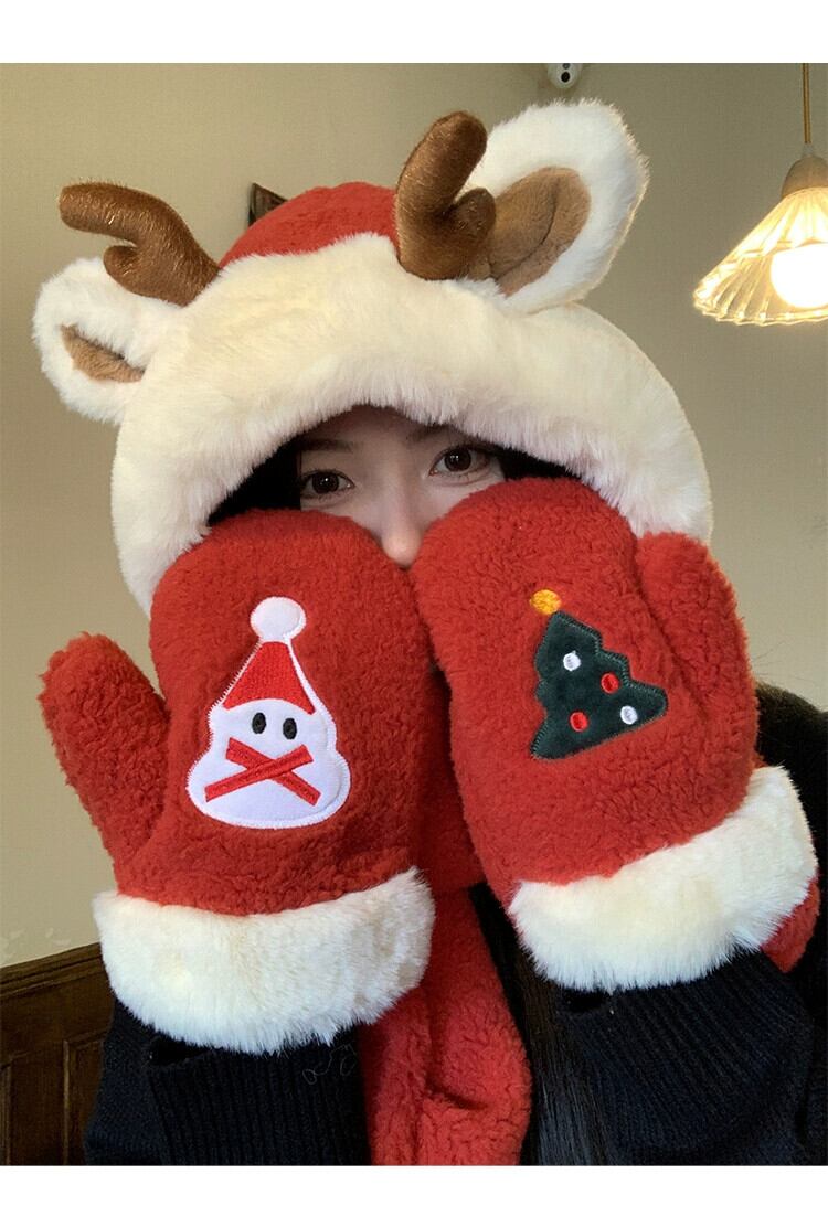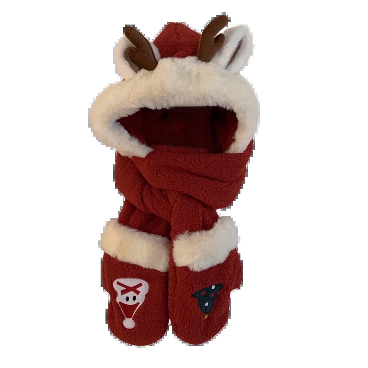 クリスマスレッドのぬいぐるみスカーフ、手袋、オールインワンのかわいいヘラジカの角が入った暖かく厚みのあるサイクリングスカーフとフード付きの3点セット 大人ガーリー スウィート キュート カジュアル 15dd73420389373