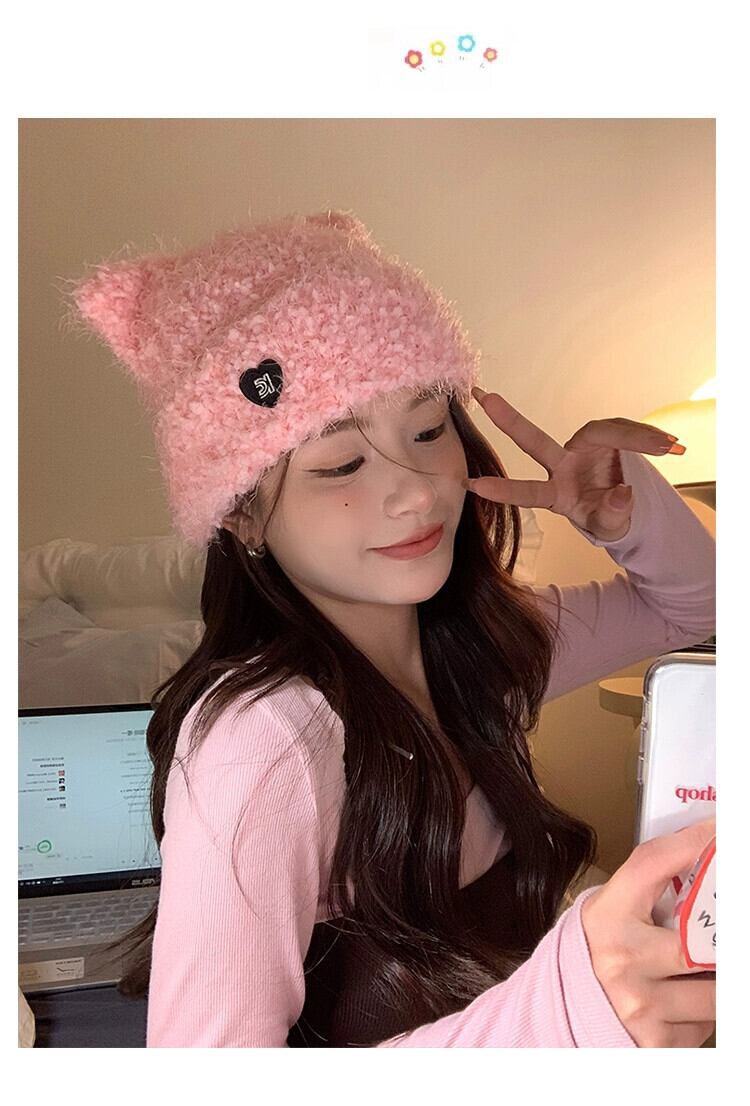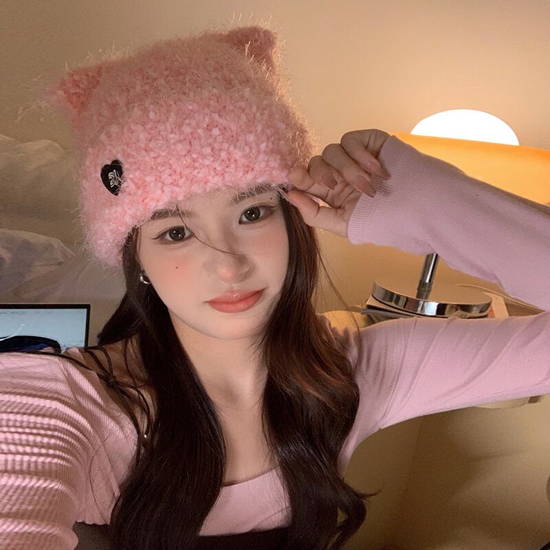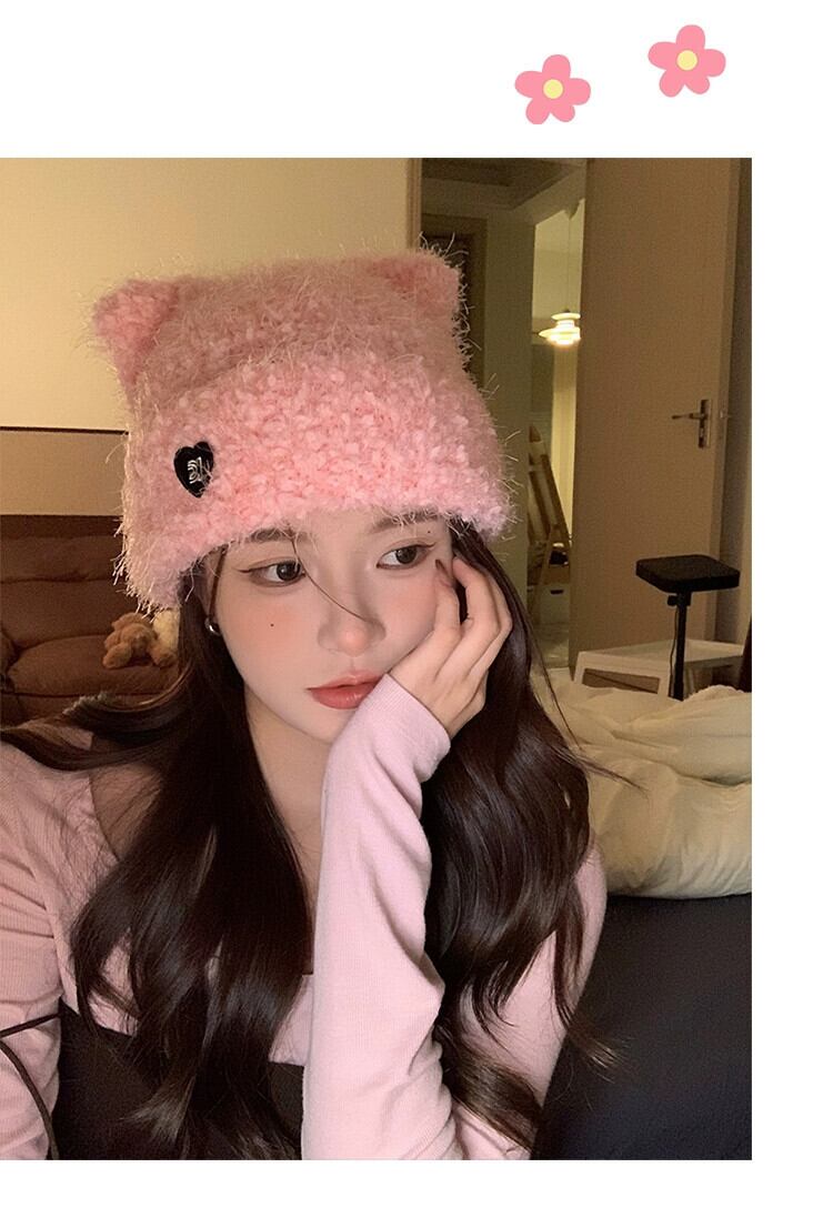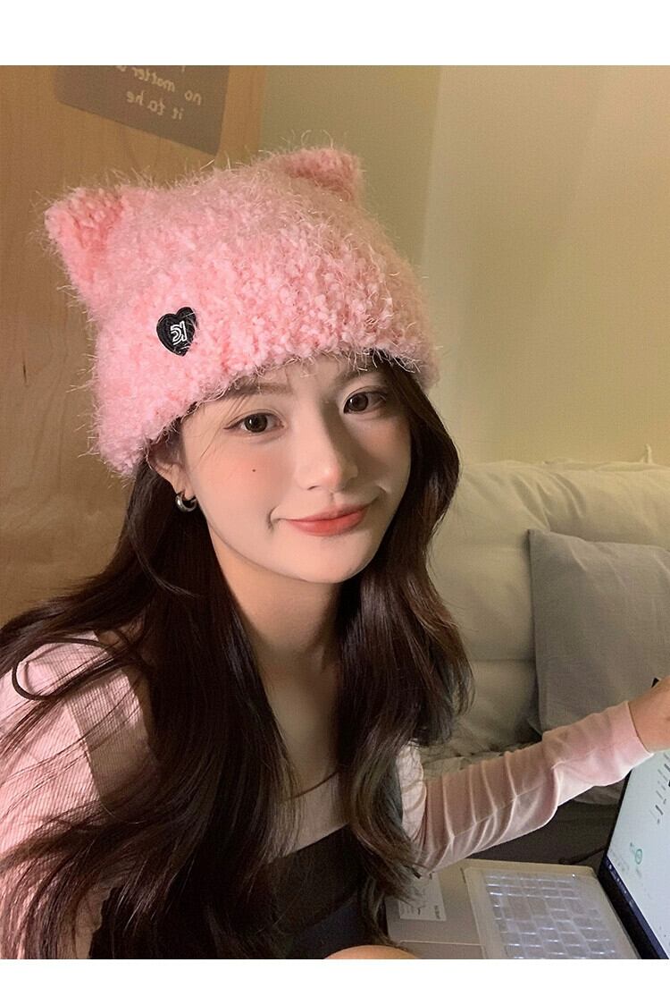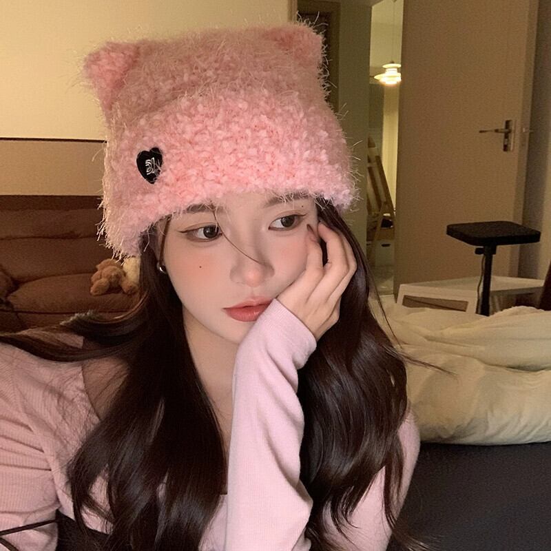 冬の帽子の女性のスタイル立体猫耳ニットウール帽子無地暖かいプルオーバー帽子ピンクの耳の保護 ウィンター 冬物 15dd66698768841