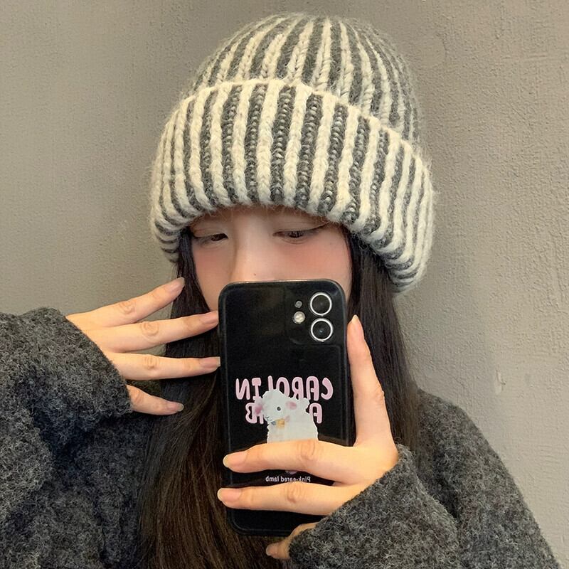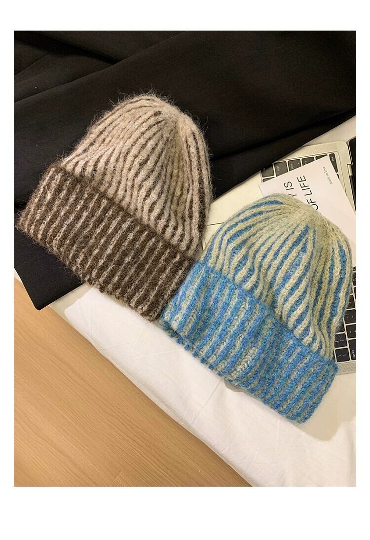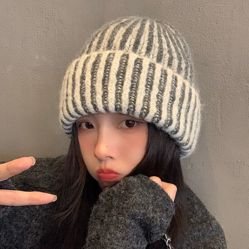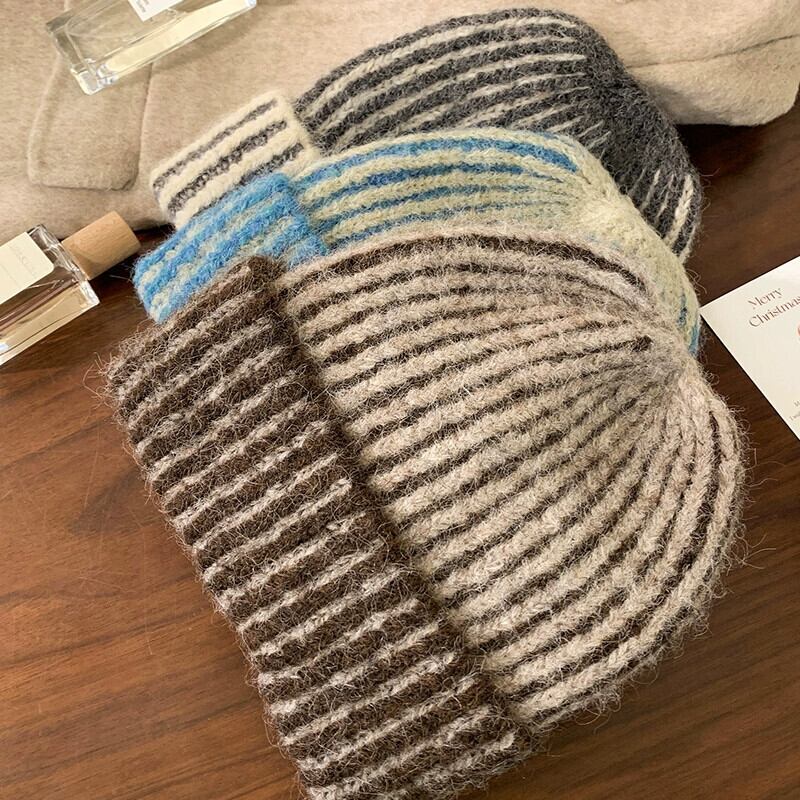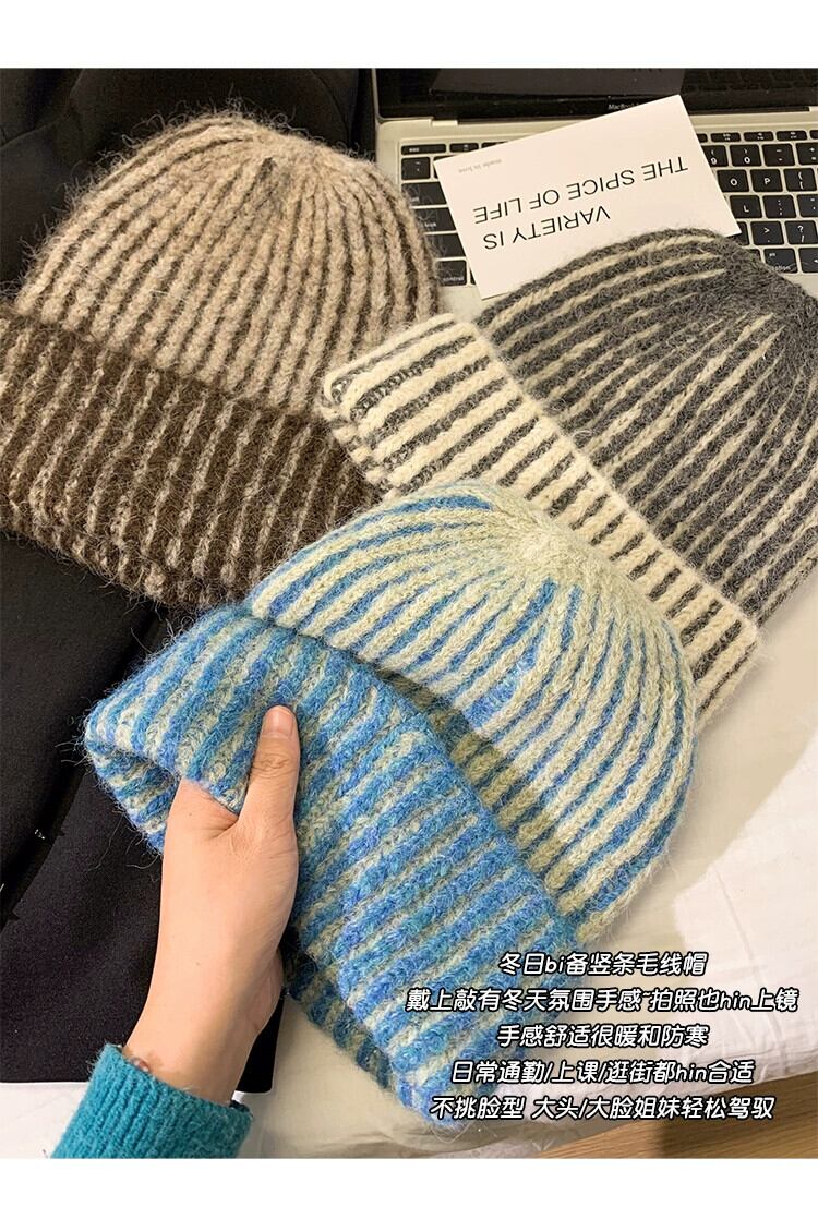 秋と冬のスタイルのウールニット帽子女性多用途の暖かい厚い包頭帽子、太い縦縞と大きな頭囲のコールドハット オータム 秋物 ウィンター 冬物 ストライプ 15dd48121480734
