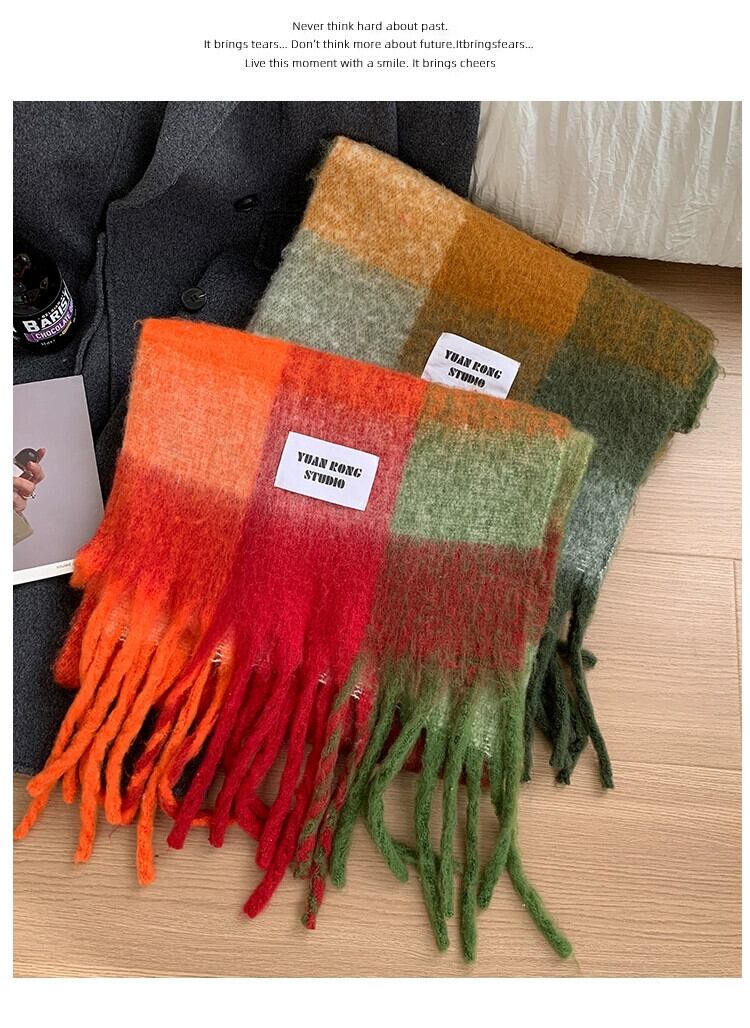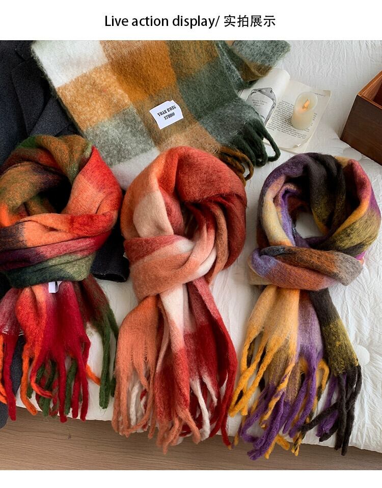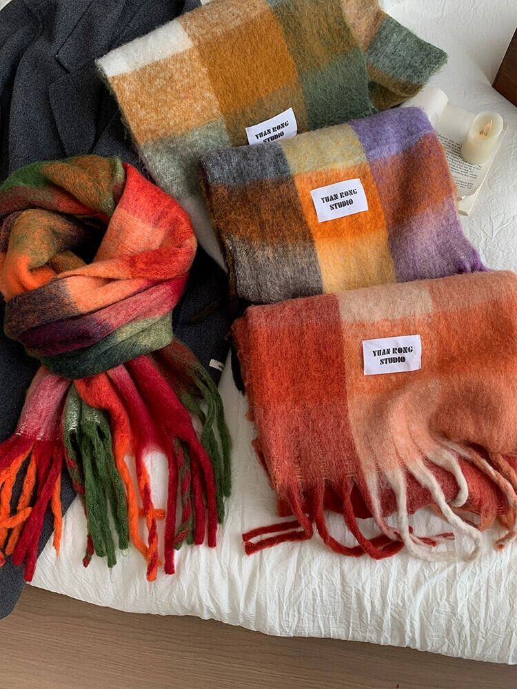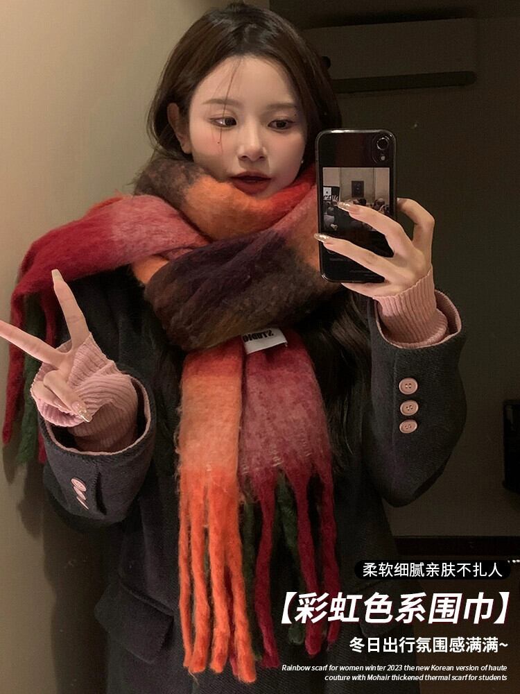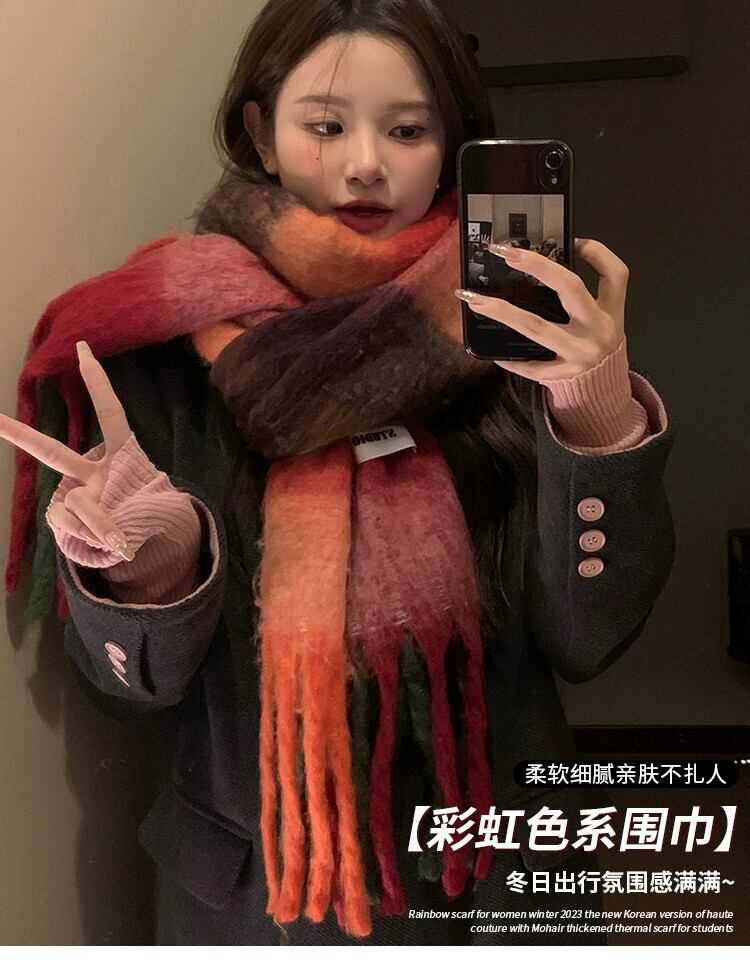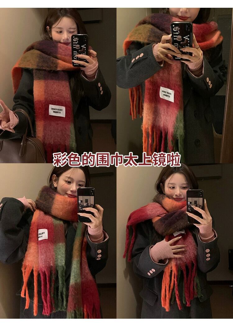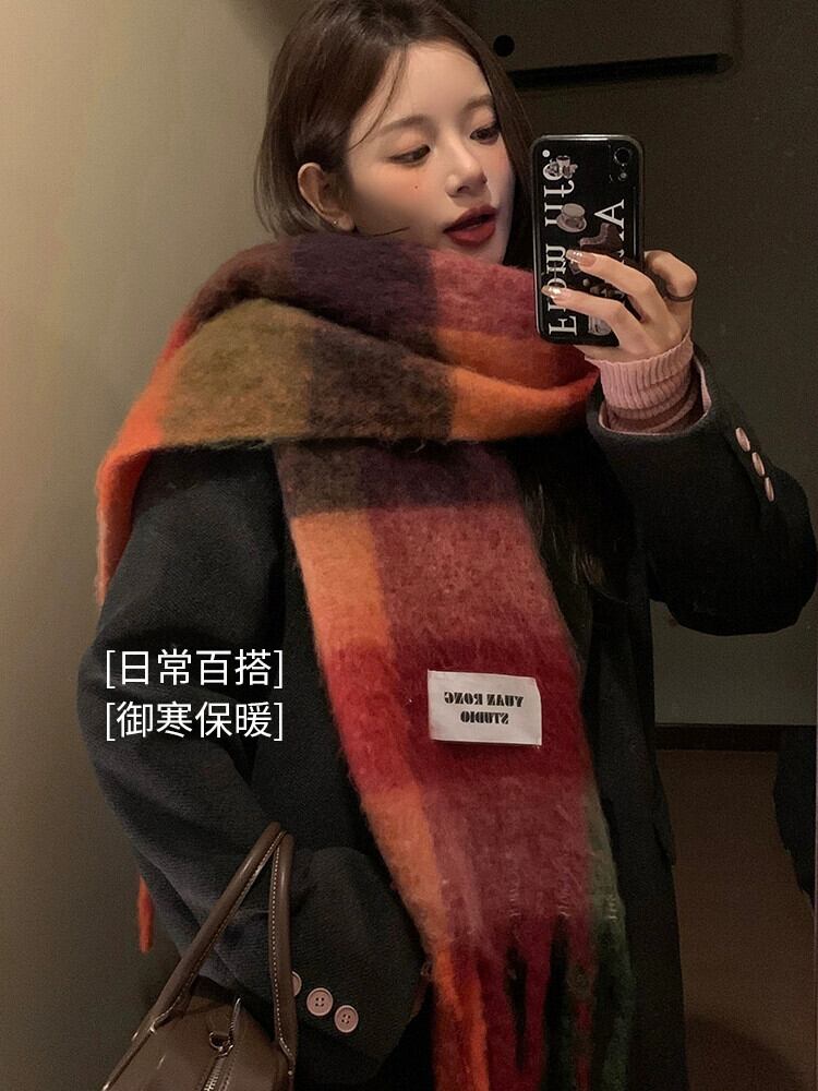 ese レインボーチェック柄スカーフ女性の冬 2023 新しいタツノオトシゴの毛暖かく防風兼用ショール電話スカーフ ウィンター 冬物 15dd99877996819