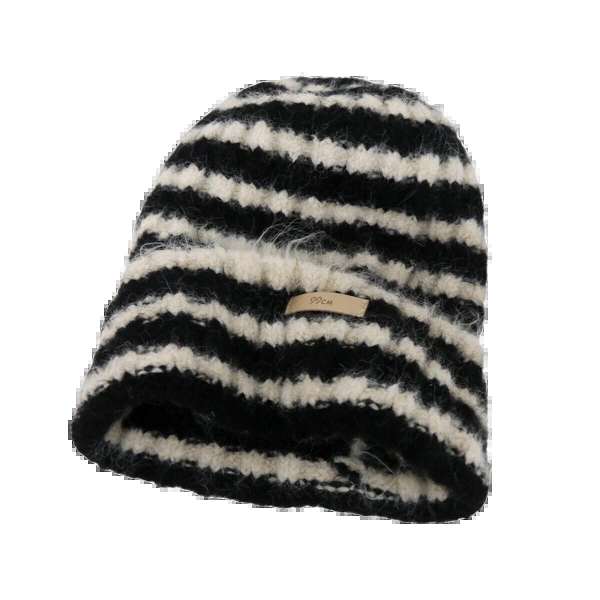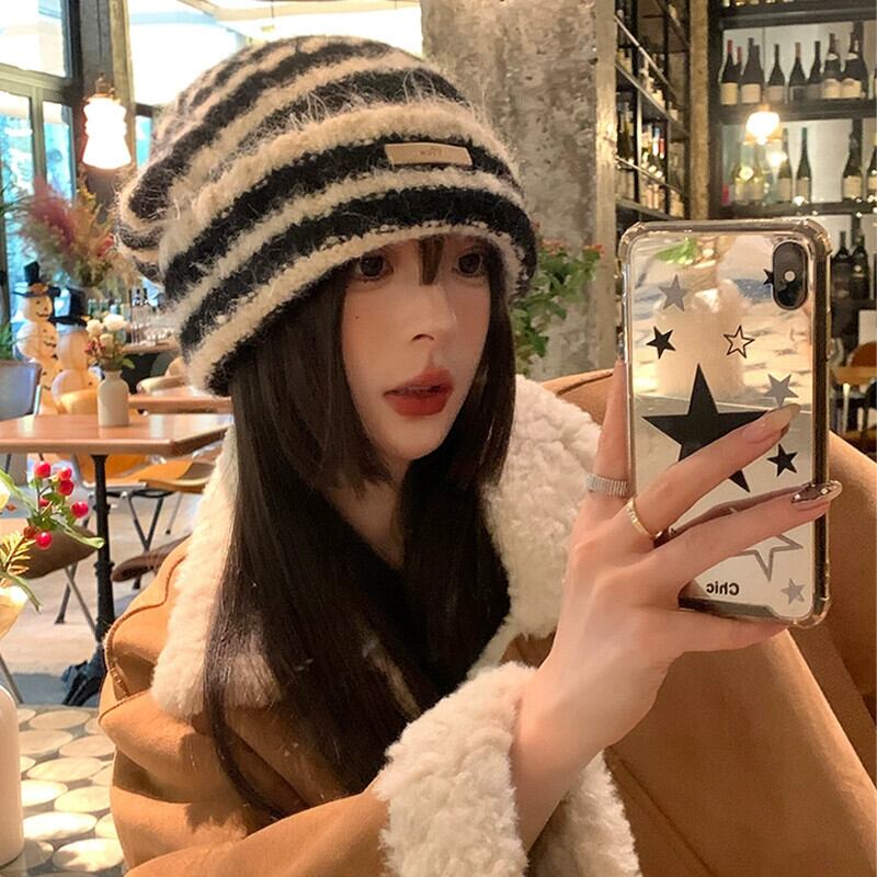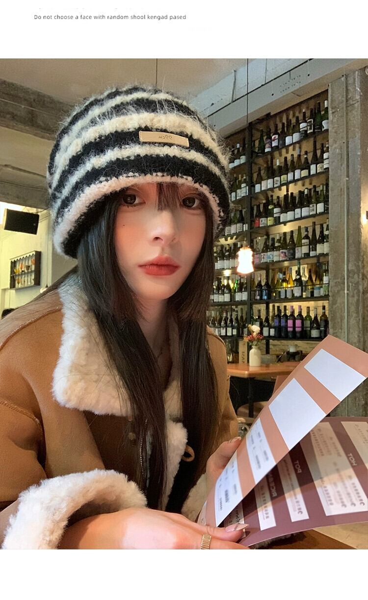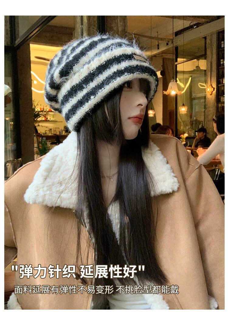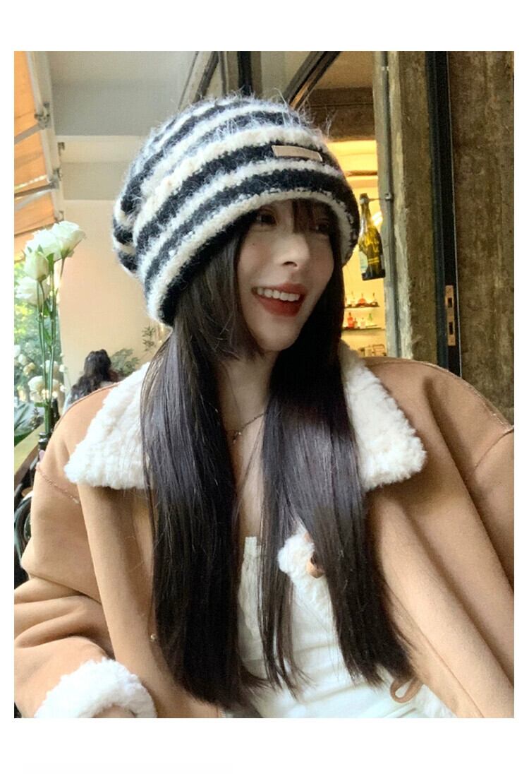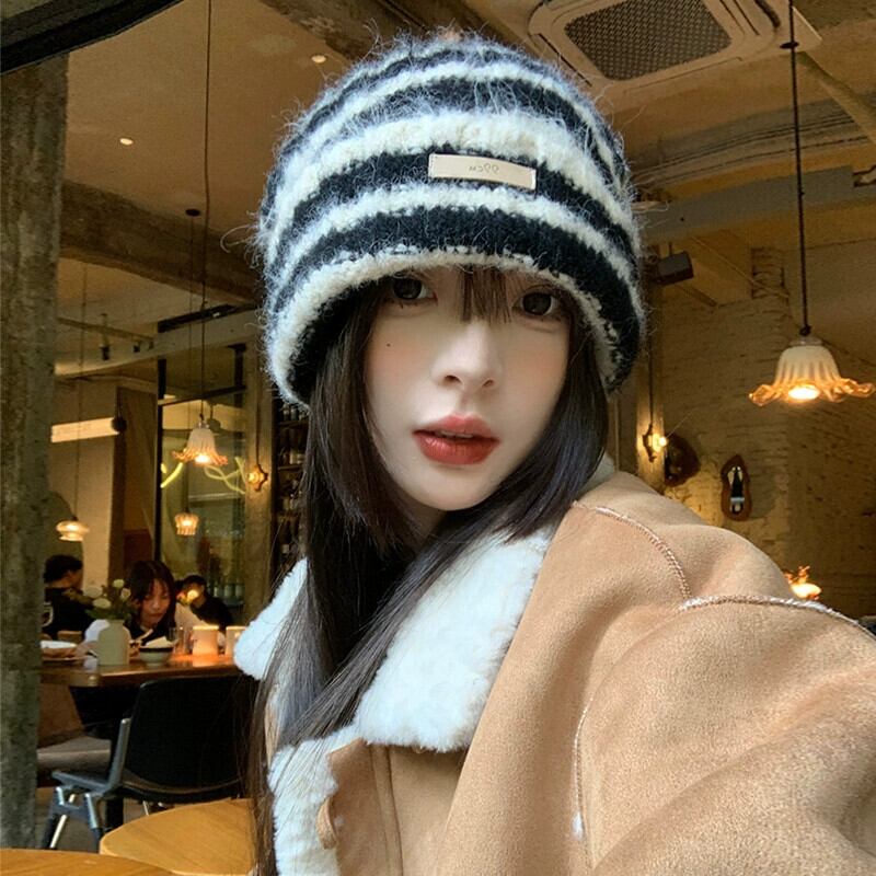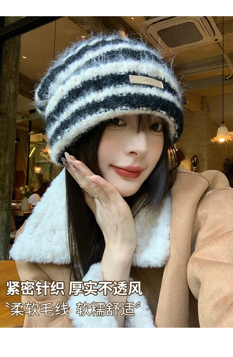秋と冬のスタイルのウールの帽子の女性新しいスタイルの小さなストライプのニットパイル帽子は、暖かく保ち、大きな頭囲と耳の保護で厚くなります。 オータム 秋物 ウィンター 冬物 15dd4284893429