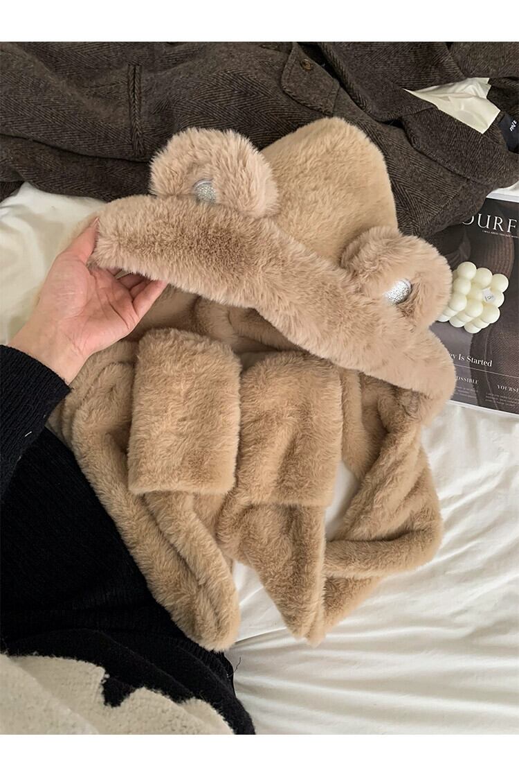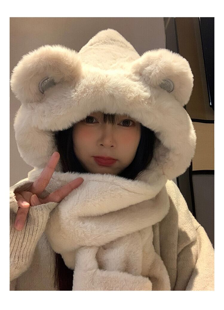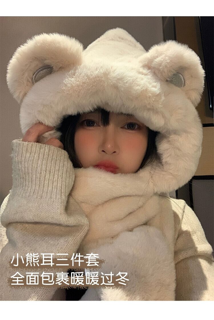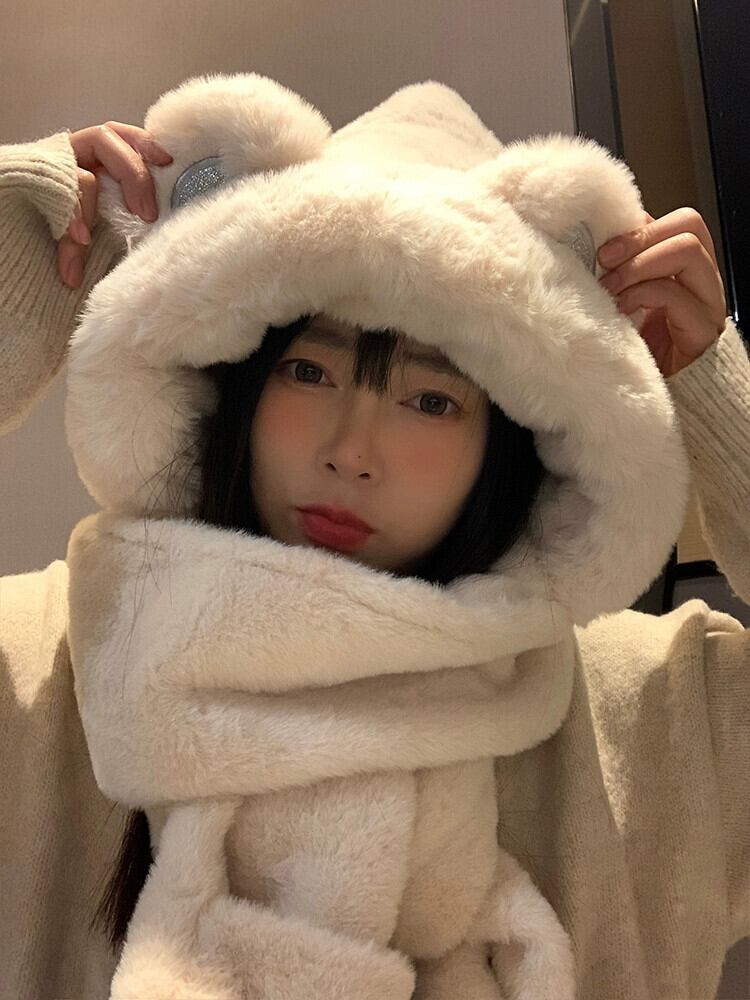 冬用のクマの帽子とスカーフのオールインワンレディース、キュートで多用途、顔出し、ぬいぐるみ、防寒サイクリングスカーフと手袋のオールインワン 大人ガーリー スウィート カジュアル ウィンター 冬物 15dd50333587035
