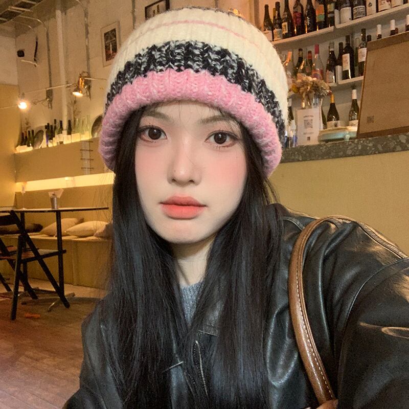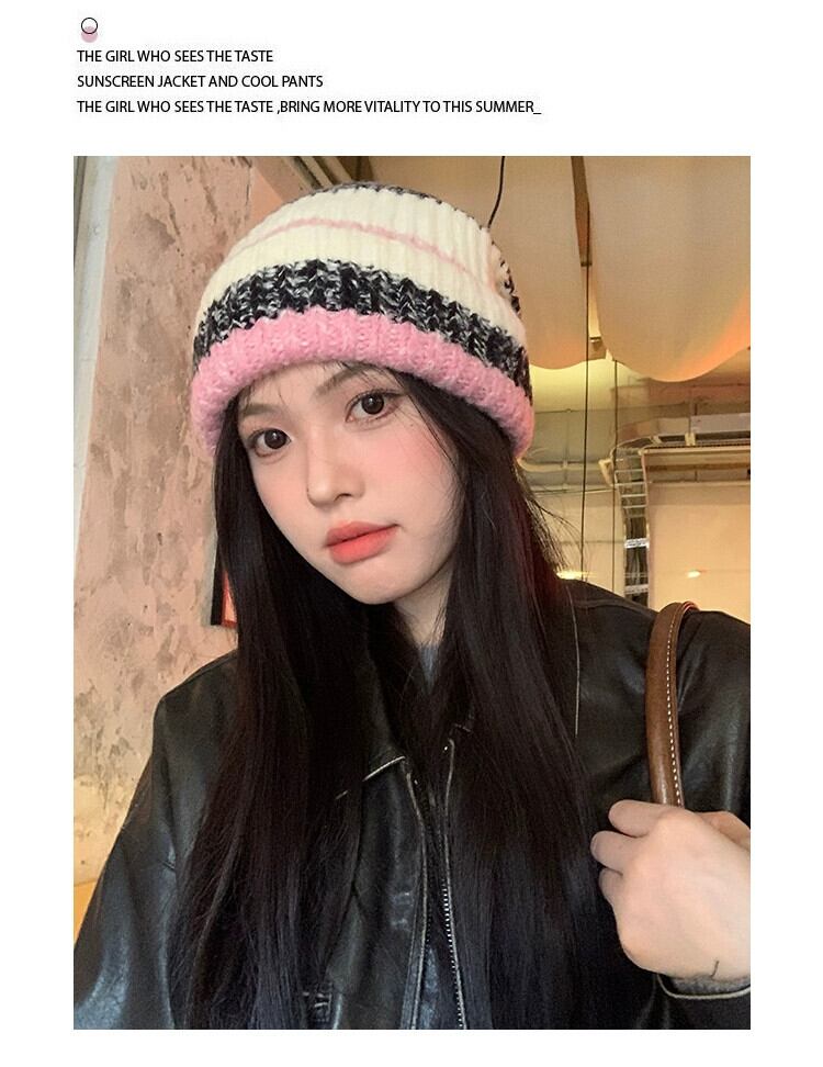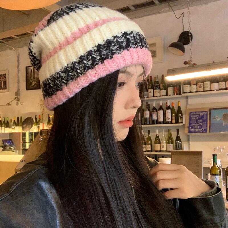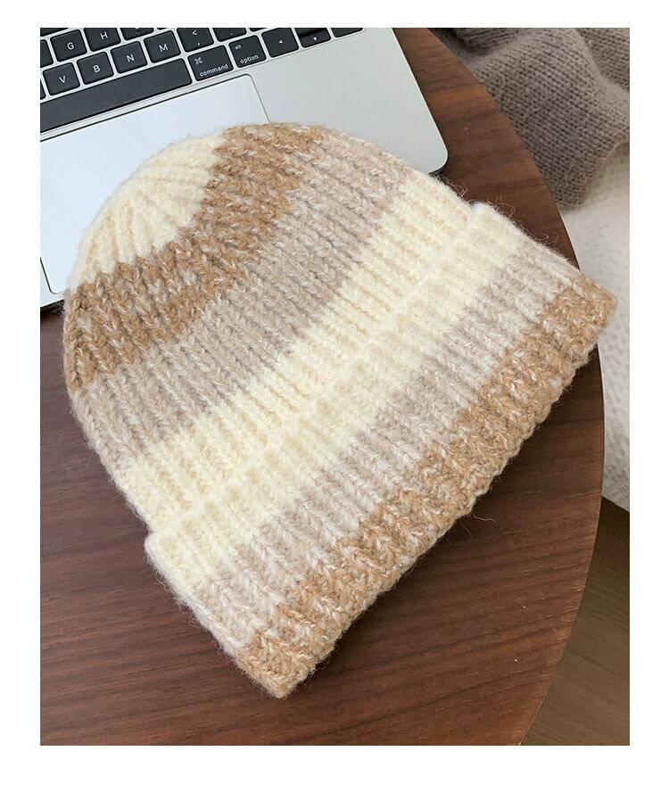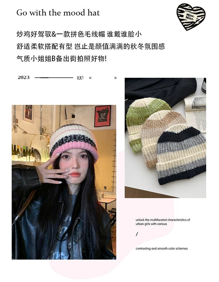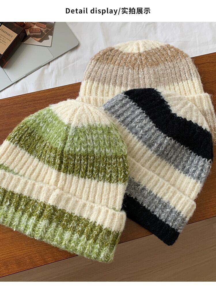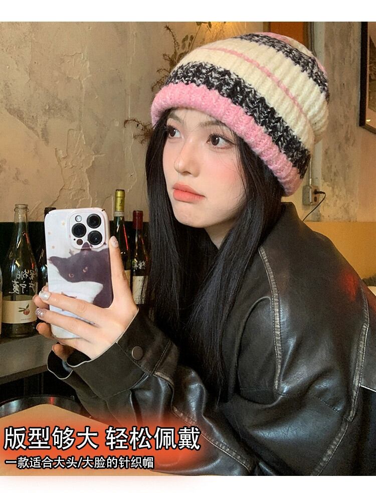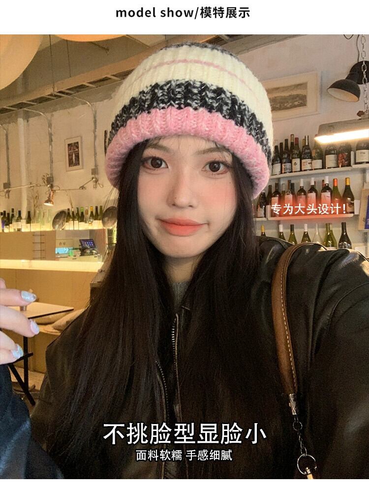 ストライプウールの帽子の女性 2023 新しい冬スタイル暖かい耳保護西洋スタイルニット帽子大きな頭囲耳保護帽子 ウィンター 冬物 15dd69105019463