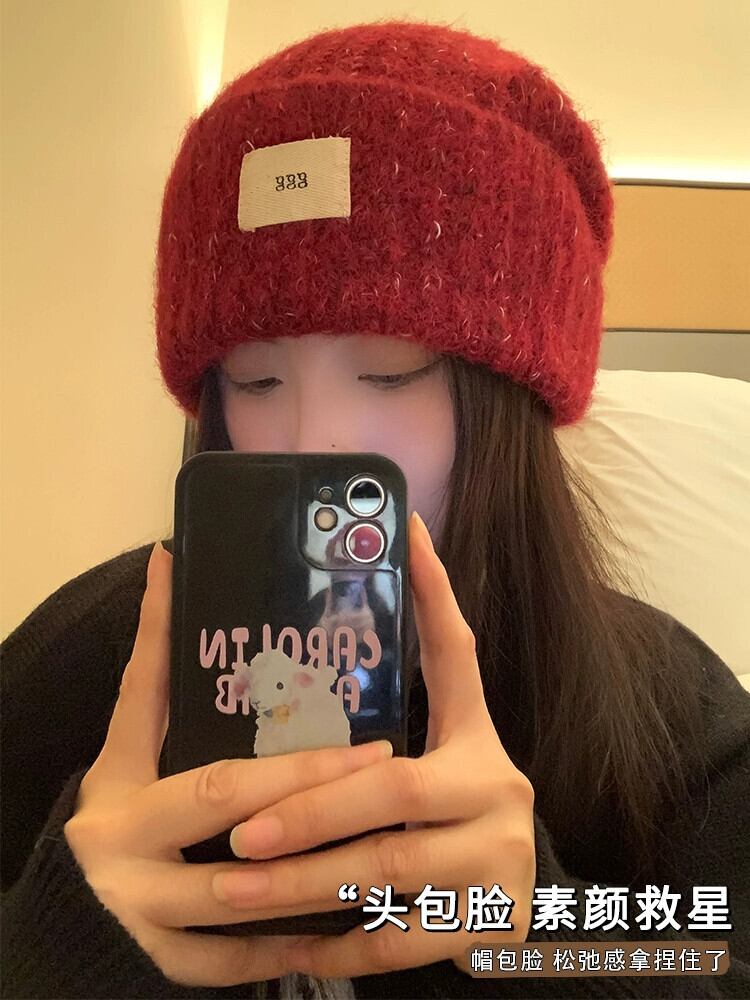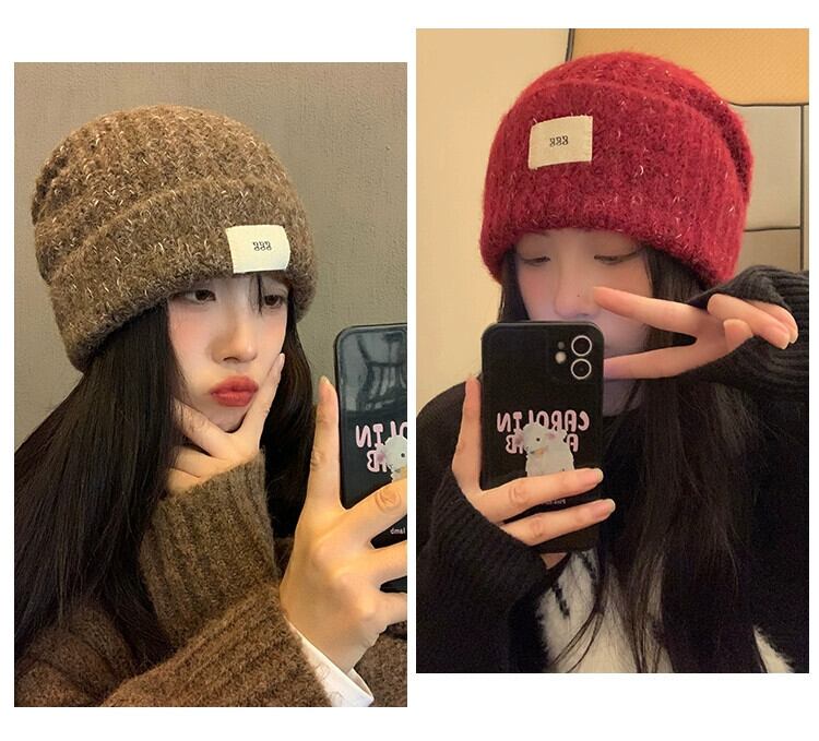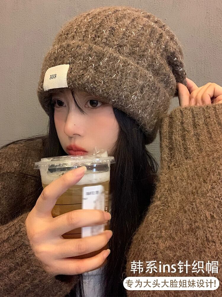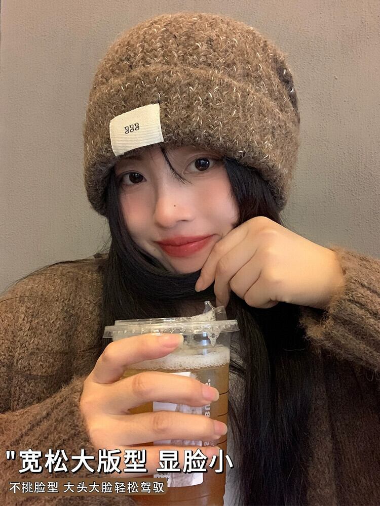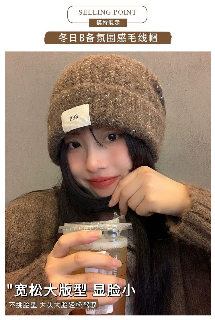 布ラベルニット帽女性冬の緩い大きな頭囲暖かい肥厚パイル帽子無地多用途小さなウールの帽子顔を見せて ウィンター 冬物 ソリッドカラー 15dd42809689434