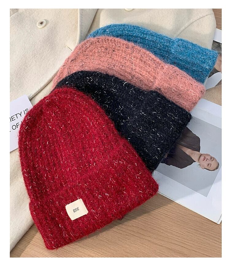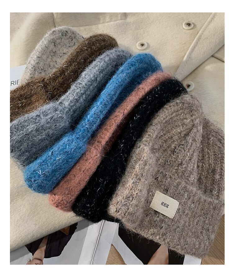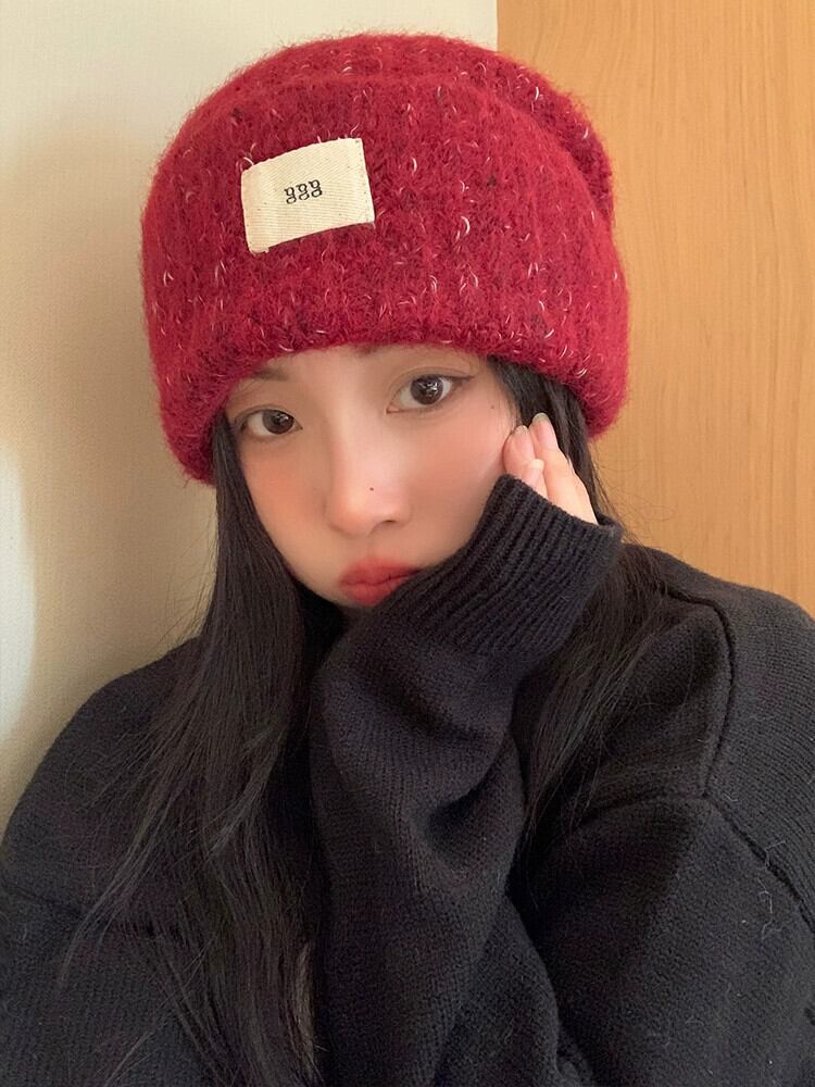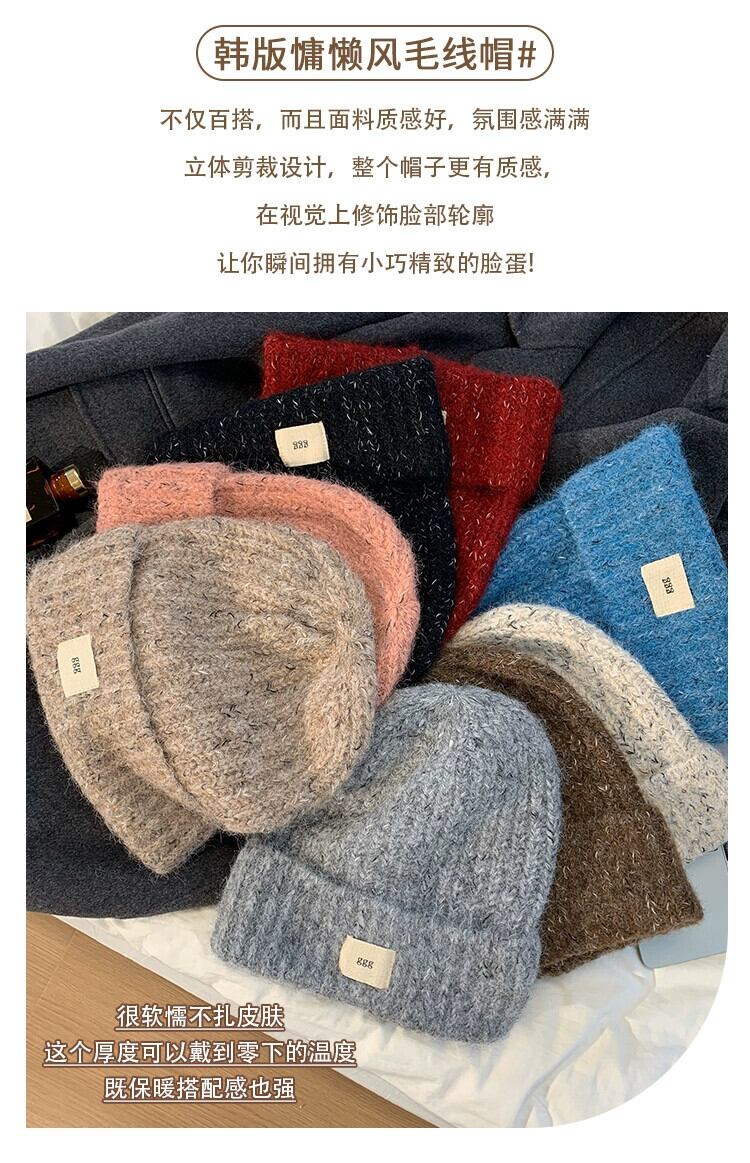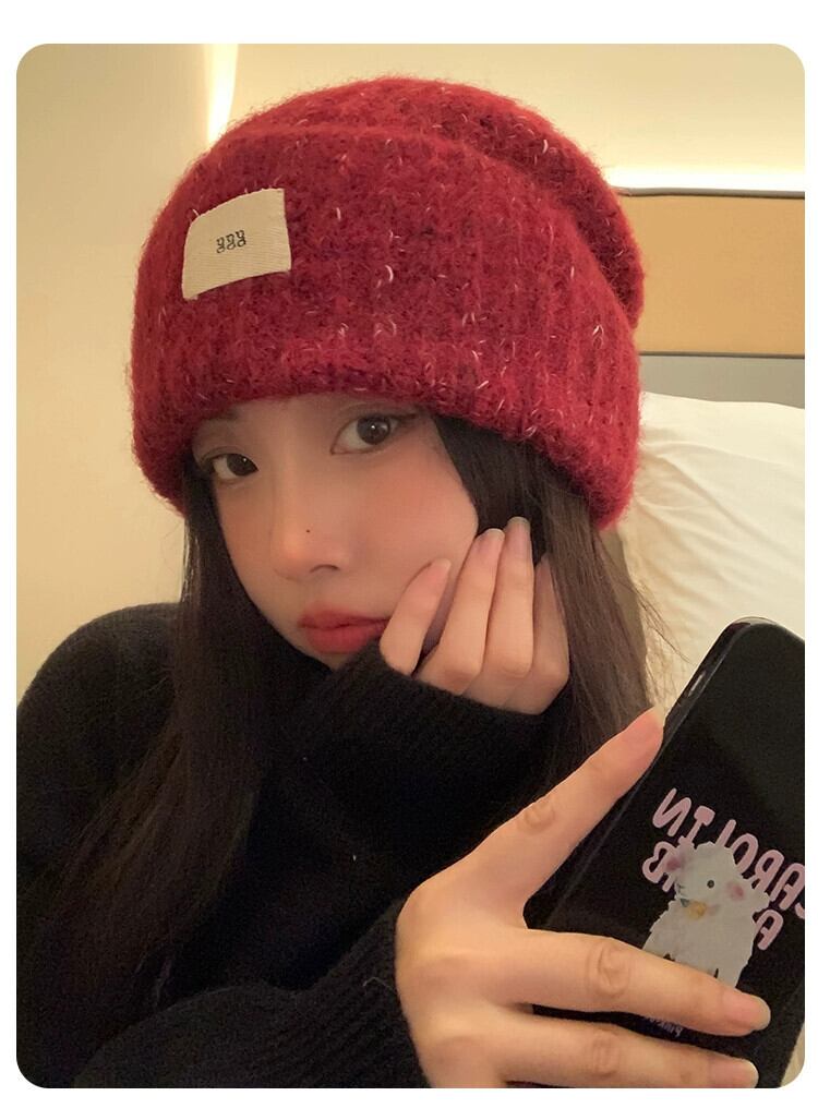 布ラベルニット帽女性冬の緩い大きな頭囲暖かい肥厚パイル帽子無地多用途小さなウールの帽子顔を見せて ウィンター 冬物 ソリッドカラー 15dd42809689434