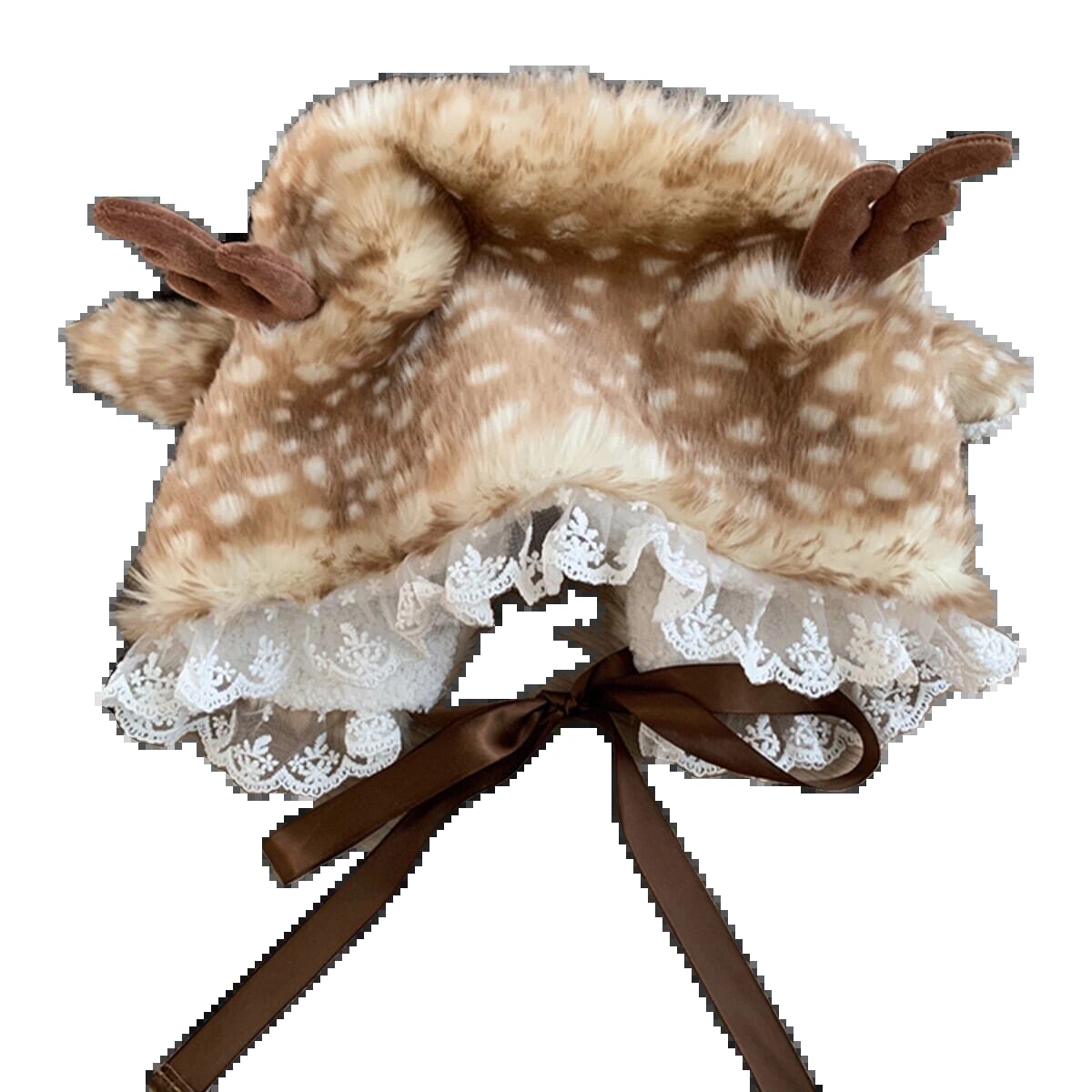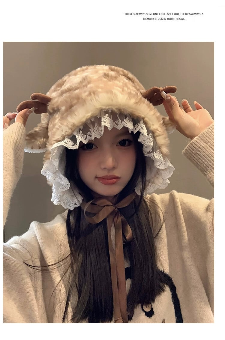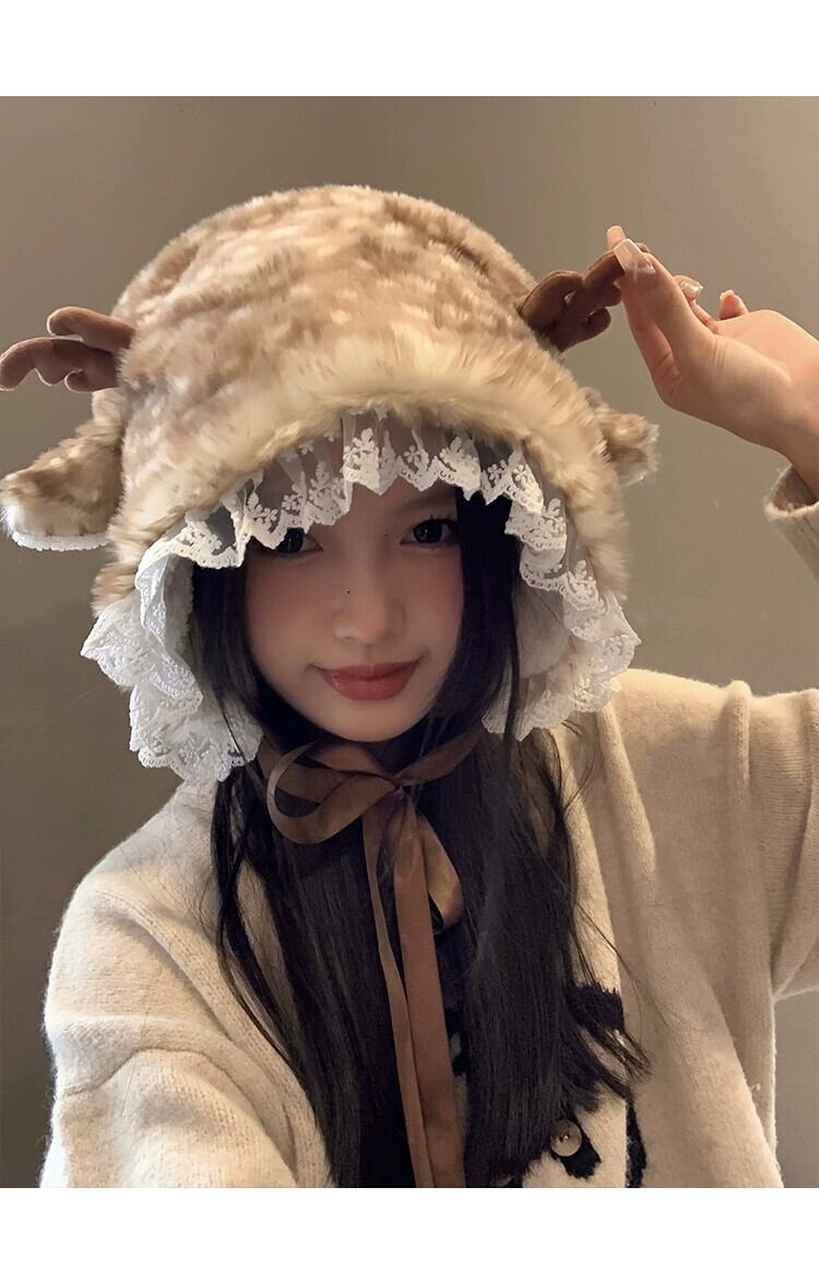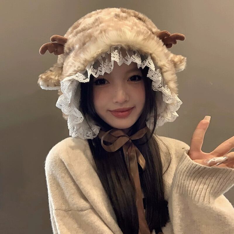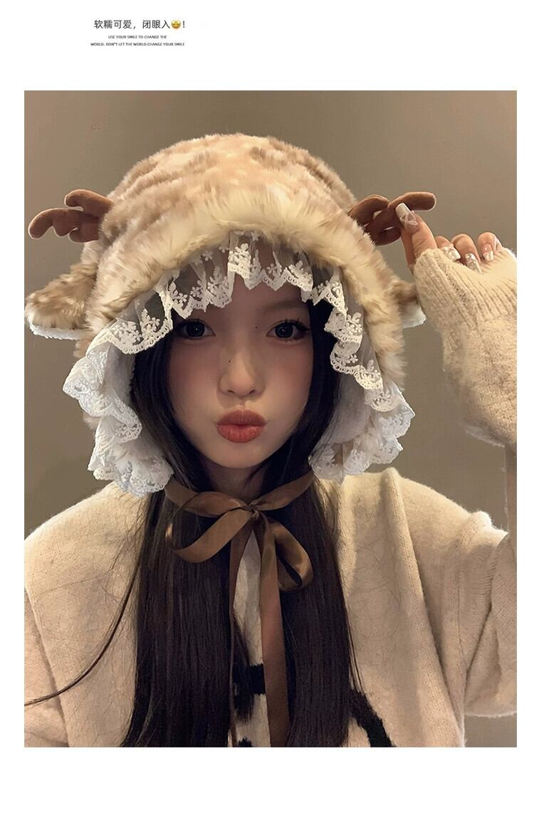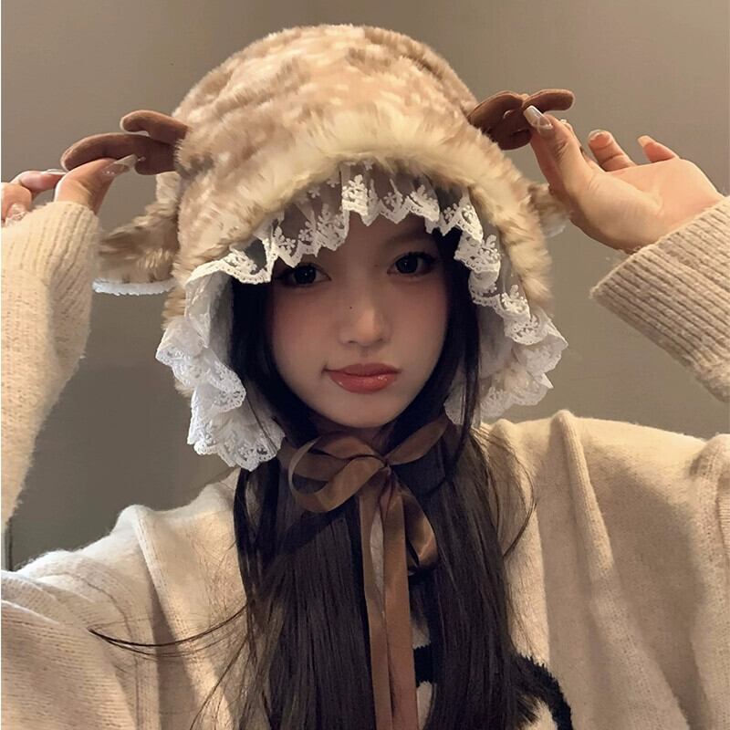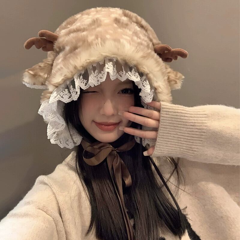 かわいい小さなウールのベルベットの帽子女性冬バージョン顔小さな暖かく厚みのある耳保護雷峰帽子レース包頭帽子 大人ガーリー スウィート キュート カジュアル ウィンター 冬物 15dd76680842041
