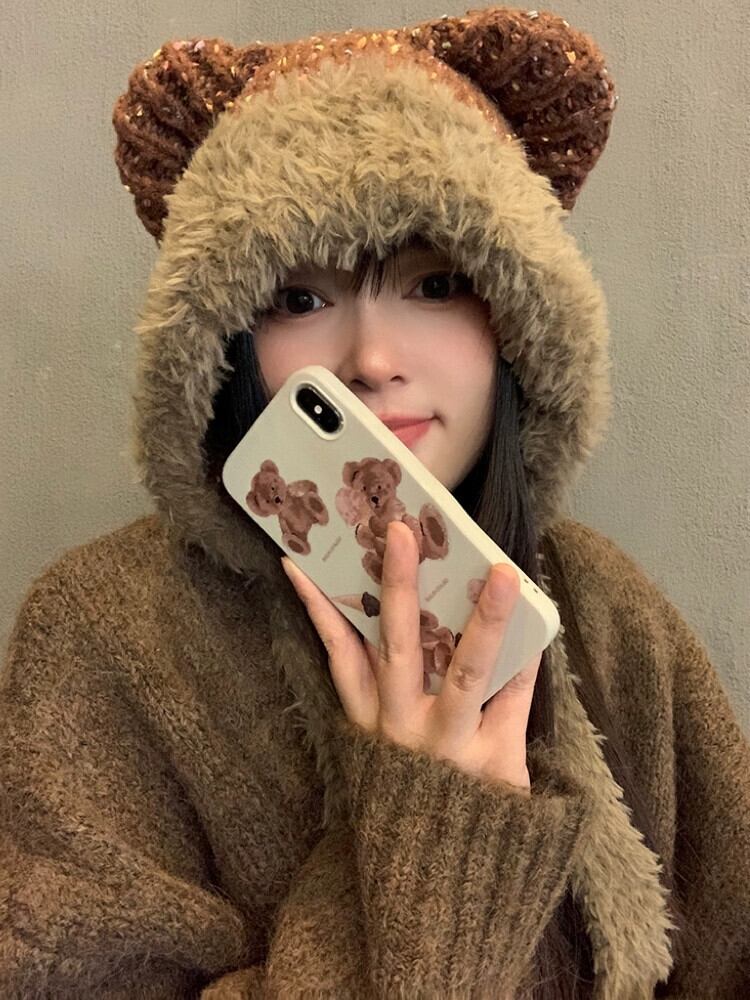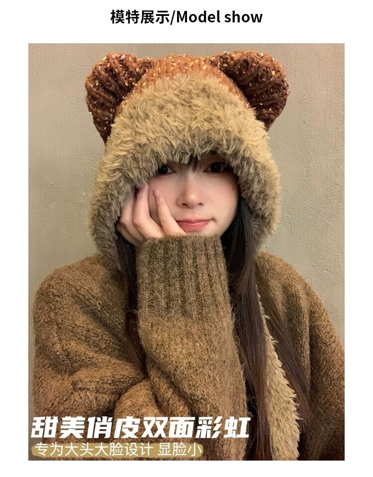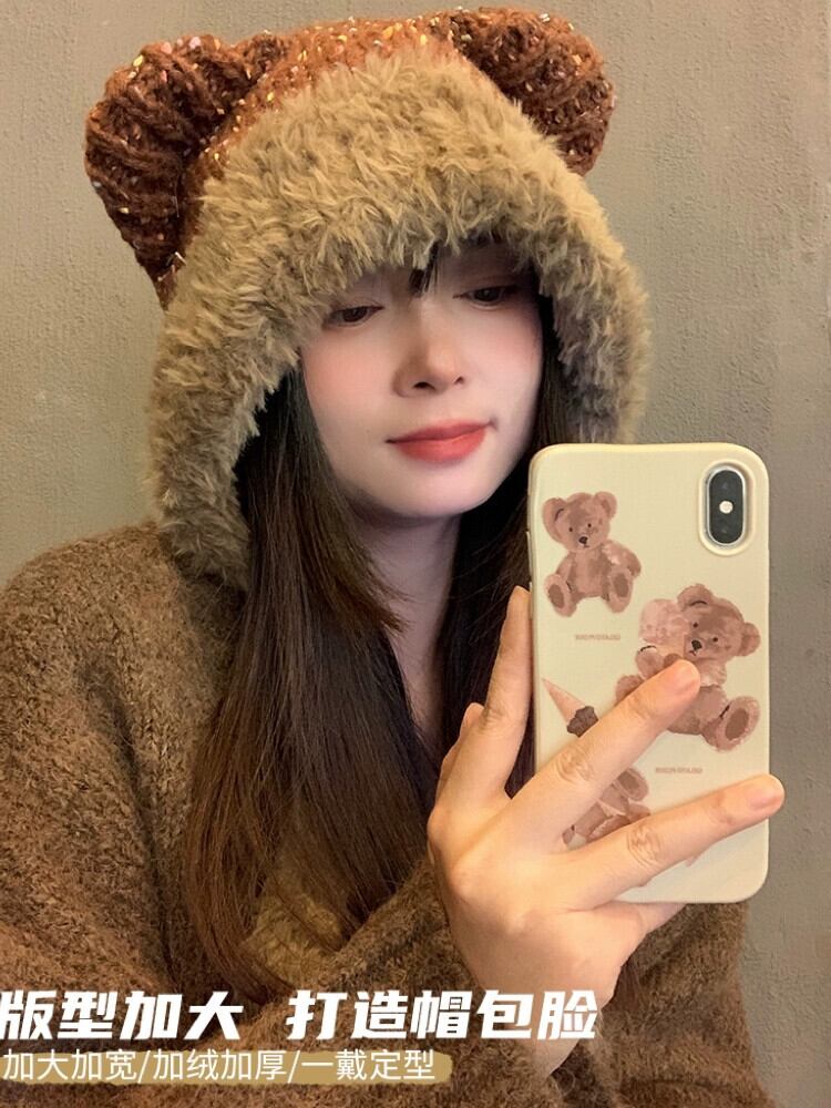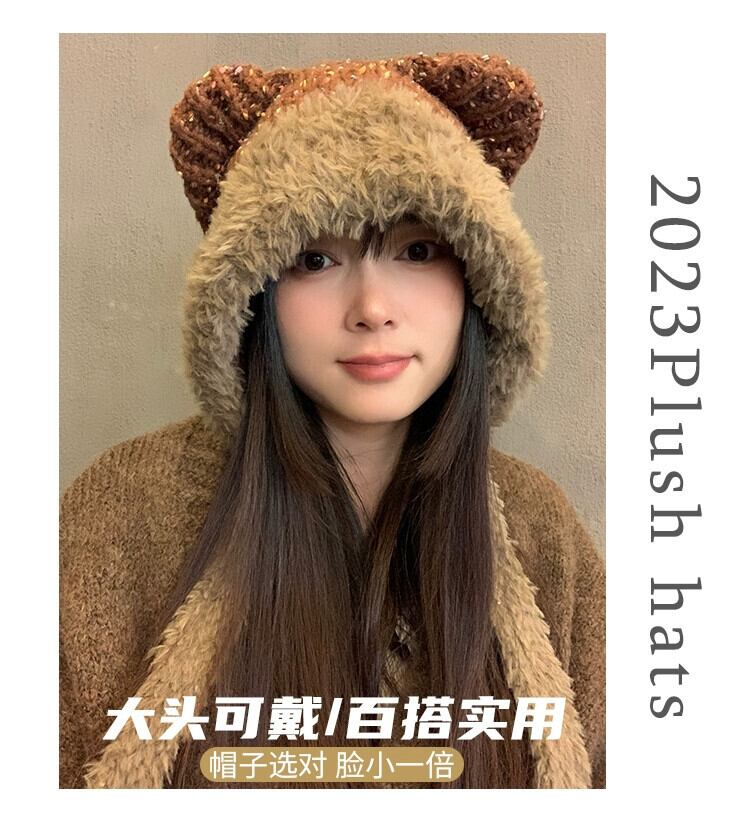 かわいいクマの耳ぬいぐるみ帽子女性秋冬 2023 新しい暖かくて多用途な防寒耳保護帽子 大人ガーリー スウィート キュート カジュアル オータム 秋物 ウィンター 冬物 15dd93102039408