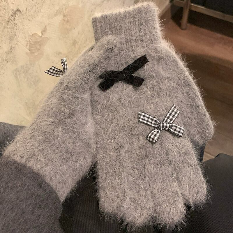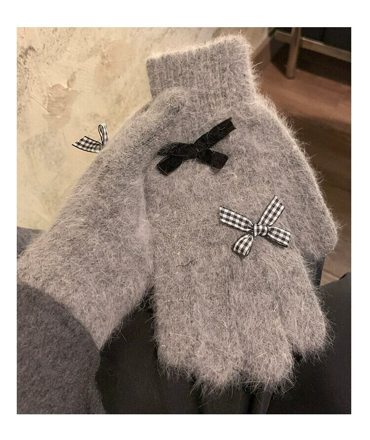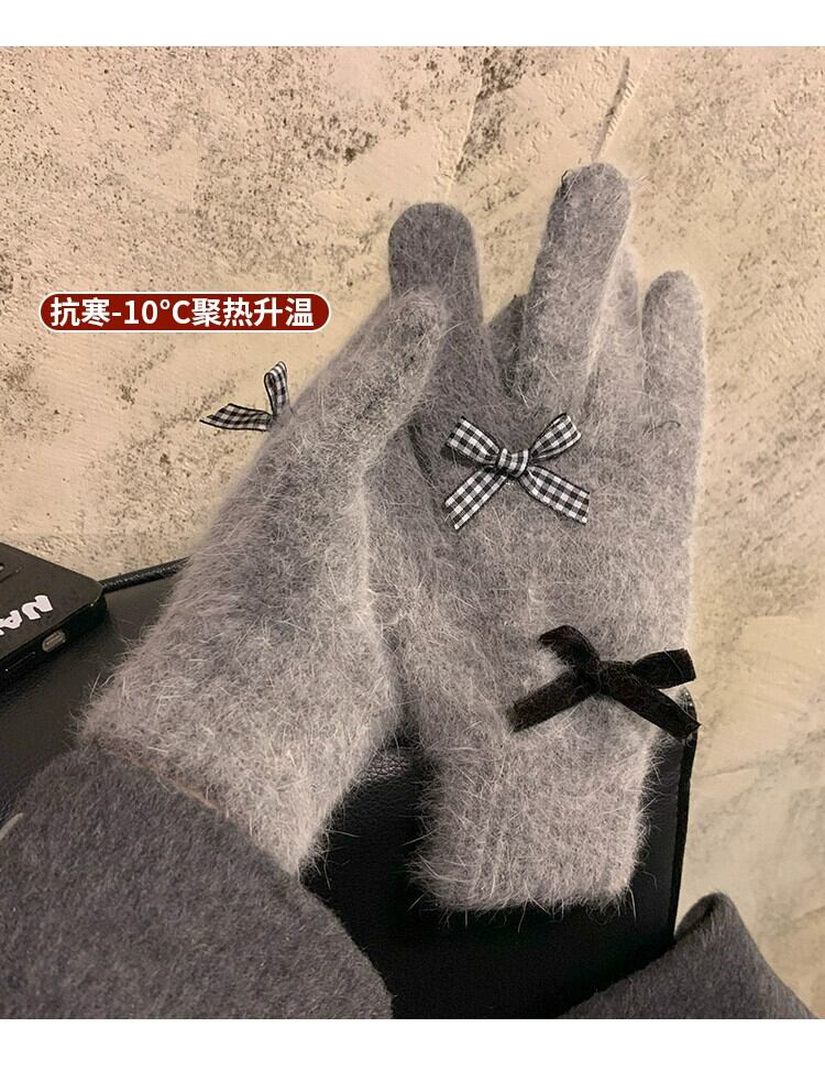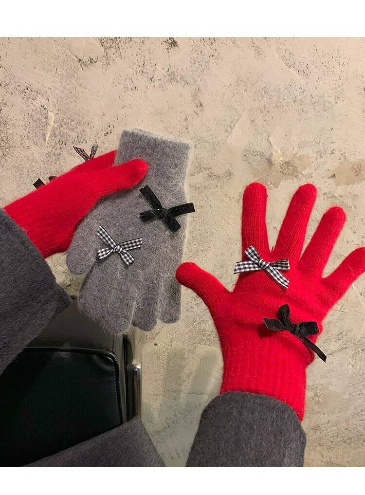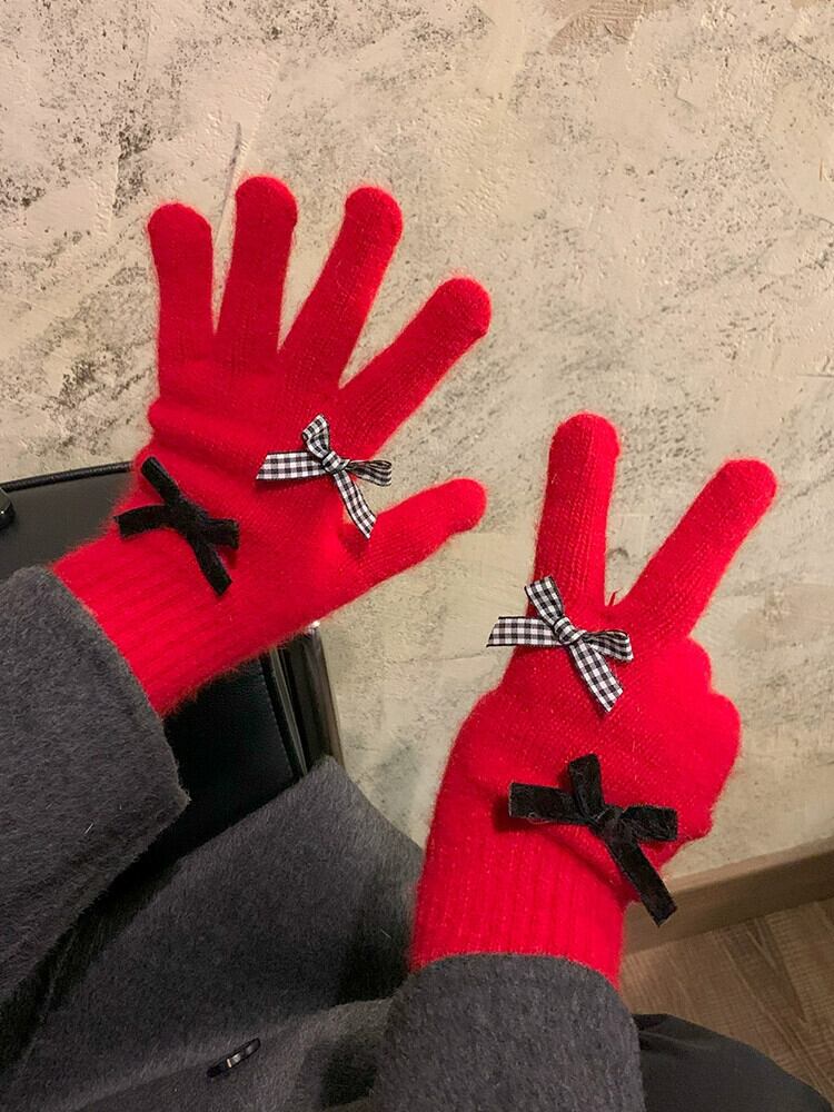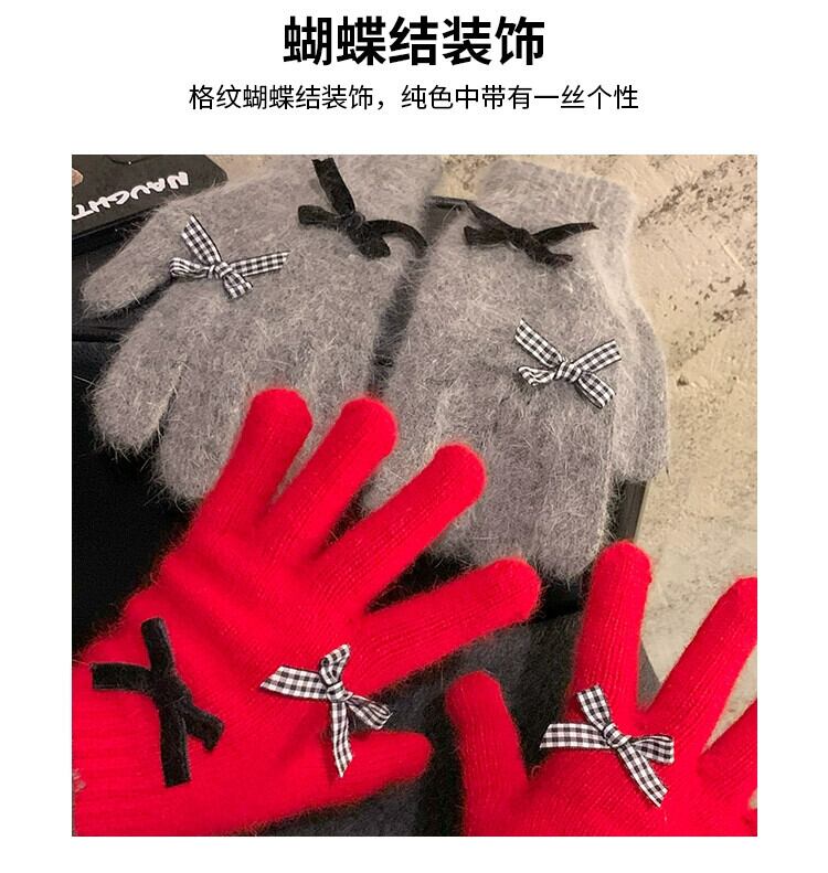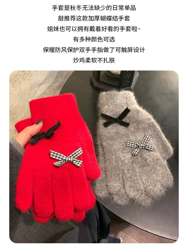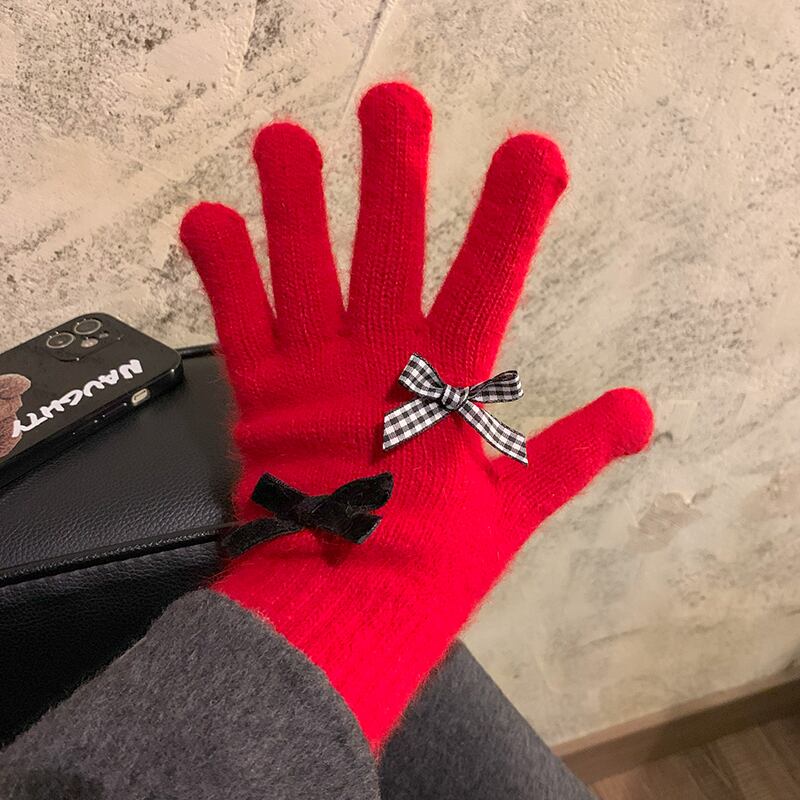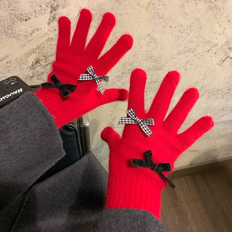 赤いリボン手袋女性冬、ベルベット、暖かく、かわいいと防風 2023 新しいスタイルのサイクリング学生 5 本の指 レッド 大人ガーリー スウィート キュート カジュアル ウィンター 冬物 15dd60147322685