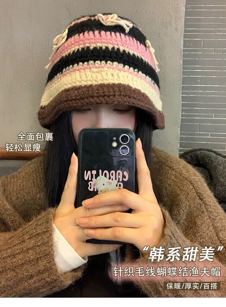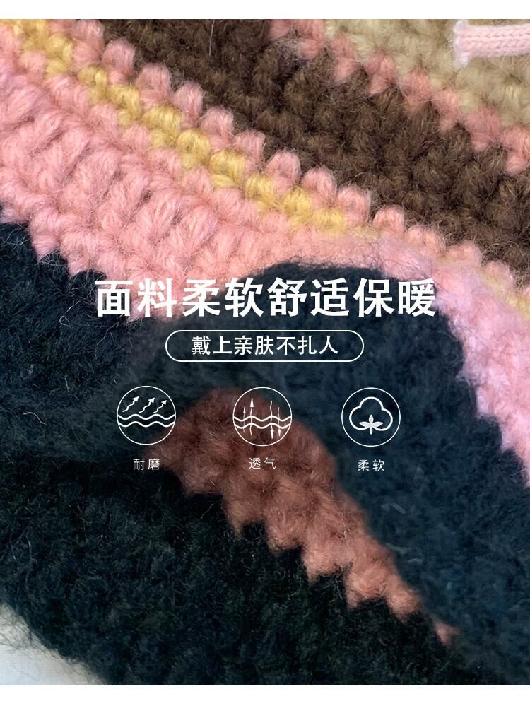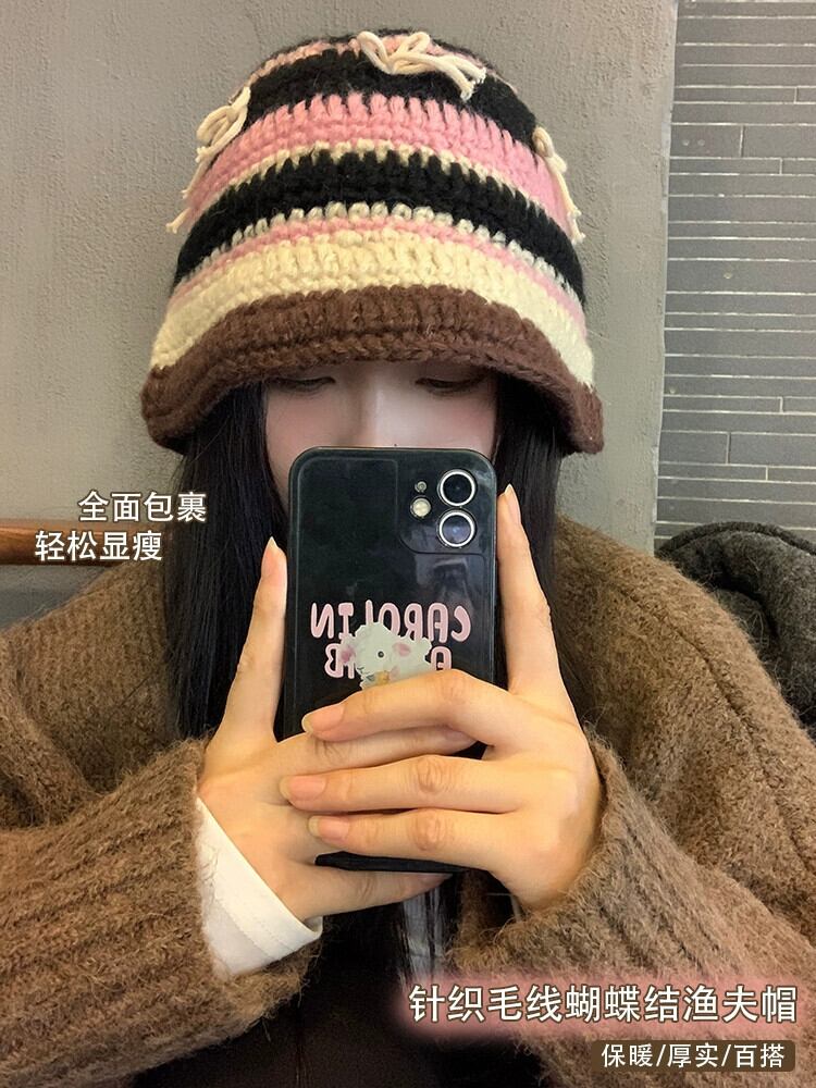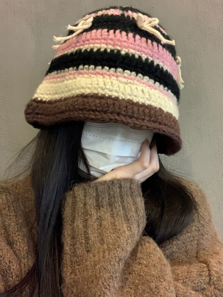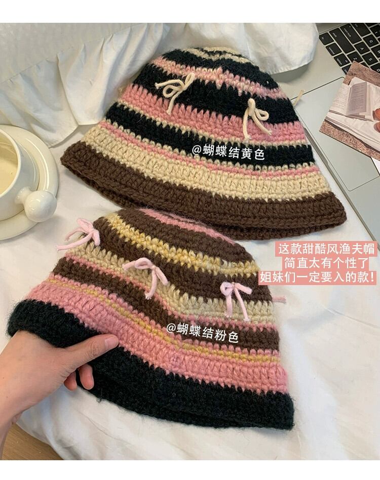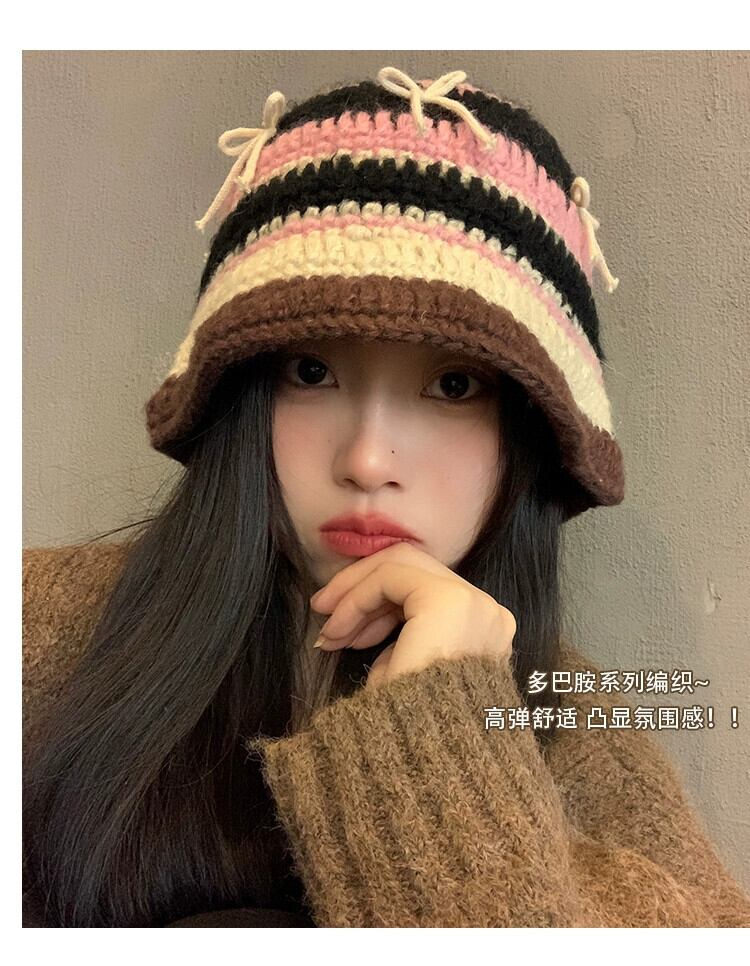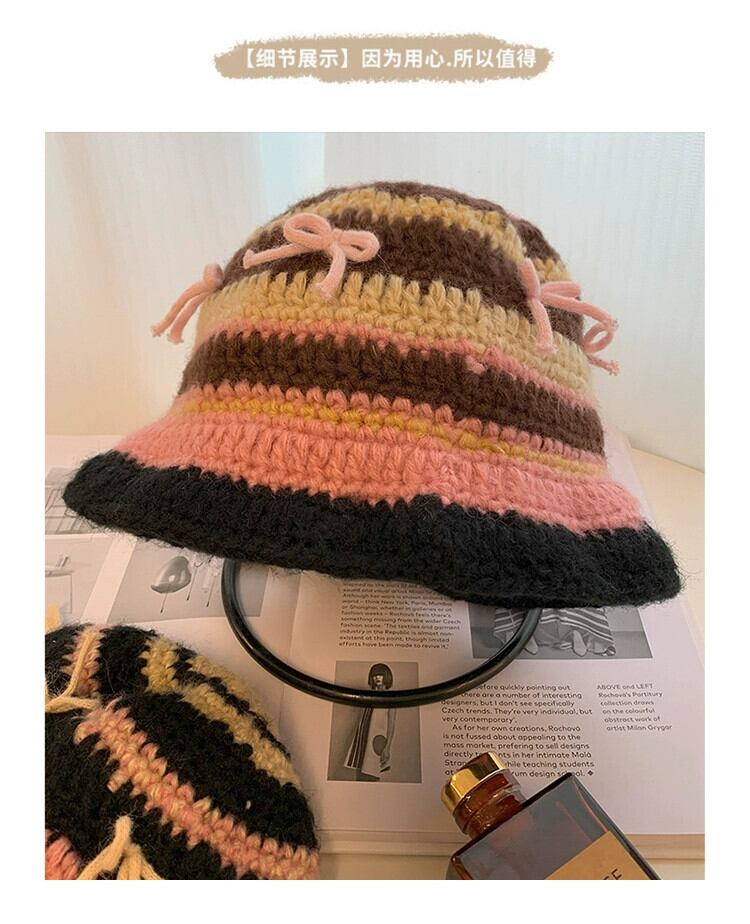 レトロなリボンストライプの漁師の帽子、女性の冬のニッチな対照的なウールの帽子、暖かく厚みのある手編みの盆地帽子 ウィンター 冬物 15dd41496397750