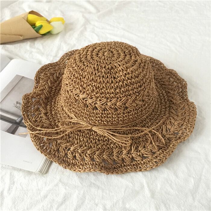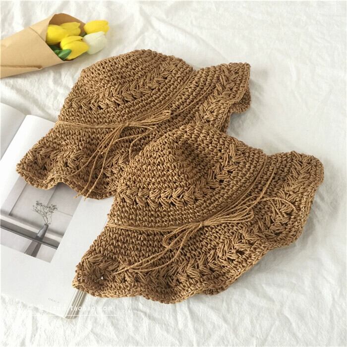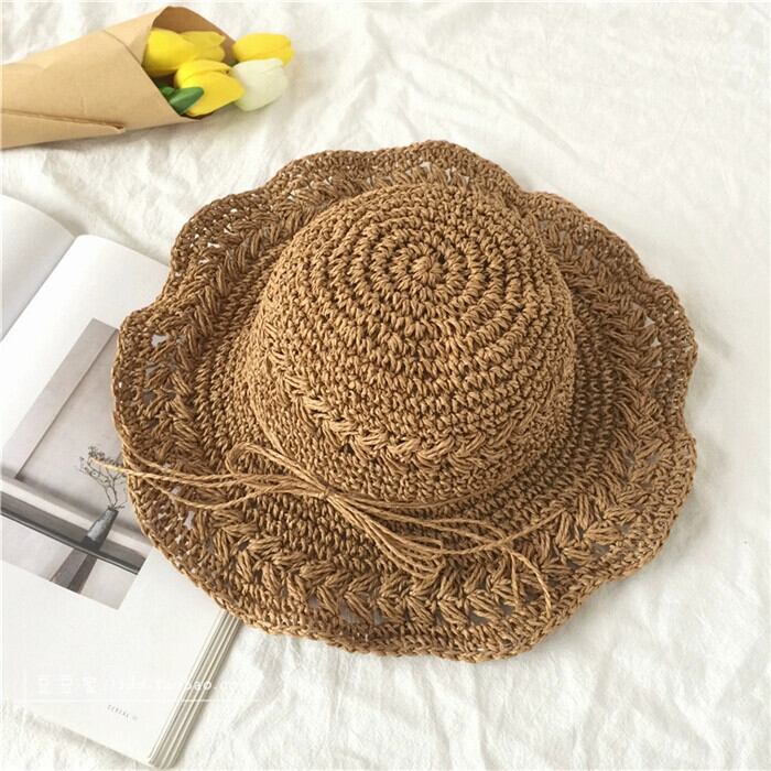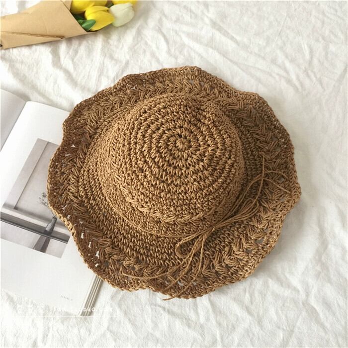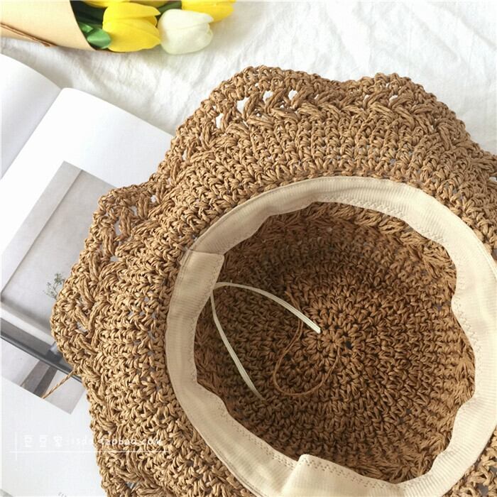 大きなつば手作りかぎ針編み中空麦わら帽子夏旅行漁師の帽子弓盆地帽子ビーチサンハット女性の流行 リボン サマー 夏物 15dd85877806665