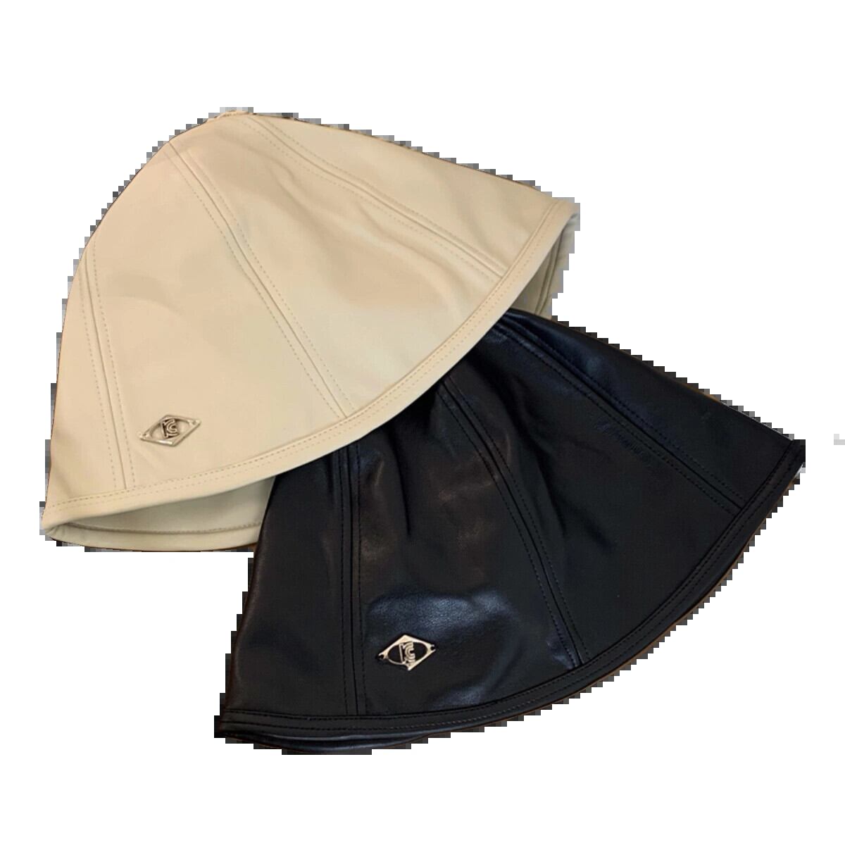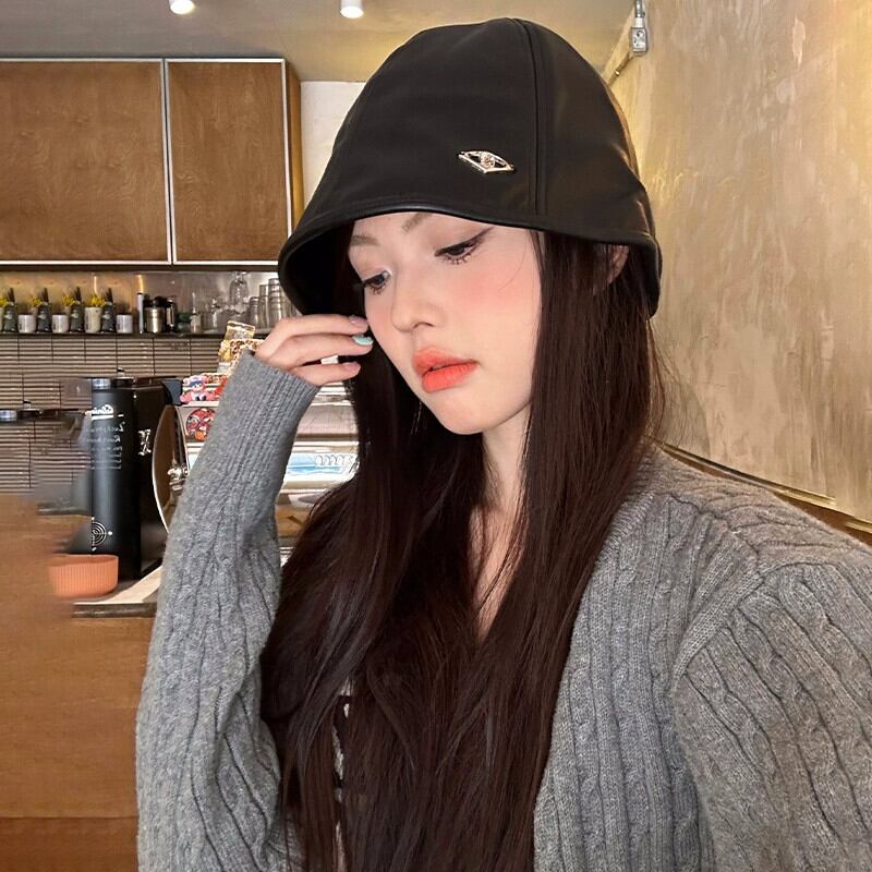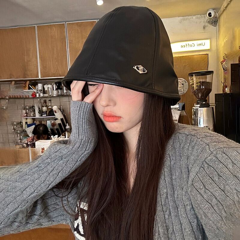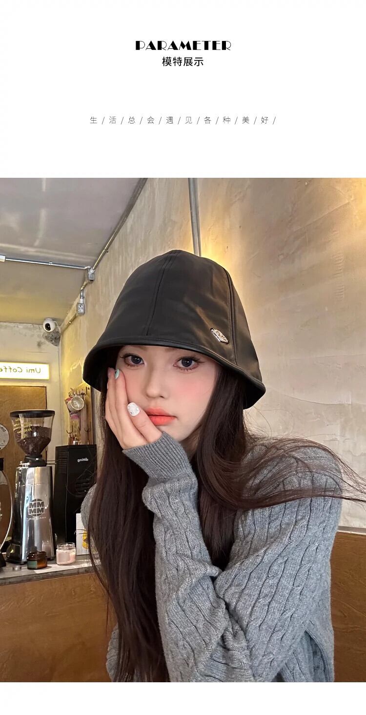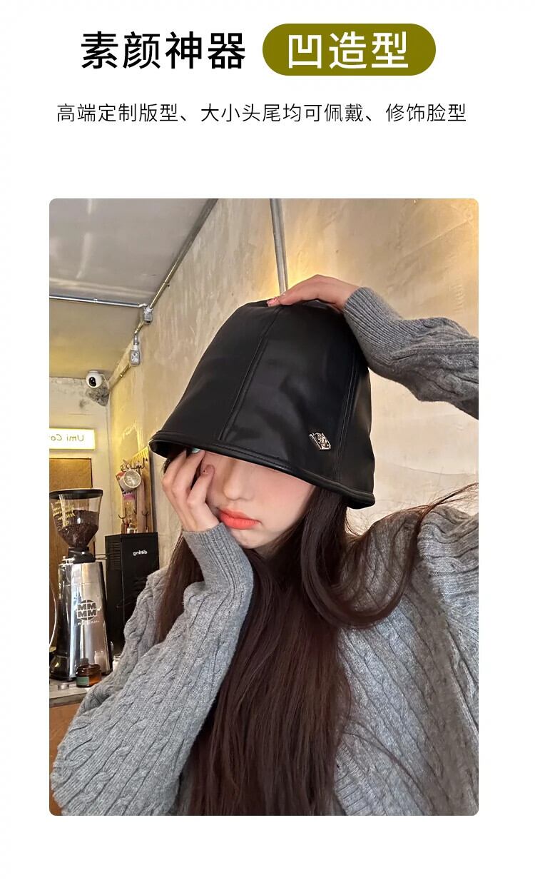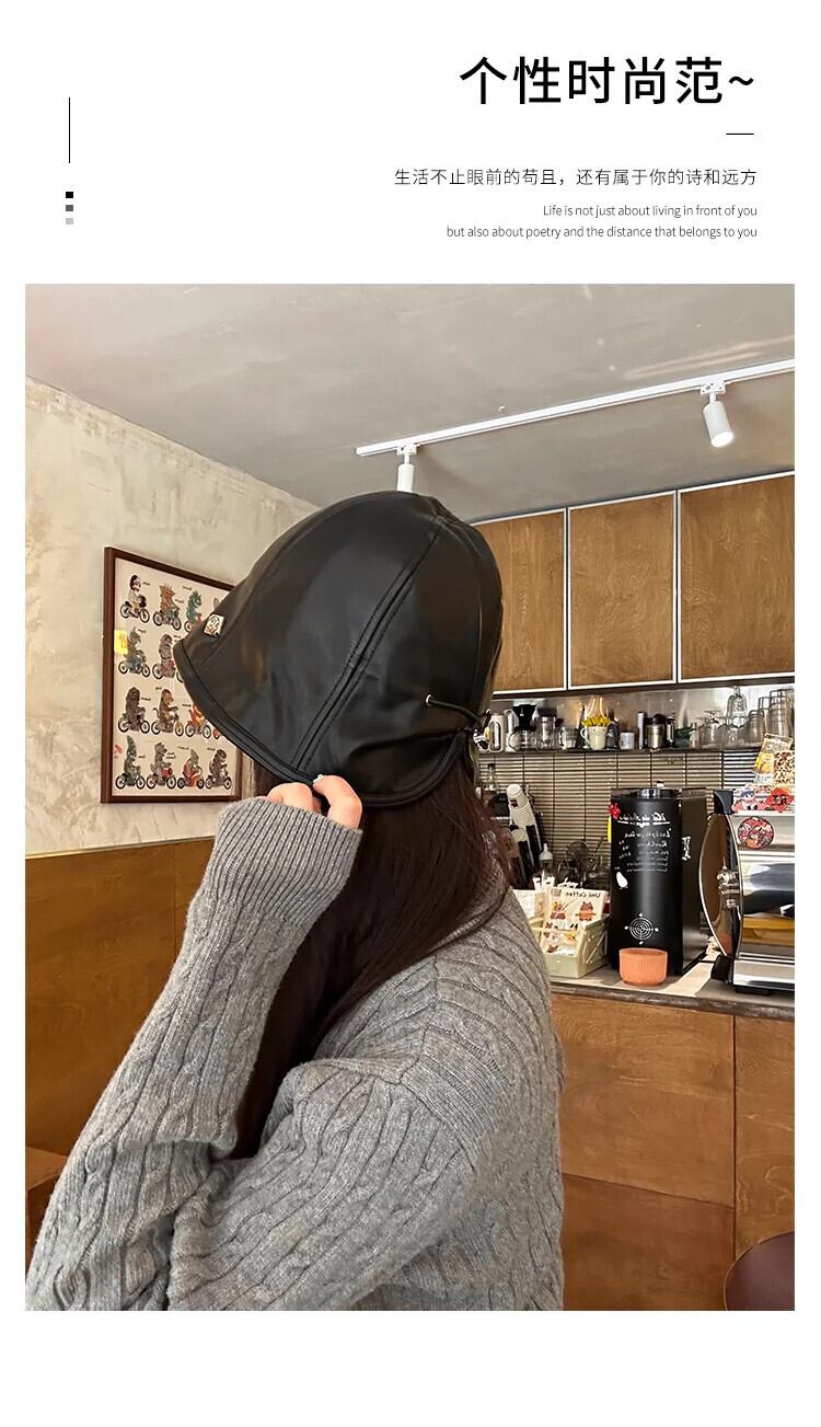 PU レザーフェイスカバーフィッシャーマンハット女性の秋と冬のニッチ個性カジュアルブラックバケットハットレザーハット顔見せ小さな盆地帽子 オータム 秋物 ウィンター 冬物 15dd31832316294